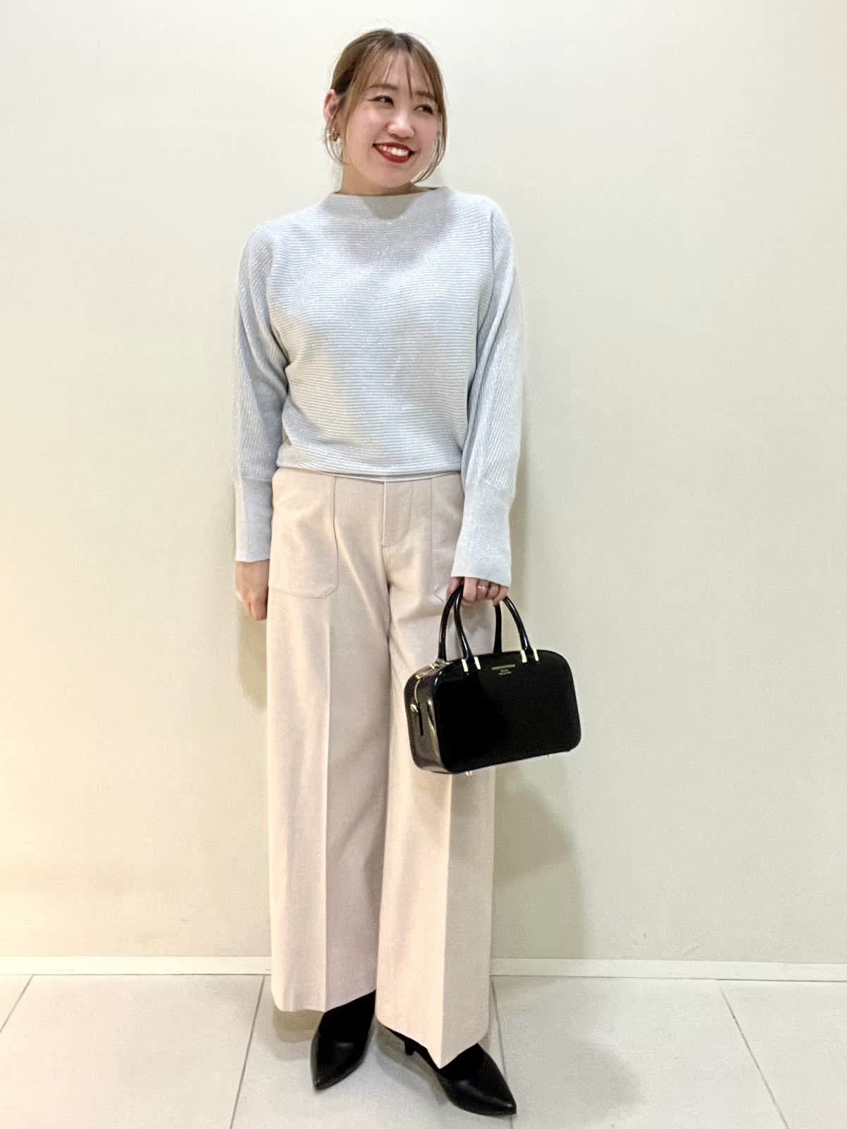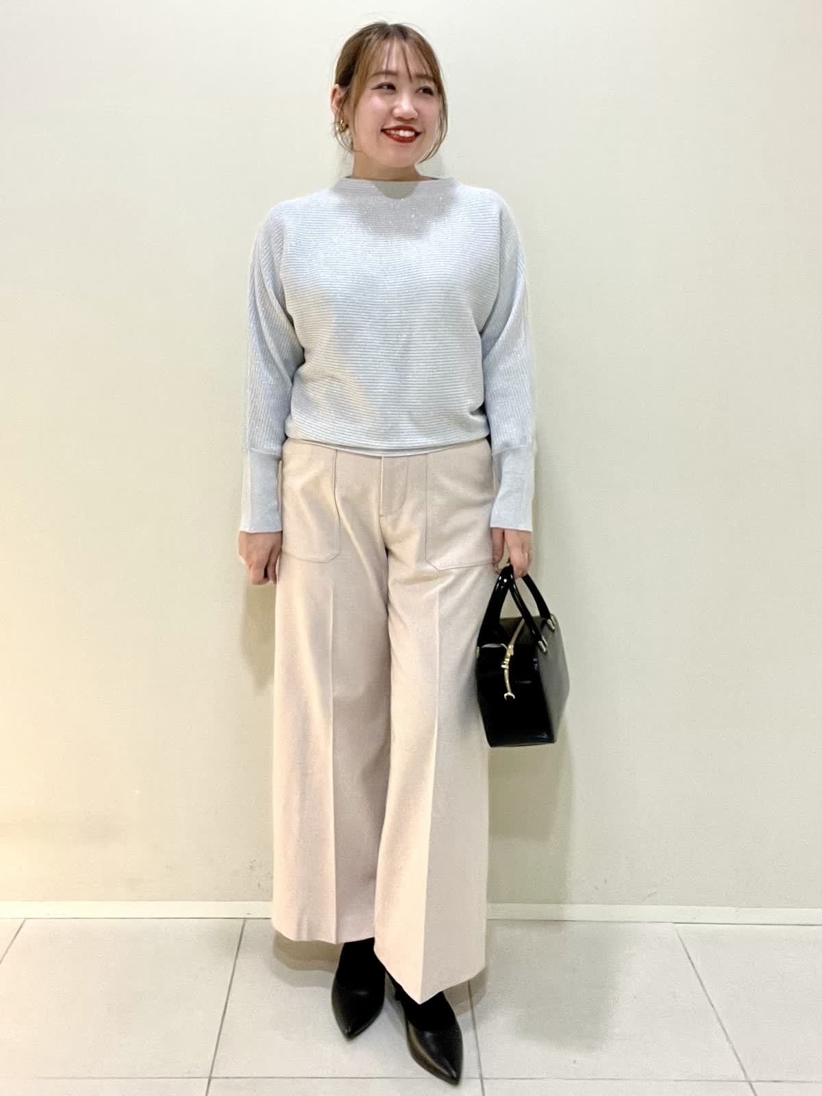 【着用サイズ】ニット:フリー パンツ:M 【着用カラー】ニット:シルバー パンツ:ベージュ 綺麗め休日コーデ。ラメのニットはドルマンで、肩や腕周りをすっきりとみせてくれます。ボトルネックで首元もお洒落です。上品なラメで綺麗めな雰囲気にしてくれ、華やかさが増します。パンツはウール混のベイカーパンツ。色がピンク味のあるベージュで優しい雰囲気に。 休日でもオフィスカジュアルでも、どちらでも使いやすいパンツです。