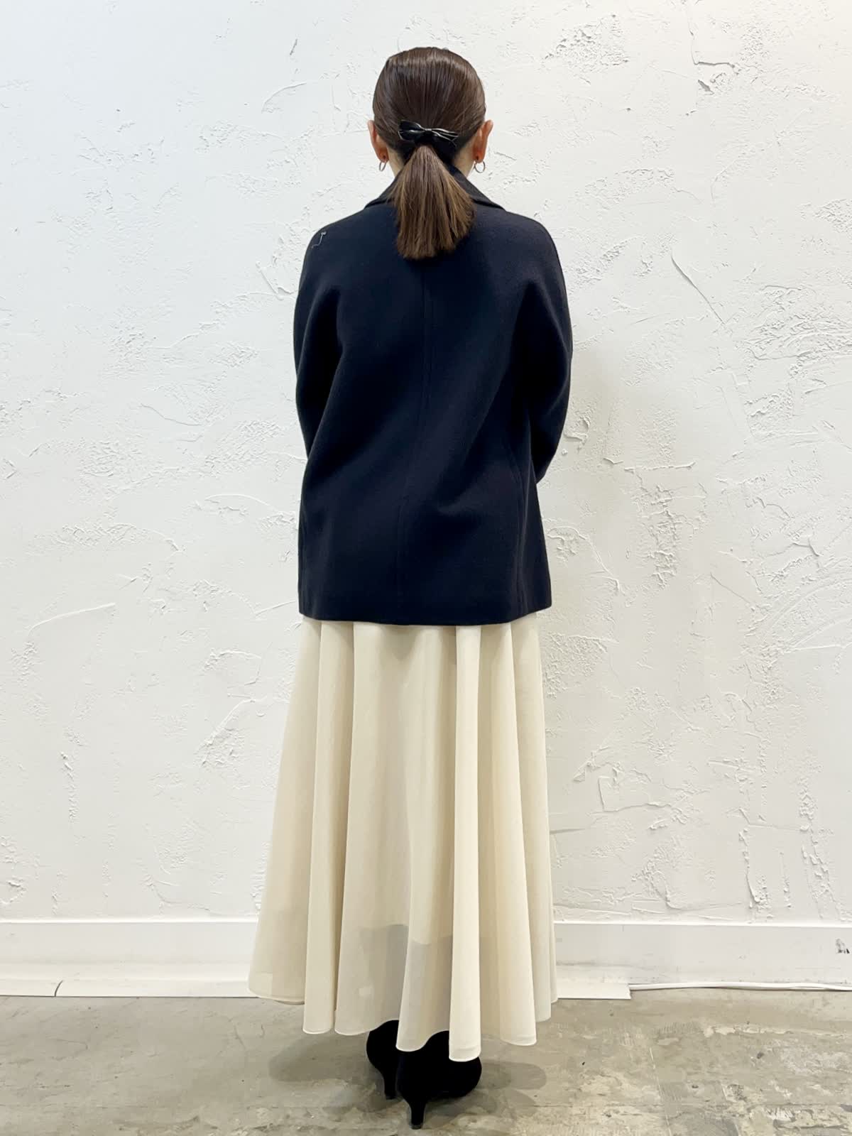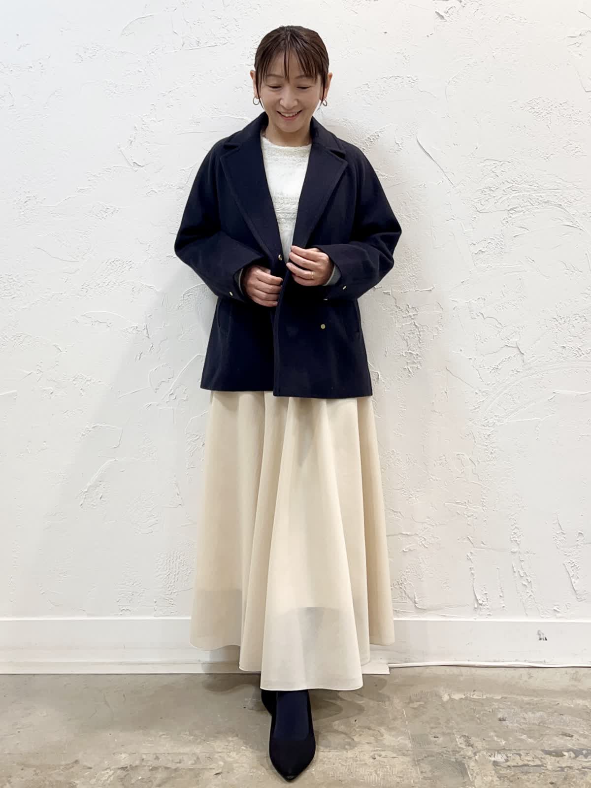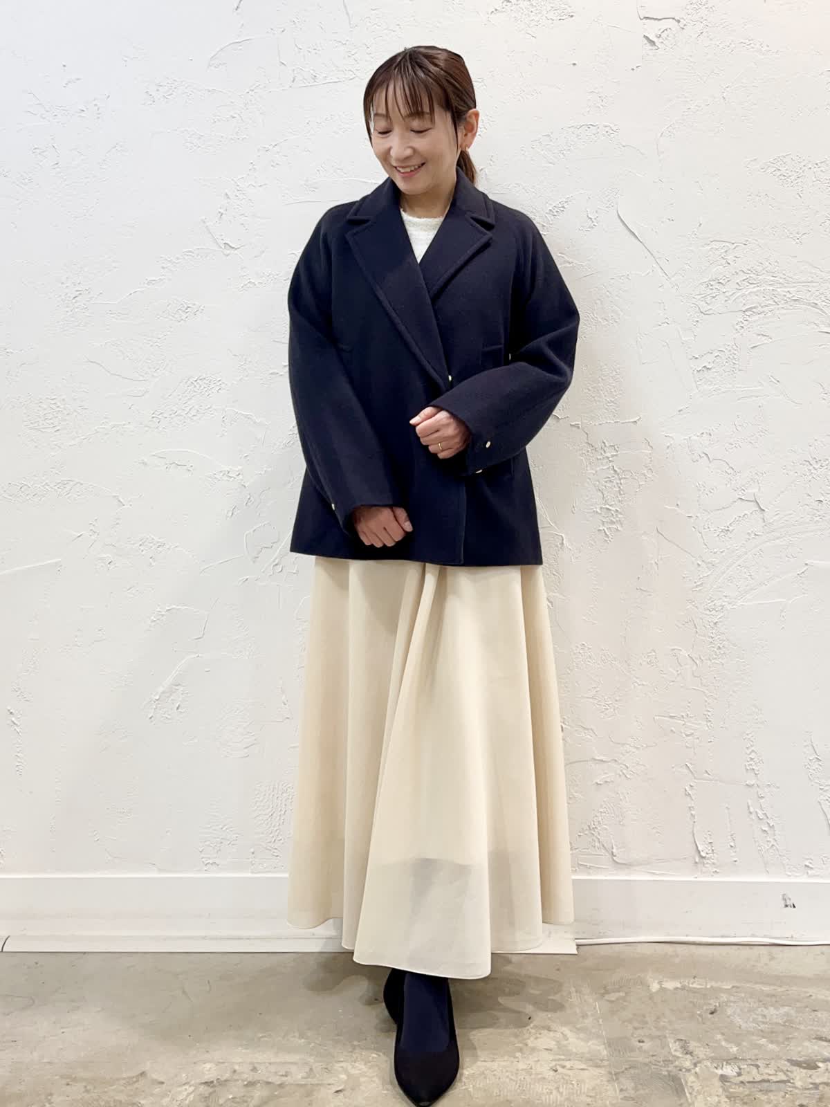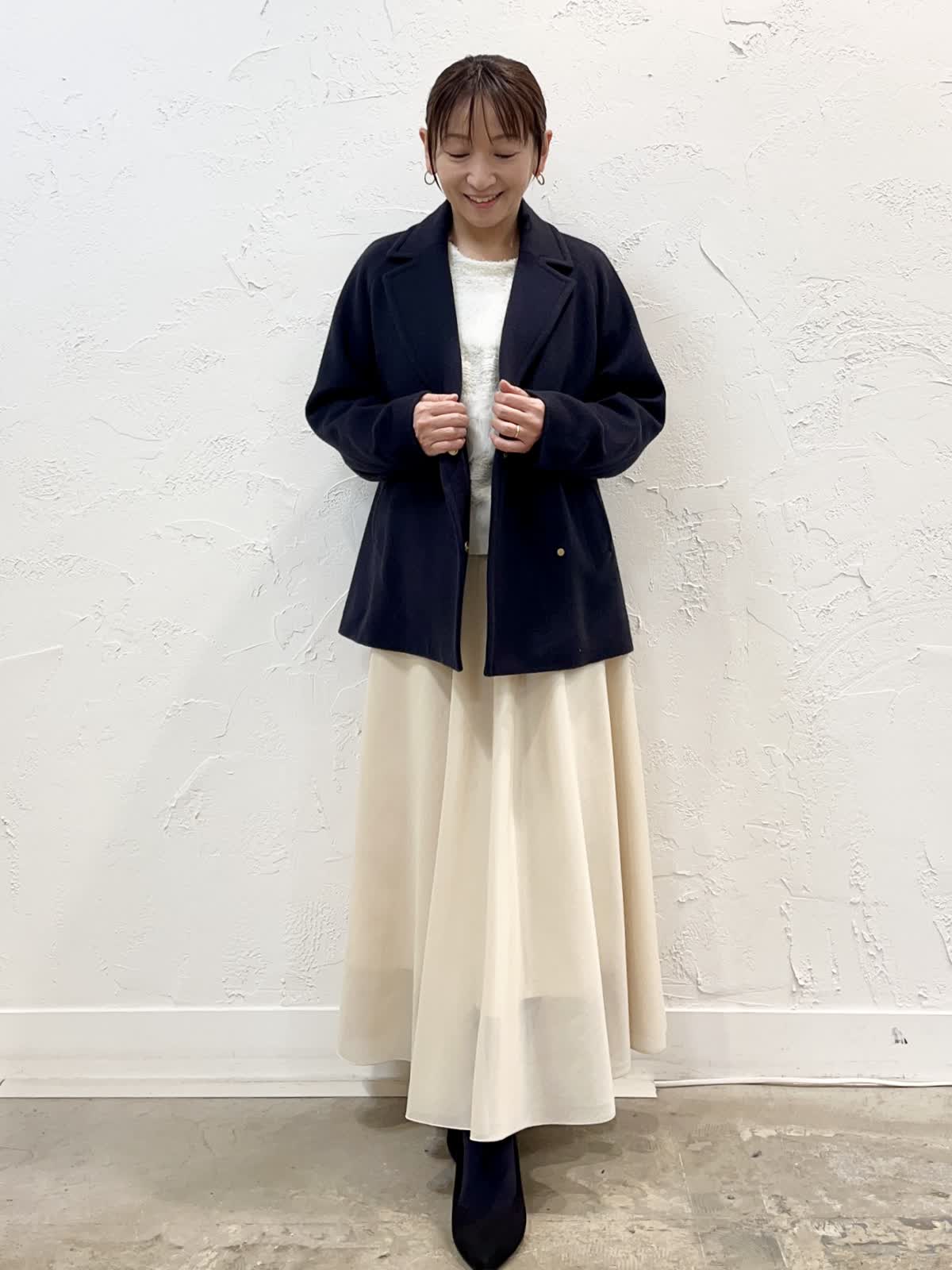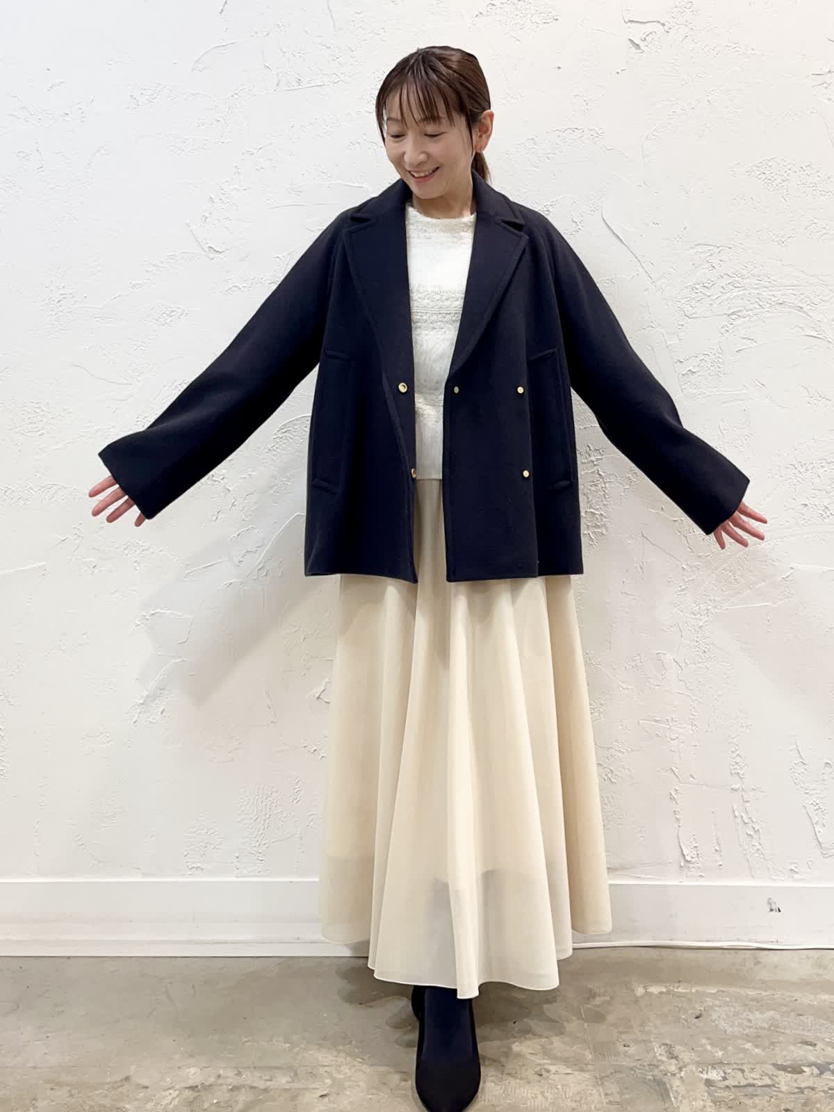 【着用サイズ/カラー】 コート:9号/チャコールグレー ニット:9号/ホワイト スカート:7号/アイボリー ショートコートのコーデ。いろいろなスタイリングに取り入れやすいショートコート。ご近所からお出かけまで様々に着こなせます。お友だちとランチする日にロングスカート合わせたスタイリングもおすすめです♪