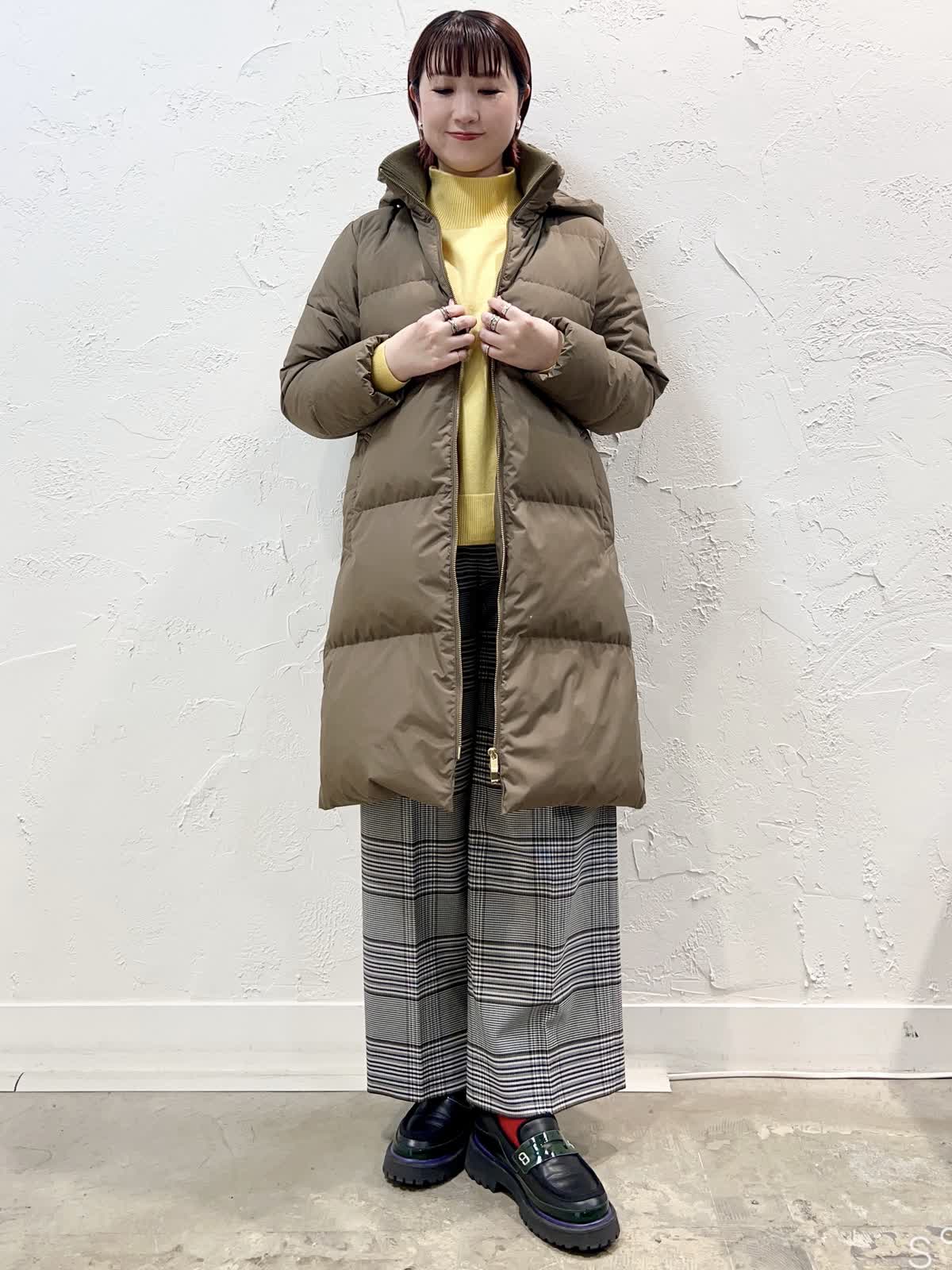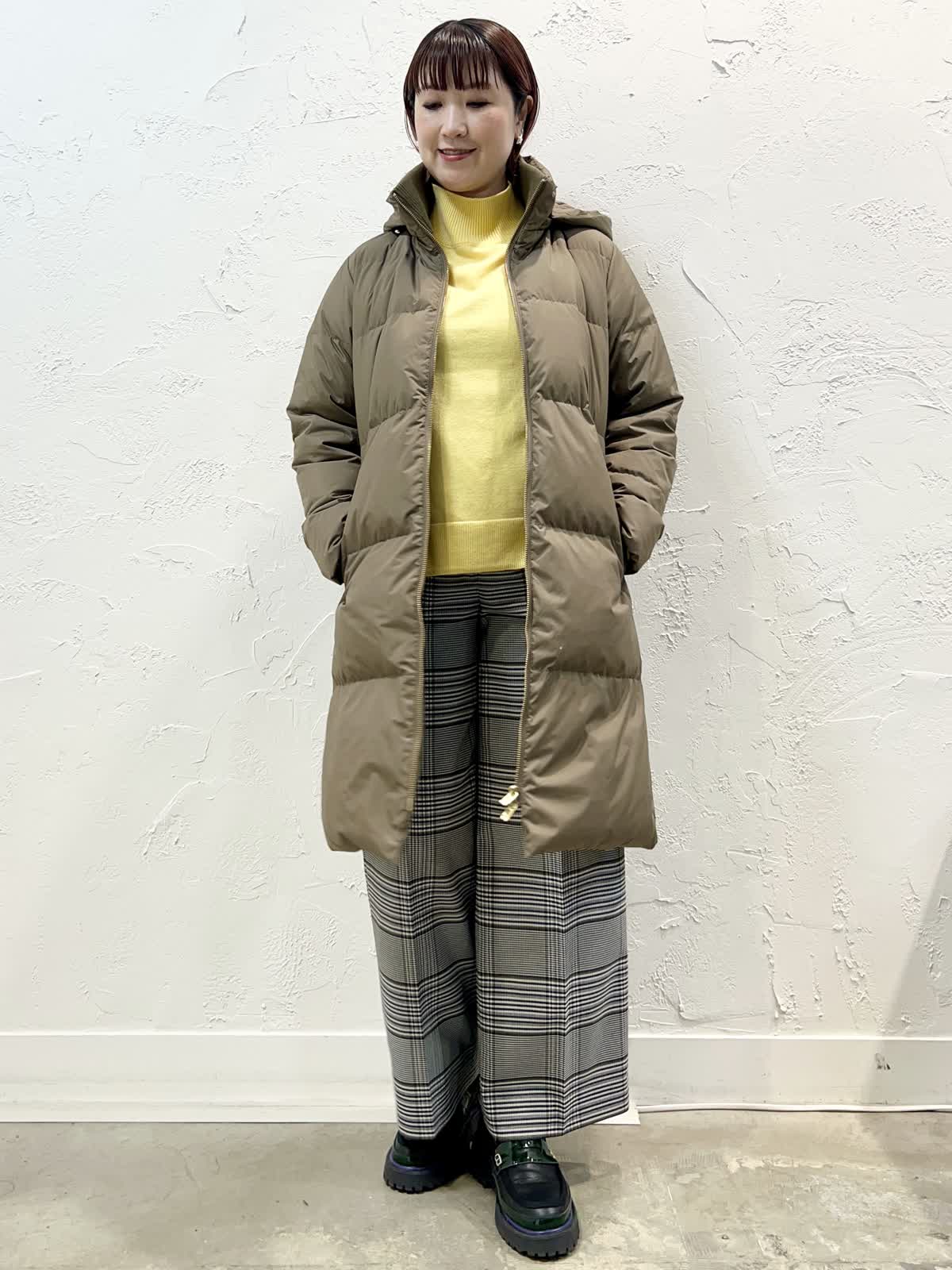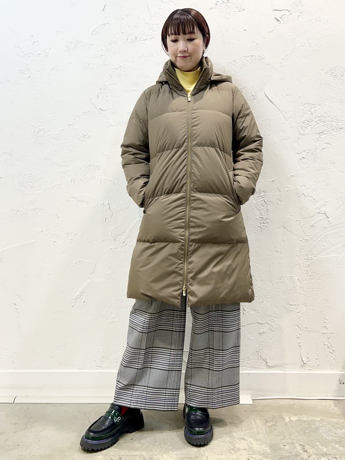 【着用サイズ/カラー】ダウン:9号/モカチャ ニット:9号/イエロー パンツ:9号/柄大 『寒がりさんはコレ!ロングダウン』 [ダウンコート]飽きのこない定番ロングダウンです。表面はとても軽く程よく光沢のある素材を使っています。襟の内側がリブになっているのでとても温かく、フードを外してもおしゃれなデザインになっています。 [ニット]ウール100%で軽く柔らかい着心地の良いニットです。程よいハイネックで温かく、やや長めの着丈で安心感があります。サイドスリットなので一枚で完成するデザインです。 [パンツ]ウール混で裏地付きのセミワイドパンツです。ウエストの後ろはゴムになっています。丈はやや短めですが、ウエストはいつものサイズで大丈夫だと思います。
