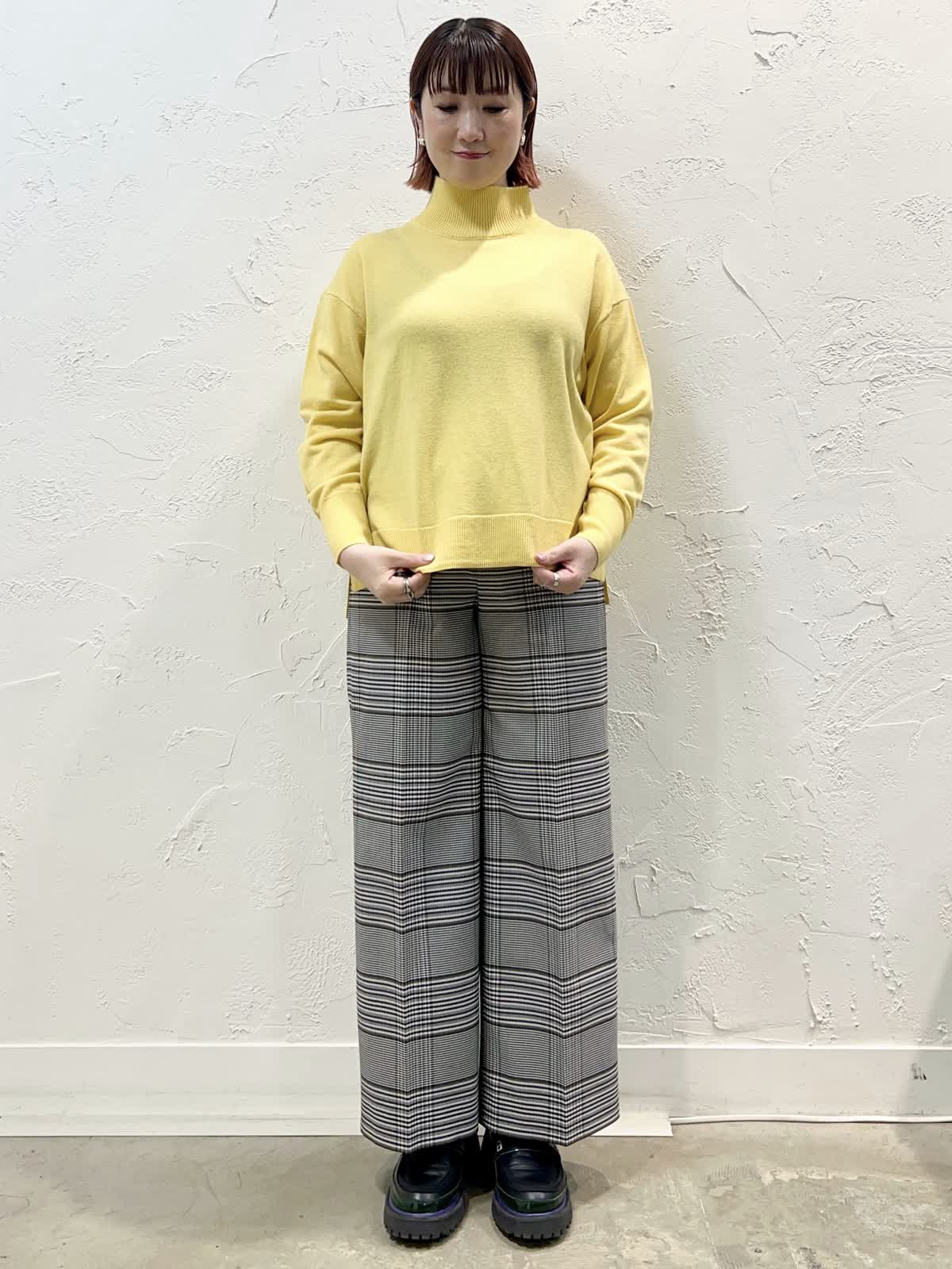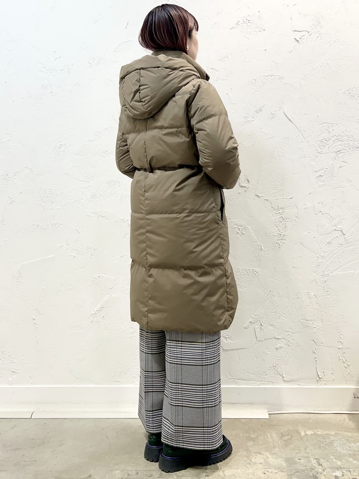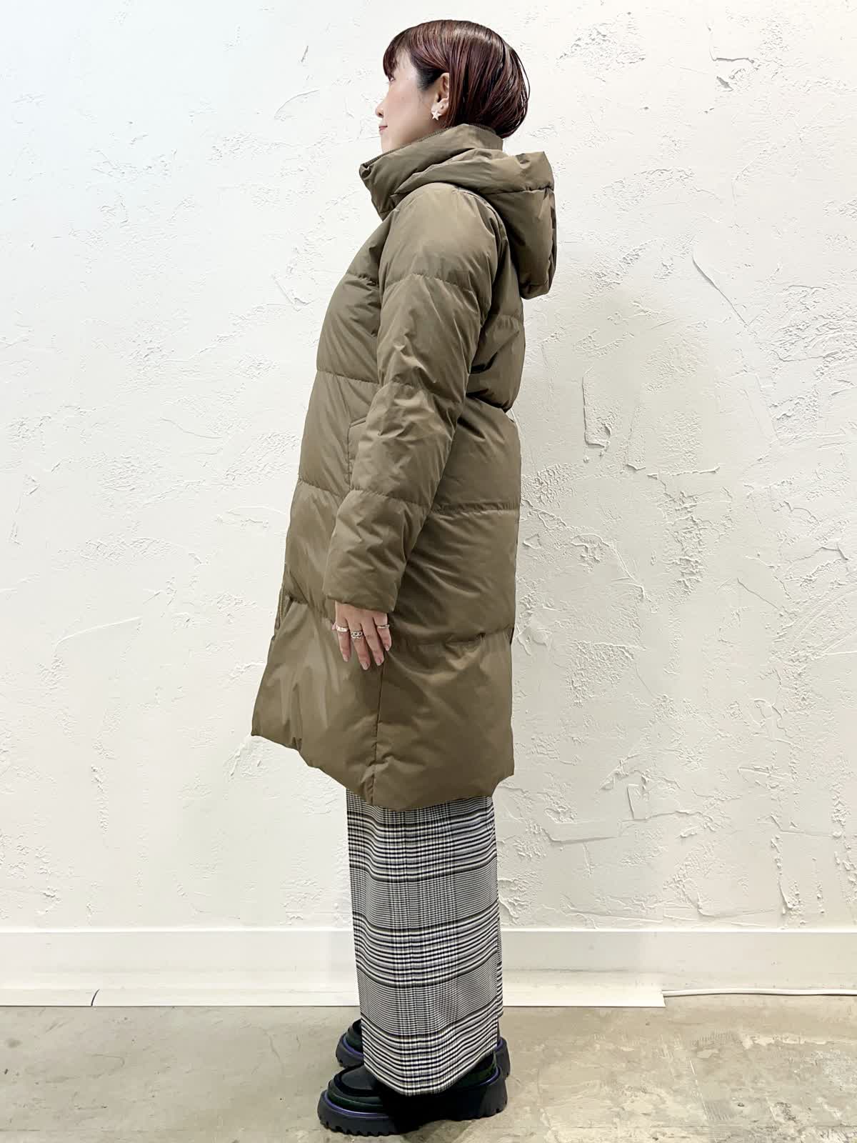 【着用サイズ/カラー】ダウン:9号/モカチャ ニット:9号/イエロー パンツ:9号/柄大 『寒がりさんはコレ!ロングダウン』 [ダウンコート]飽きのこない定番ロングダウンです。表面はとても軽く程よく光沢のある素材を使っています。襟の内側がリブになっているのでとても温かく、フードを外してもおしゃれなデザインになっています。 [ニット]ウール100%で軽く柔らかい着心地の良いニットです。程よいハイネックで温かく、やや長めの着丈で安心感があります。サイドスリットなので一枚で完成するデザインです。 [パンツ]ウール混で裏地付きのセミワイドパンツです。ウエストの後ろはゴムになっています。丈はやや短めですが、ウエストはいつものサイズで大丈夫だと思います。