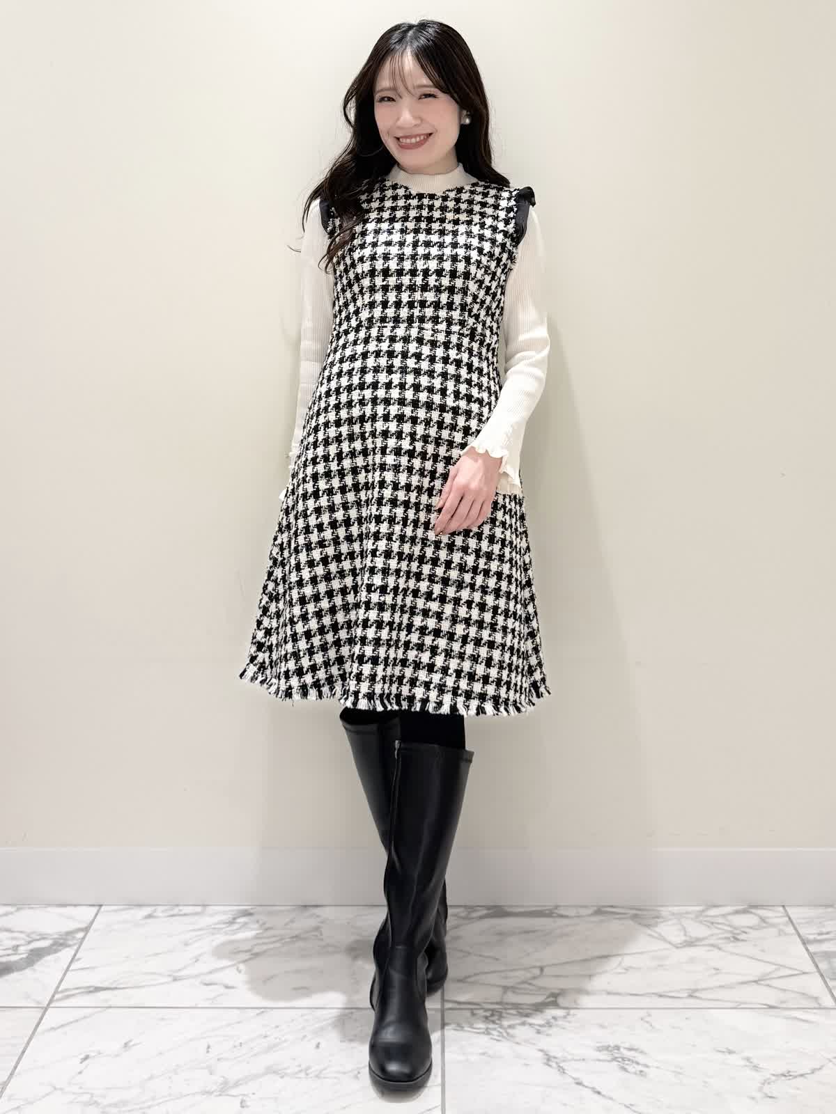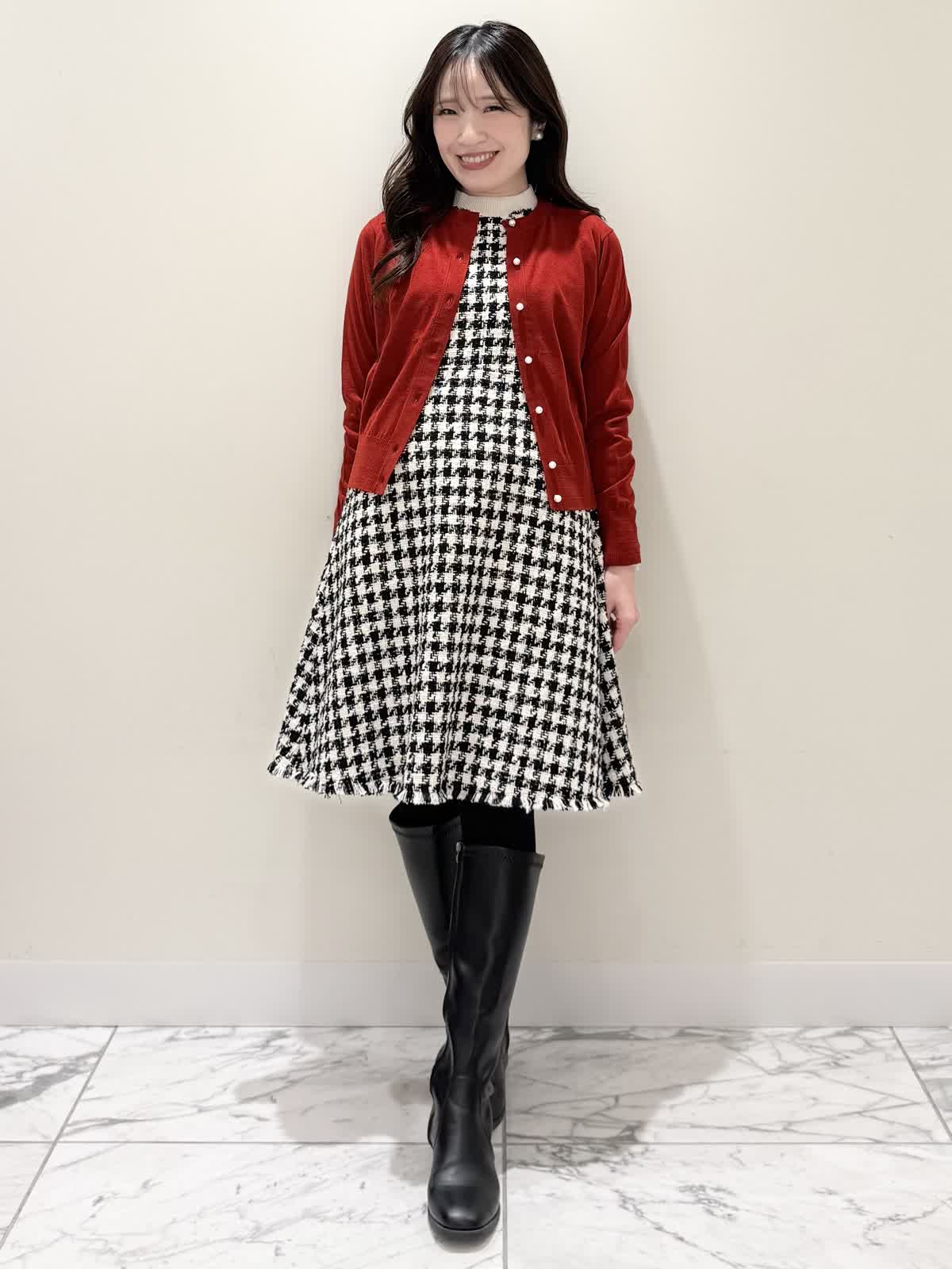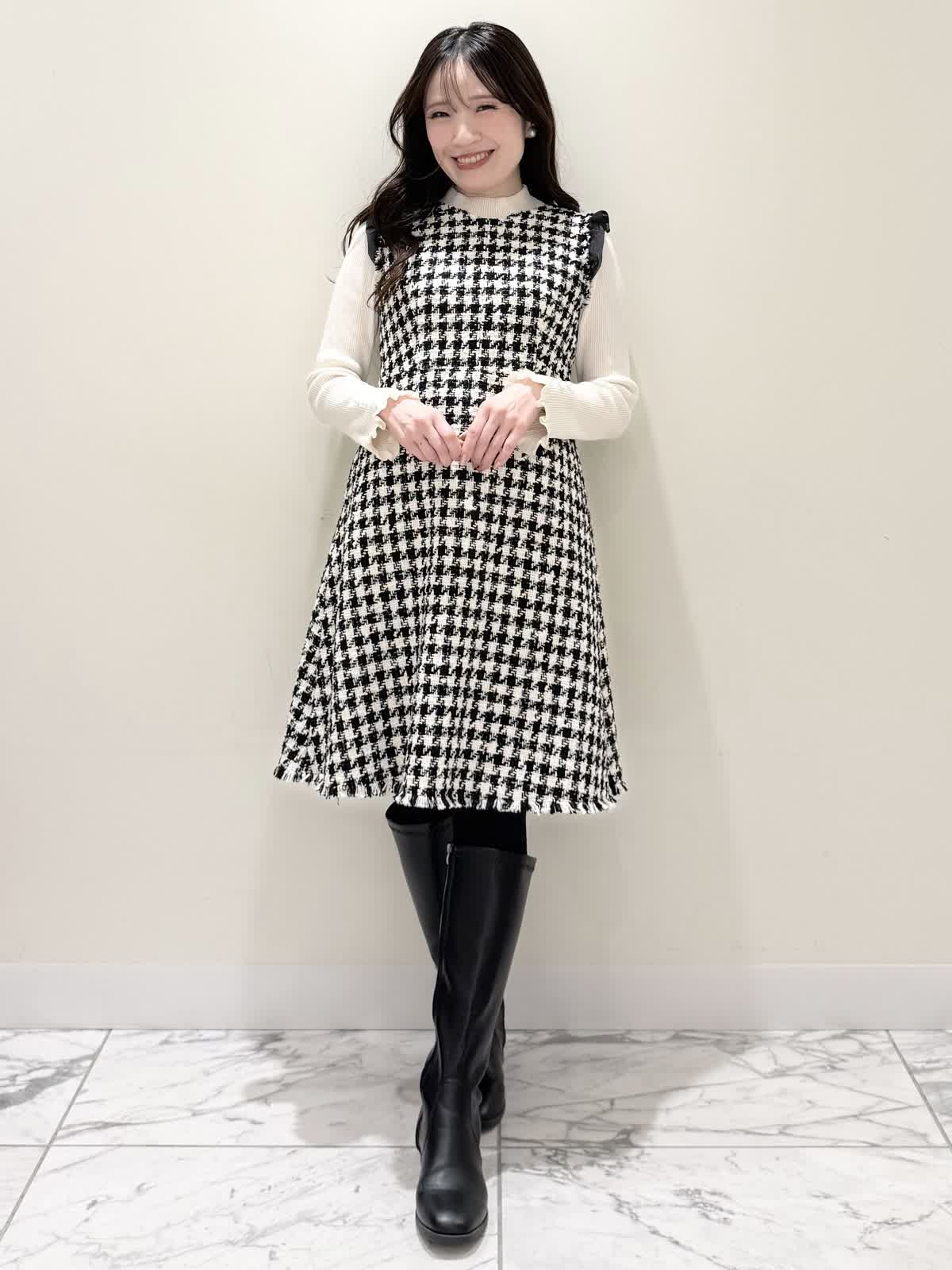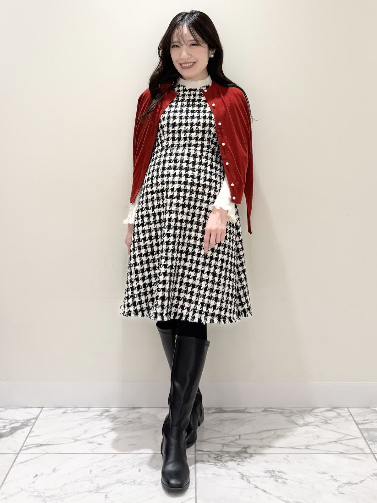 【着用サイズ/カラー】コート:7号/ブラック カーディガン:7号/レッド ワンピース:7号/チドリ ニット:9号/アイボリー モノトーンカラーで大人可愛いコーディネート♪アウターはコクーンシルエットのダブルボタンコート。ふわふわとしたウール生地で軽く羽織れ着心地◎アームホール、身頃共にゆったりシルエットなので、いつもより1サイズ小さめでも良いかと思います。チドリ柄は細かいラメ糸がキラッと光るとっても可愛いワンピース。柔らかい生地で着心地良く、新鮮な浅Vネックでヒラヒラとしたチュールがあしらわれた肩先。高め切り替えからのフレアシルエットが360℃どの角度から見ても可愛いです。長めすぎない着丈なので今年らしいロングブーツ合わせもおすすめですが、今回はタイツにロングブーツを合わせてみました。いつもは5号ですが、今回は7号着用。大きすぎないのでインナーにリブニットを合わせて着るといつもより1サイズ大きめでも◯ジャストがお好きな方はいつものサイズで◯合わせのノンウールのリブニットのアイボリーカラーを合わせました。柔らかいリブが身体のラインを拾いすぎず、肌あたり良く着心地◎首にややかかるネックでタートルやウール生地が苦手な方におすすめです。寒さ対策で薄手のカラーのカーディガンを羽織ってもおすすめです。