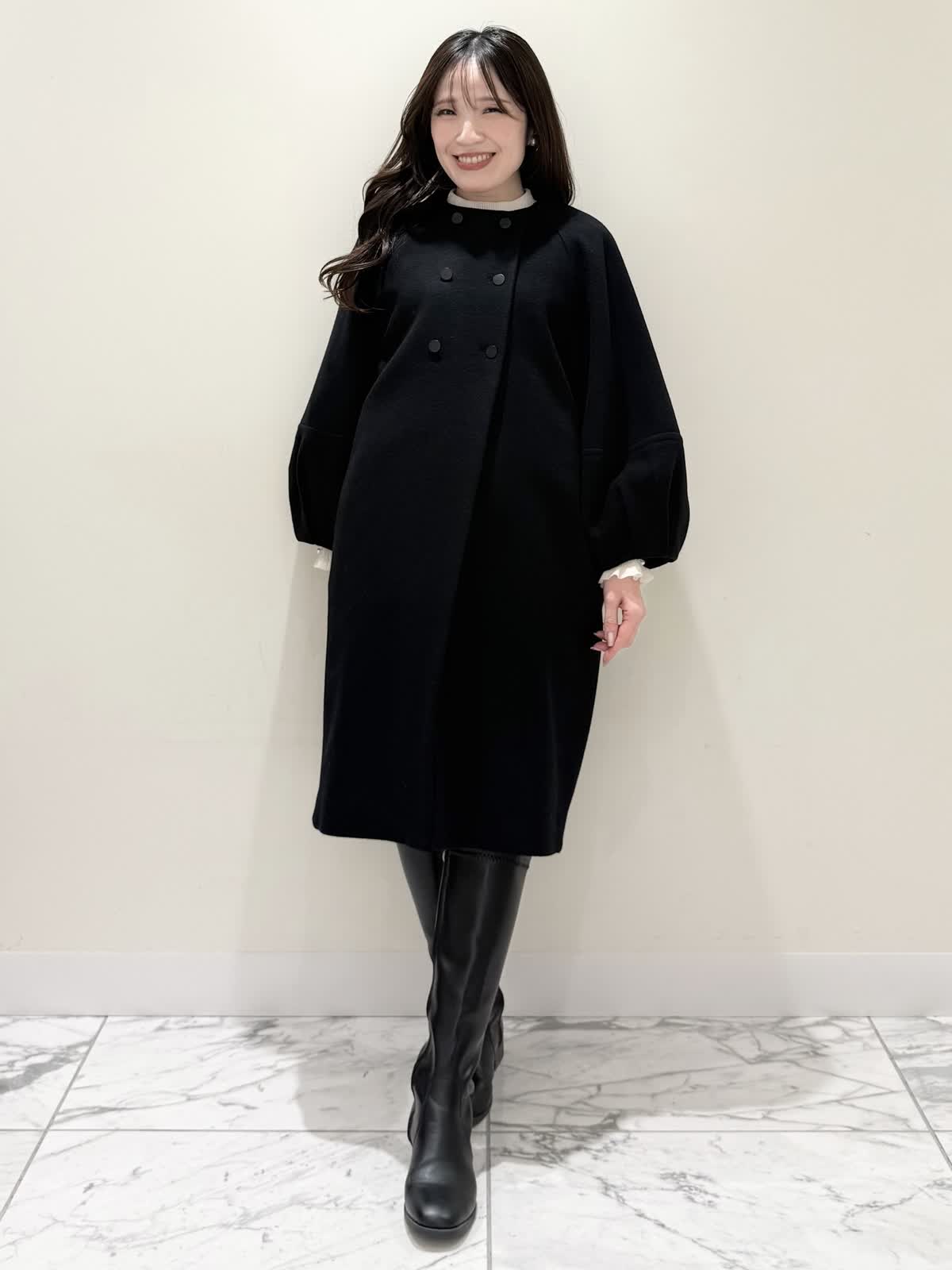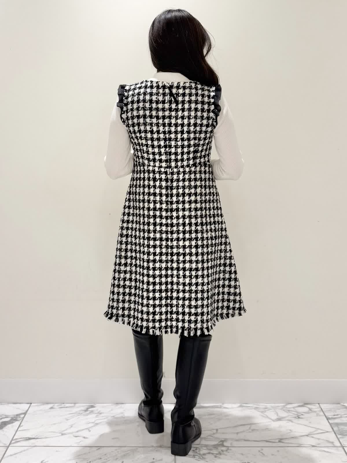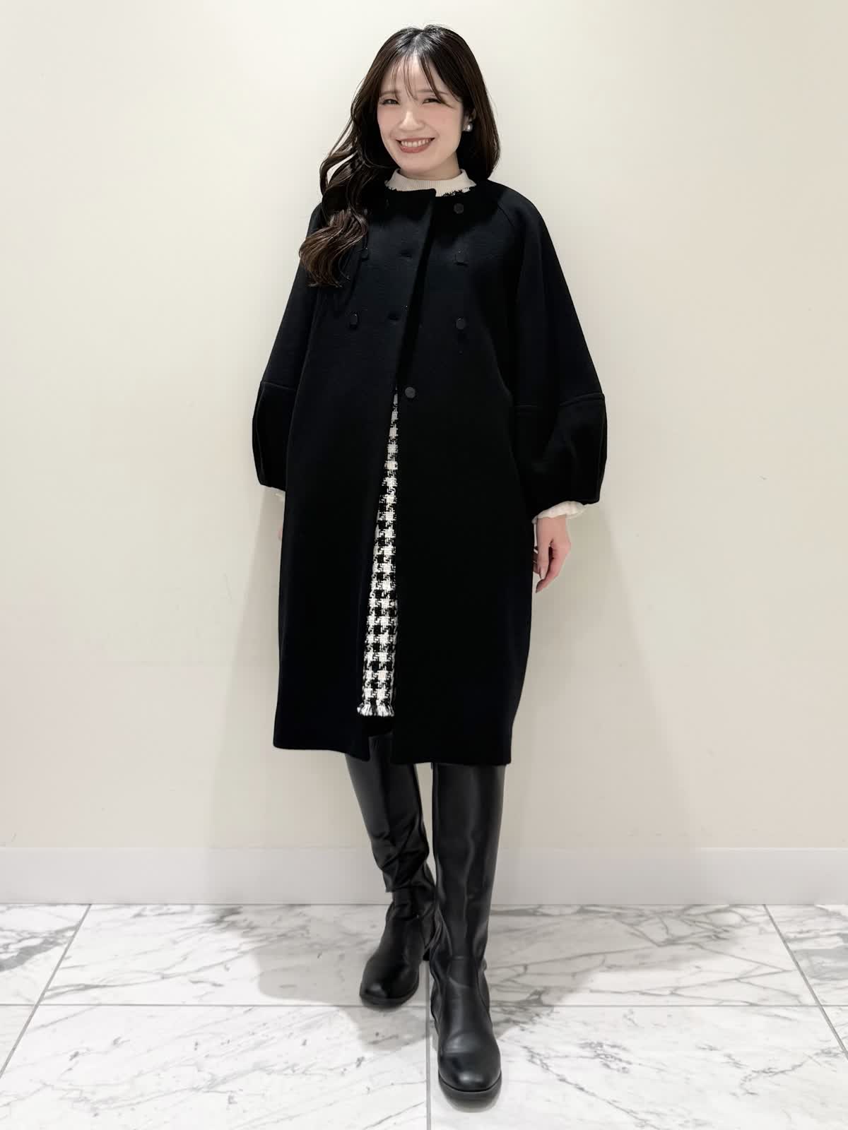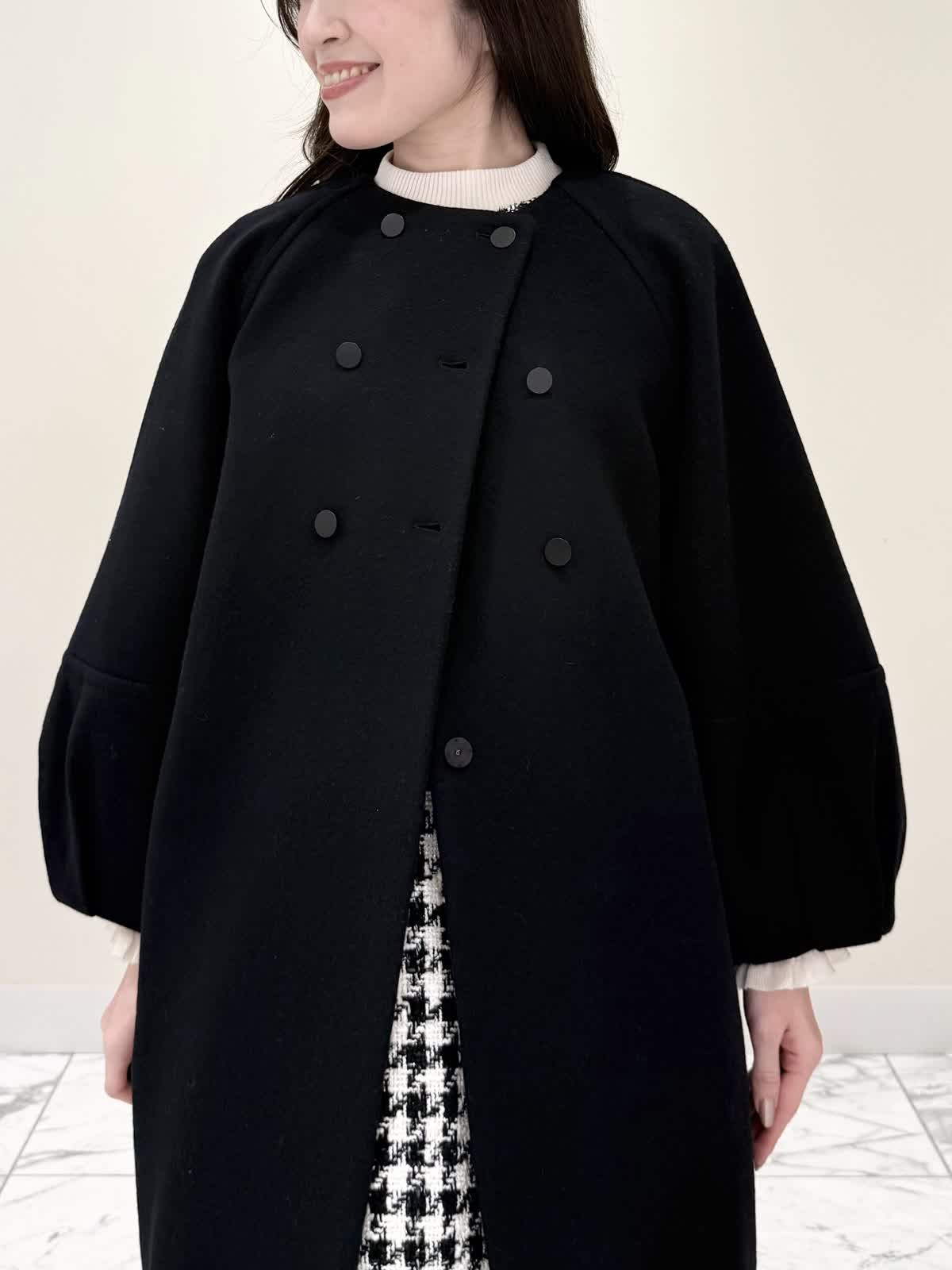 【着用サイズ/カラー】コート:7号/ブラック カーディガン:7号/レッド ワンピース:7号/チドリ ニット:9号/アイボリー モノトーンカラーで大人可愛いコーディネート♪アウターはコクーンシルエットのダブルボタンコート。ふわふわとしたウール生地で軽く羽織れ着心地◎アームホール、身頃共にゆったりシルエットなので、いつもより1サイズ小さめでも良いかと思います。チドリ柄は細かいラメ糸がキラッと光るとっても可愛いワンピース。柔らかい生地で着心地良く、新鮮な浅Vネックでヒラヒラとしたチュールがあしらわれた肩先。高め切り替えからのフレアシルエットが360℃どの角度から見ても可愛いです。長めすぎない着丈なので今年らしいロングブーツ合わせもおすすめですが、今回はタイツにロングブーツを合わせてみました。いつもは5号ですが、今回は7号着用。大きすぎないのでインナーにリブニットを合わせて着るといつもより1サイズ大きめでも◯ジャストがお好きな方はいつものサイズで◯合わせのノンウールのリブニットのアイボリーカラーを合わせました。柔らかいリブが身体のラインを拾いすぎず、肌あたり良く着心地◎首にややかかるネックでタートルやウール生地が苦手な方におすすめです。寒さ対策で薄手のカラーのカーディガンを羽織ってもおすすめです。