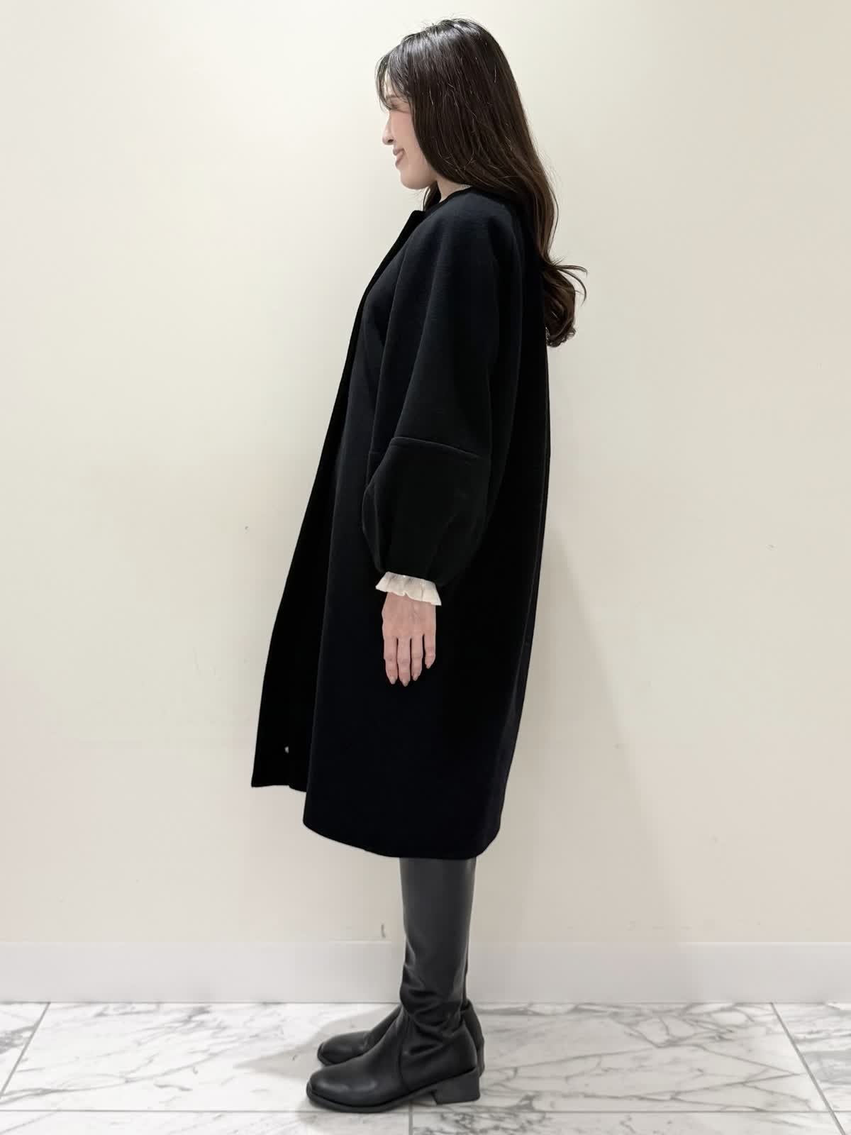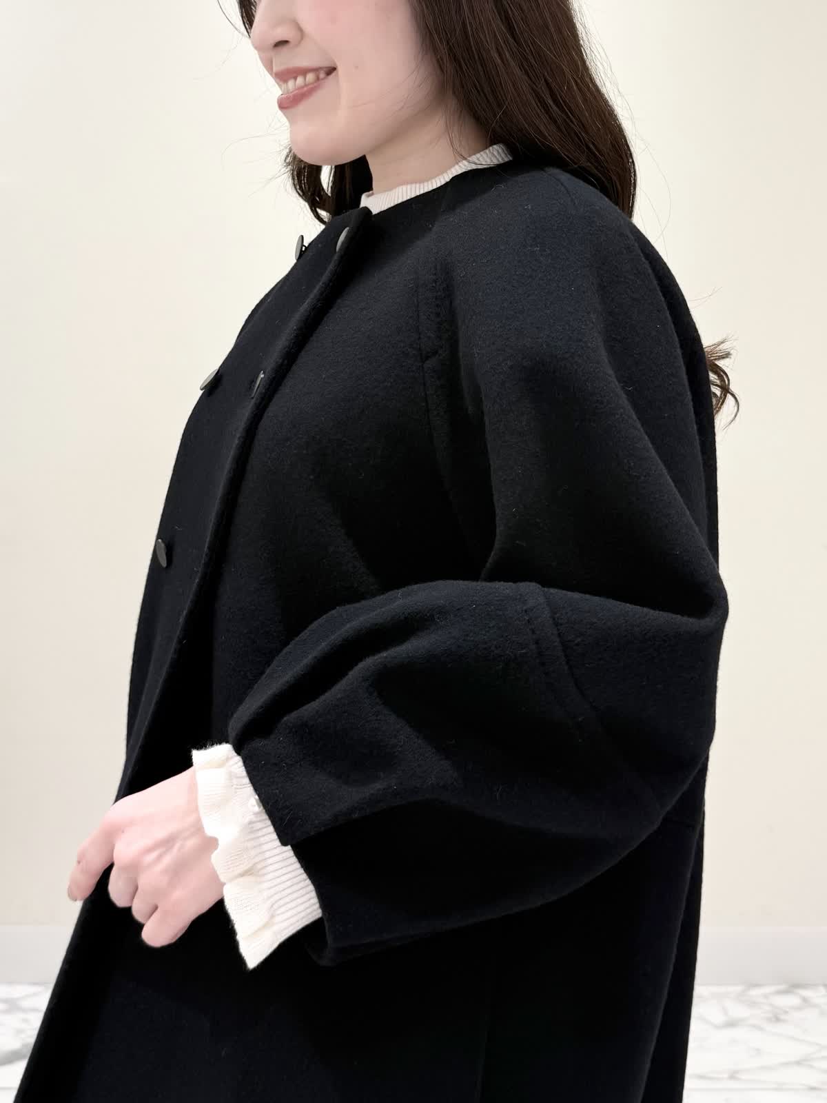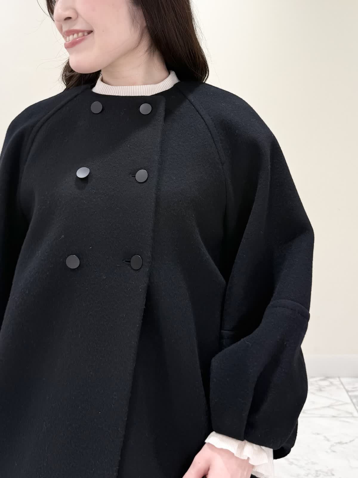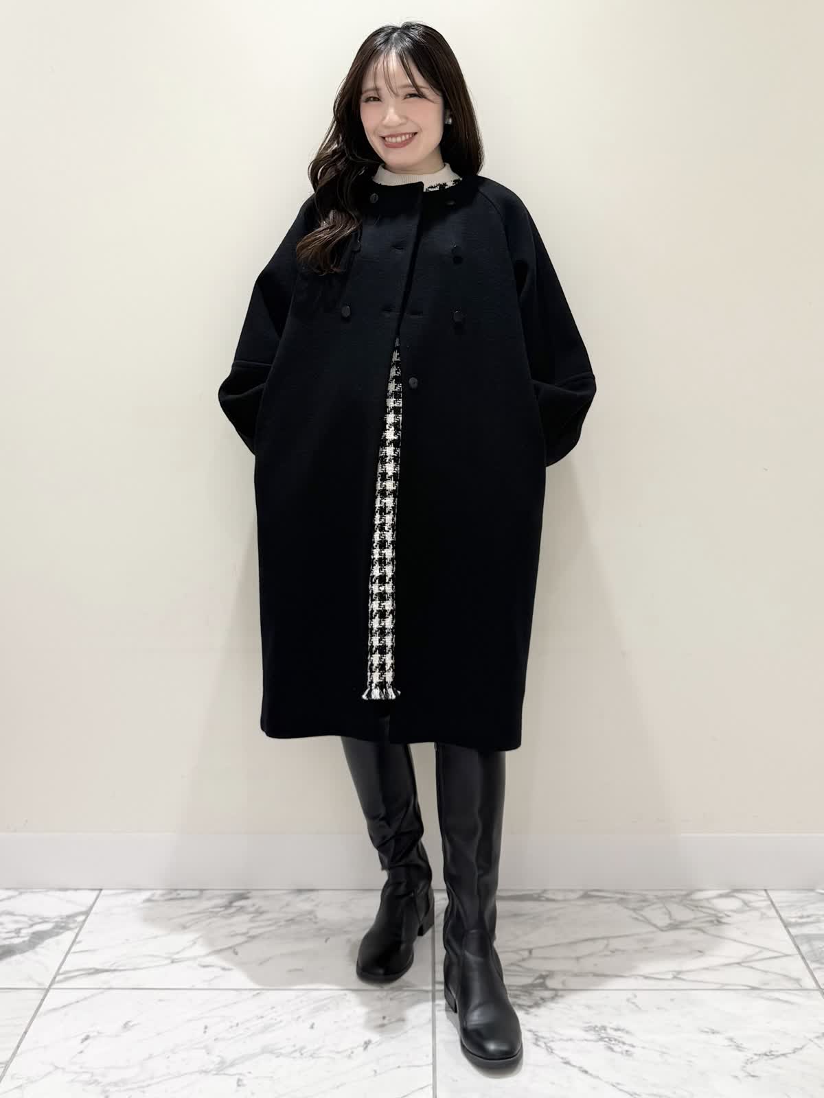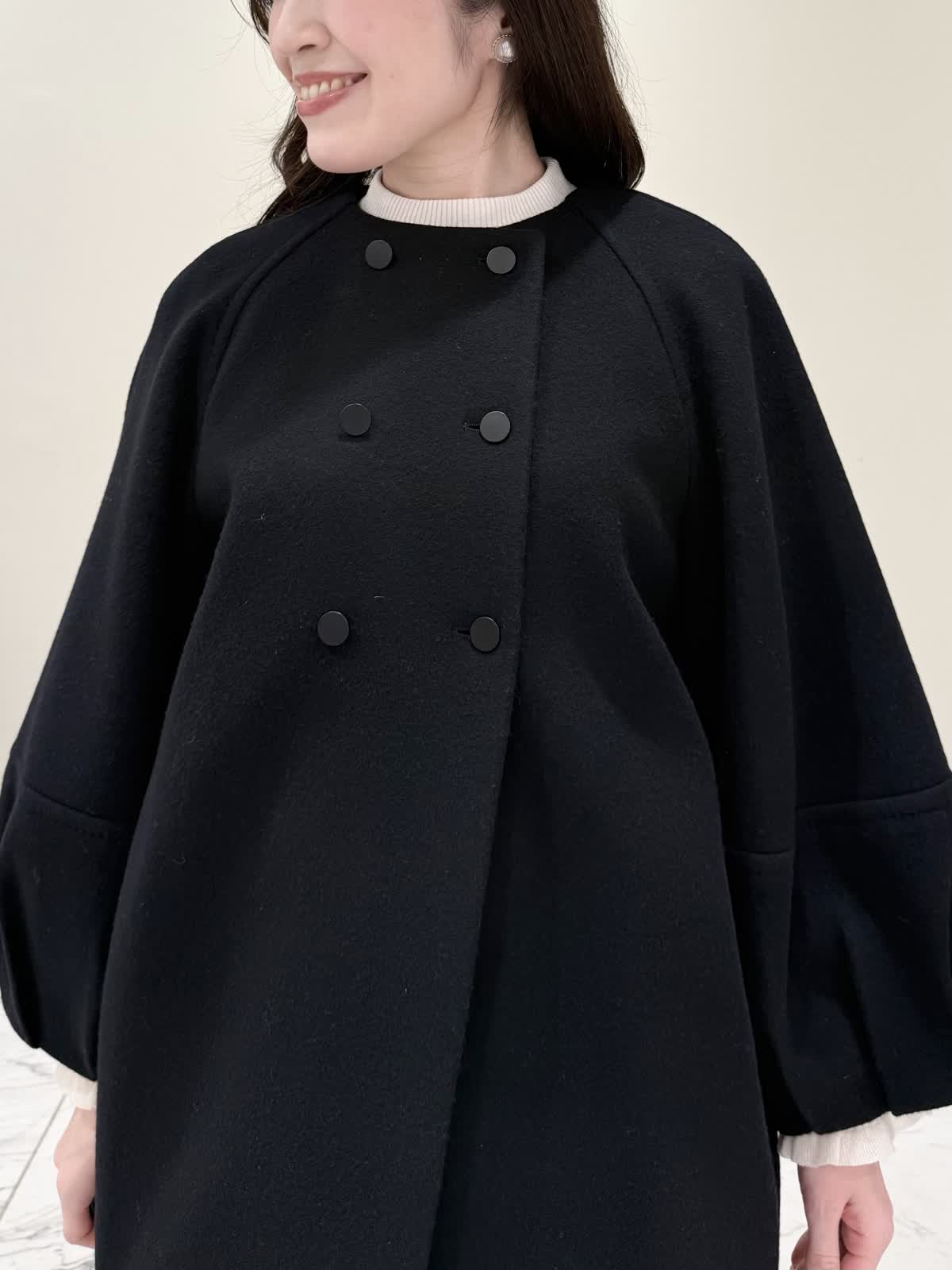 【着用サイズ/カラー】コート:7号/ブラック カーディガン:7号/レッド ワンピース:7号/チドリ ニット:9号/アイボリー モノトーンカラーで大人可愛いコーディネート♪アウターはコクーンシルエットのダブルボタンコート。ふわふわとしたウール生地で軽く羽織れ着心地◎アームホール、身頃共にゆったりシルエットなので、いつもより1サイズ小さめでも良いかと思います。チドリ柄は細かいラメ糸がキラッと光るとっても可愛いワンピース。柔らかい生地で着心地良く、新鮮な浅Vネックでヒラヒラとしたチュールがあしらわれた肩先。高め切り替えからのフレアシルエットが360℃どの角度から見ても可愛いです。長めすぎない着丈なので今年らしいロングブーツ合わせもおすすめですが、今回はタイツにロングブーツを合わせてみました。いつもは5号ですが、今回は7号着用。大きすぎないのでインナーにリブニットを合わせて着るといつもより1サイズ大きめでも◯ジャストがお好きな方はいつものサイズで◯合わせのノンウールのリブニットのアイボリーカラーを合わせました。柔らかいリブが身体のラインを拾いすぎず、肌あたり良く着心地◎首にややかかるネックでタートルやウール生地が苦手な方におすすめです。寒さ対策で薄手のカラーのカーディガンを羽織ってもおすすめです。