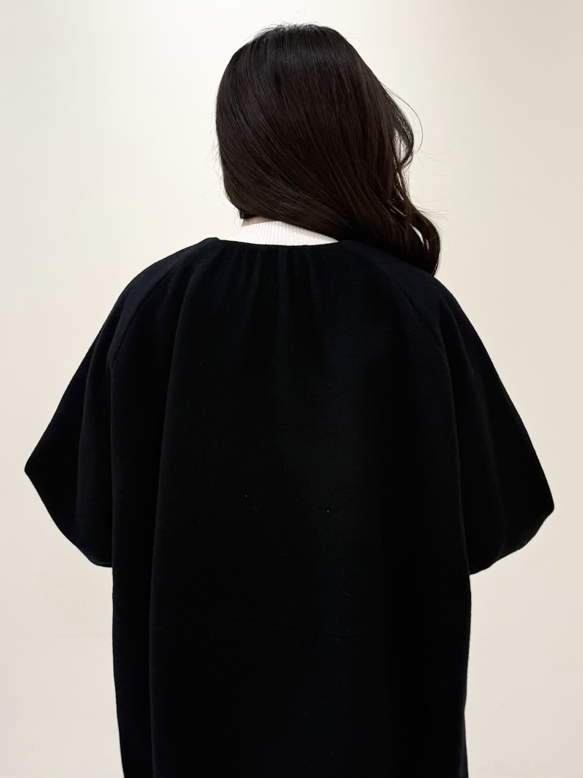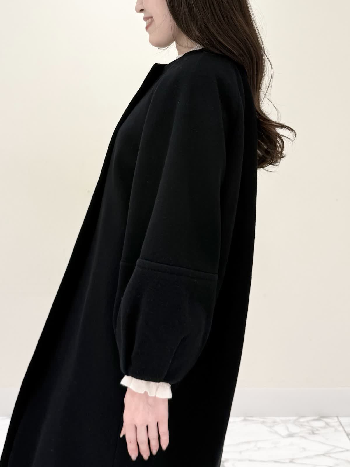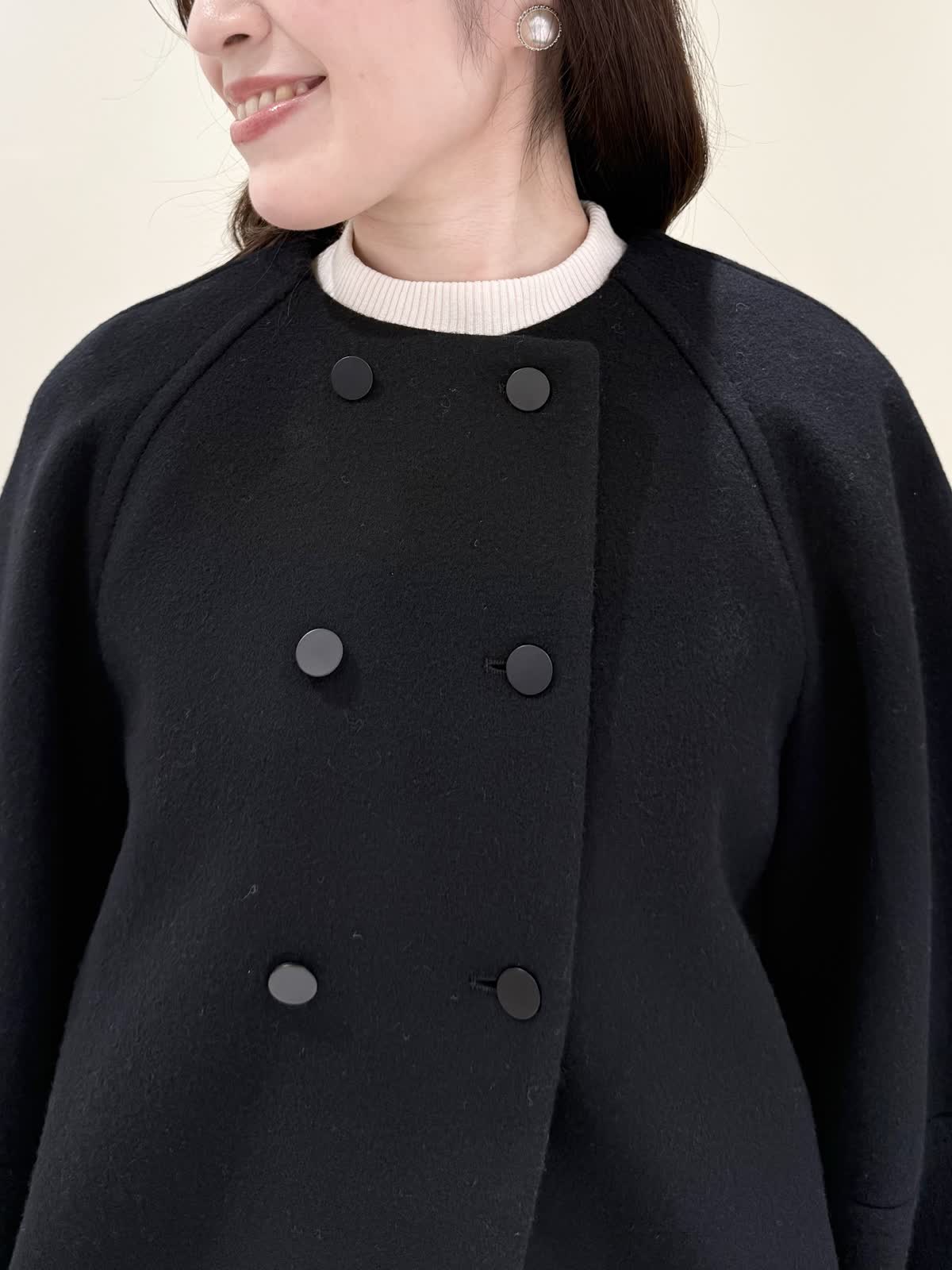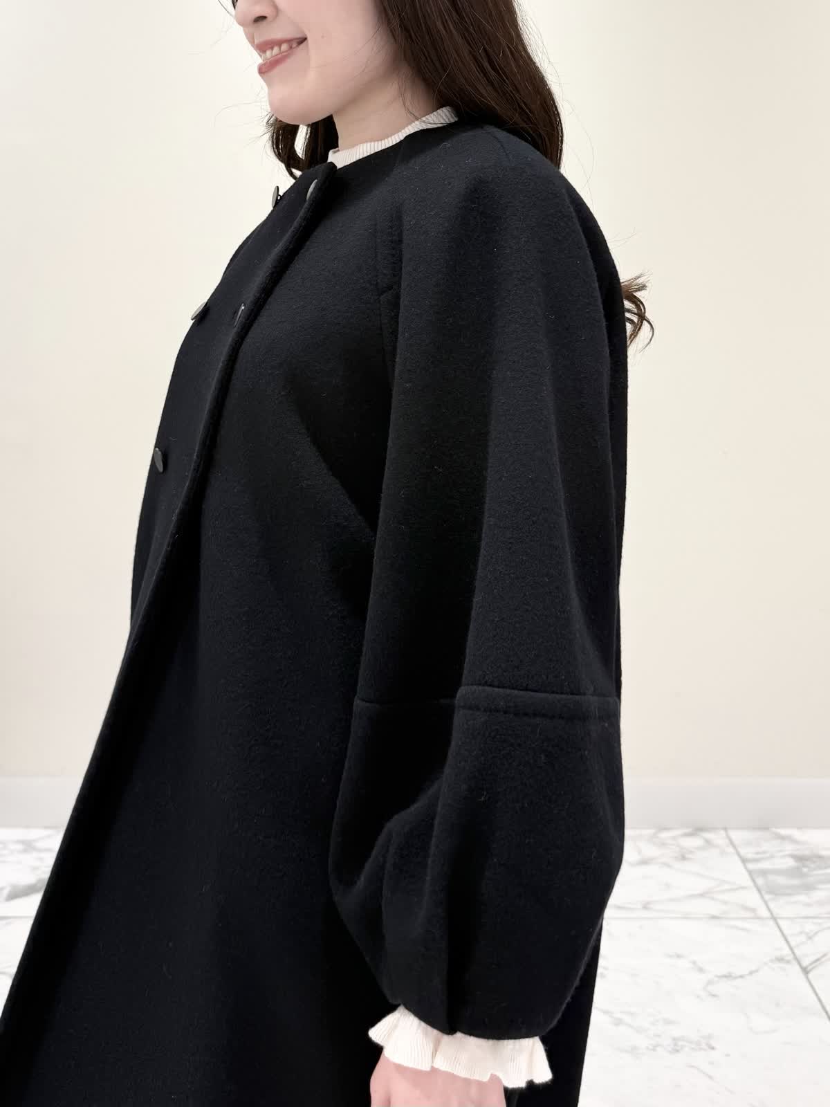 【着用サイズ/カラー】コート:7号/ブラック カーディガン:7号/レッド ワンピース:7号/チドリ ニット:9号/アイボリー モノトーンカラーで大人可愛いコーディネート♪アウターはコクーンシルエットのダブルボタンコート。ふわふわとしたウール生地で軽く羽織れ着心地◎アームホール、身頃共にゆったりシルエットなので、いつもより1サイズ小さめでも良いかと思います。チドリ柄は細かいラメ糸がキラッと光るとっても可愛いワンピース。柔らかい生地で着心地良く、新鮮な浅Vネックでヒラヒラとしたチュールがあしらわれた肩先。高め切り替えからのフレアシルエットが360℃どの角度から見ても可愛いです。長めすぎない着丈なので今年らしいロングブーツ合わせもおすすめですが、今回はタイツにロングブーツを合わせてみました。いつもは5号ですが、今回は7号着用。大きすぎないのでインナーにリブニットを合わせて着るといつもより1サイズ大きめでも◯ジャストがお好きな方はいつものサイズで◯合わせのノンウールのリブニットのアイボリーカラーを合わせました。柔らかいリブが身体のラインを拾いすぎず、肌あたり良く着心地◎首にややかかるネックでタートルやウール生地が苦手な方におすすめです。寒さ対策で薄手のカラーのカーディガンを羽織ってもおすすめです。