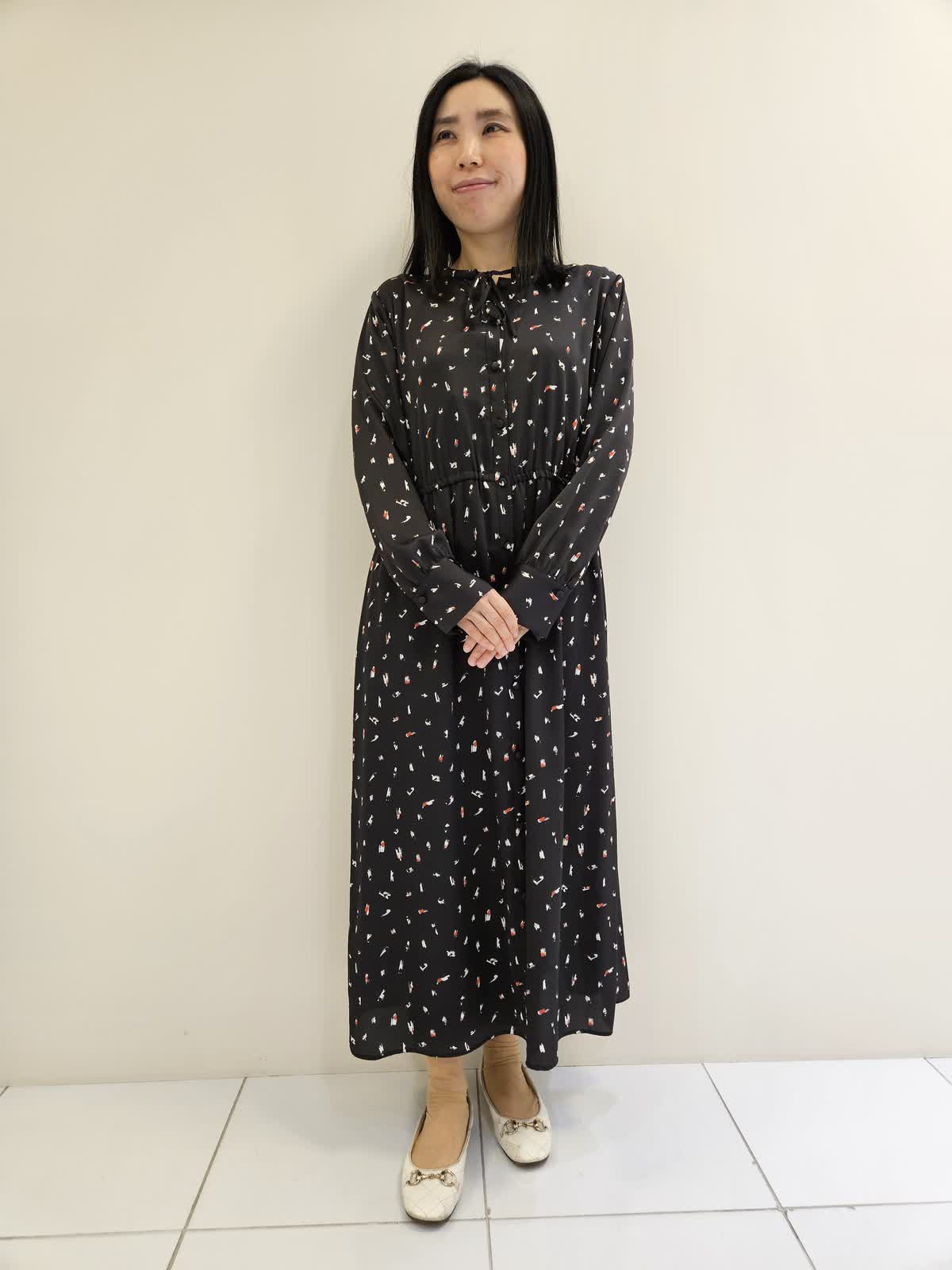 【着用サイズ・カラー】ワンピース:ブラック フリー ドットがお洒落なワンピースはシワになりにくくさらっとしていて動きやすいです。一枚でもさまになりますし、パンツ合わせもお勧めです。 ペタンコの靴にも◎