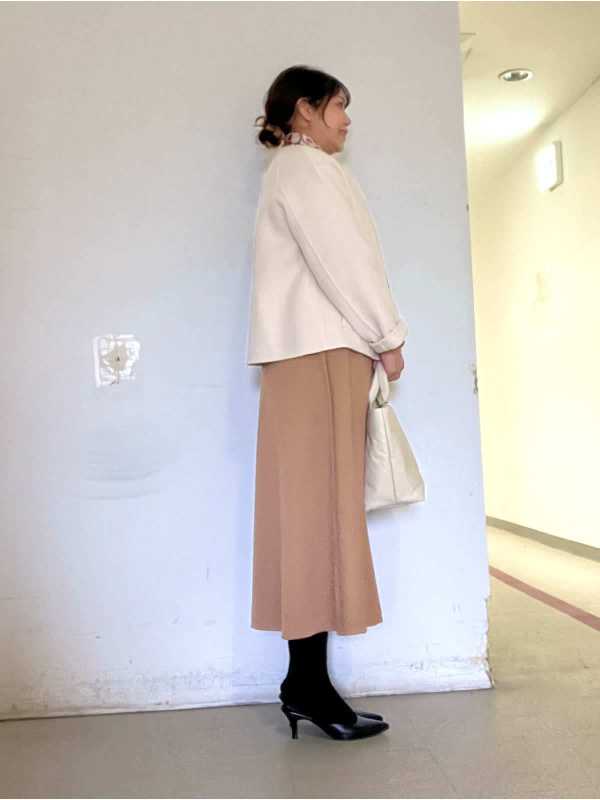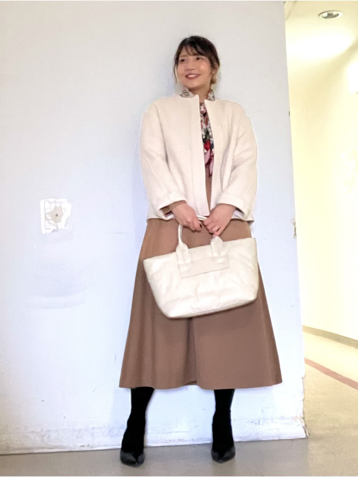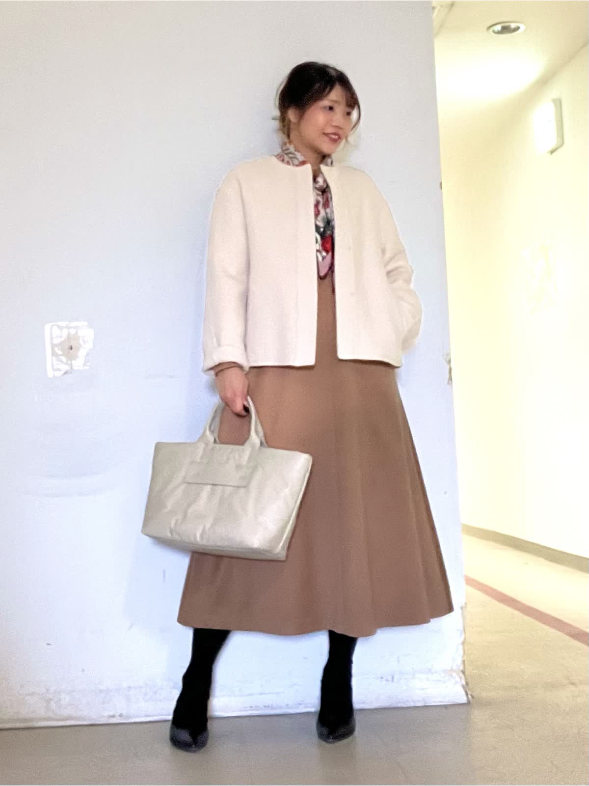 【着用アイテム:カラー/サイズ】 コート:アイボリー/9号 ワンピース:キャメル/9号 軽やかなノーカラージャケットは、肩の力を抜いたシルエットで羽織るだけで上品な印象に。短め丈なので、ワンピースとのバランスも取りやすくスタイルアップ効果も◎ 落ち感のあるワンピースは、体のラインを拾いすぎず女性らしいシルエットに。きちんと感がありながらも楽な着心地で、セレモニーからお仕事、きれいめなお出かけまで幅広く活躍します。
