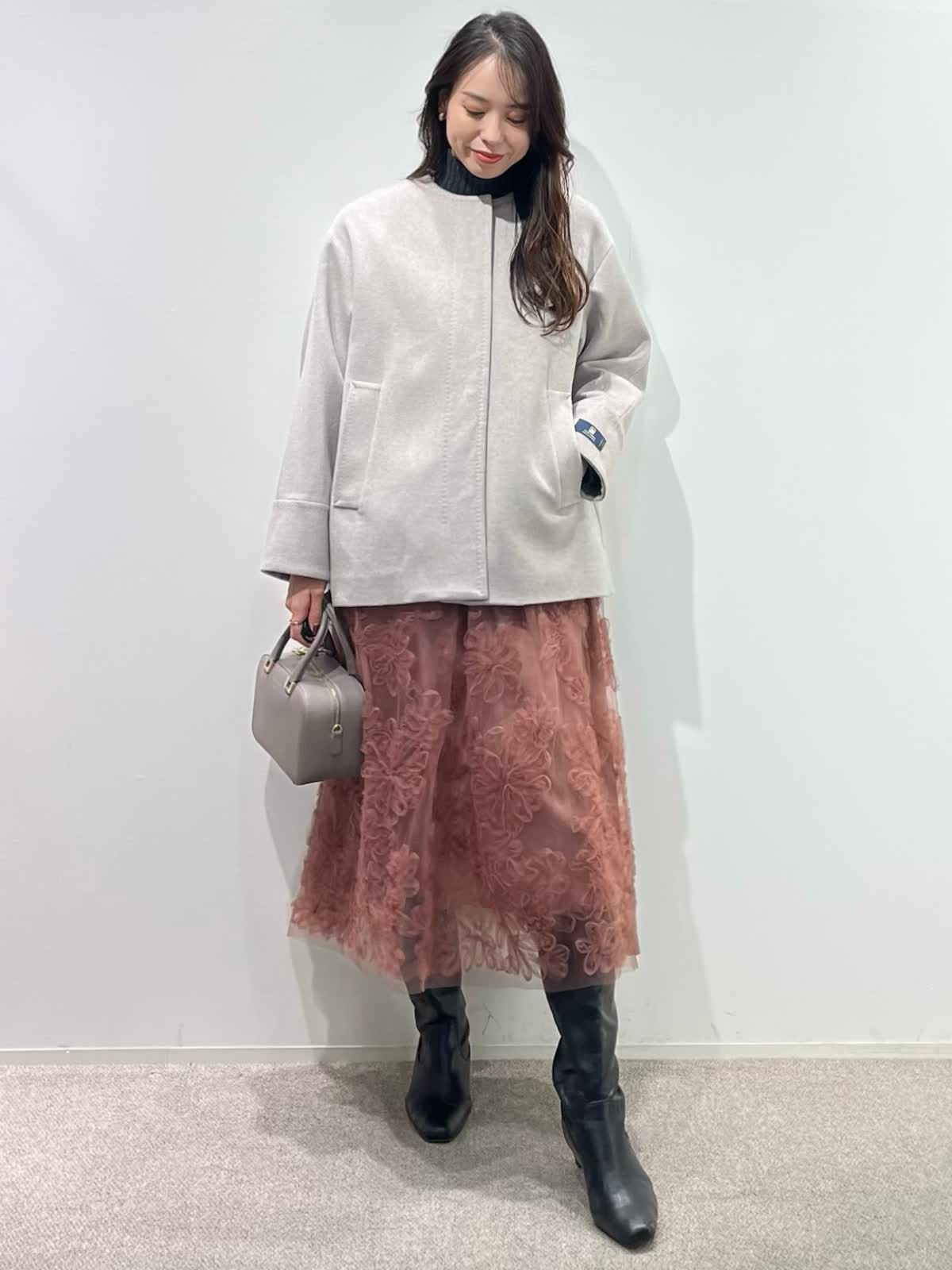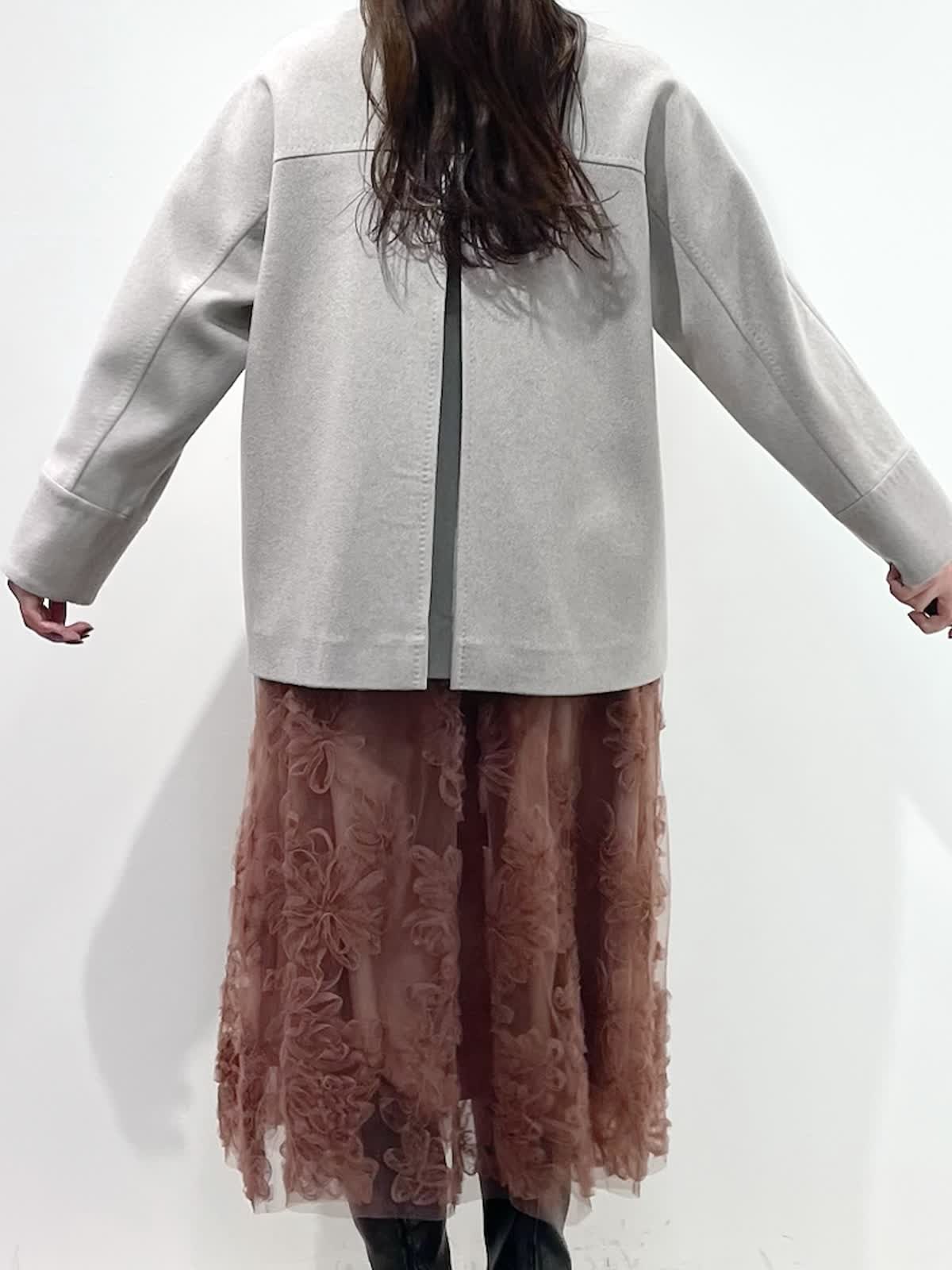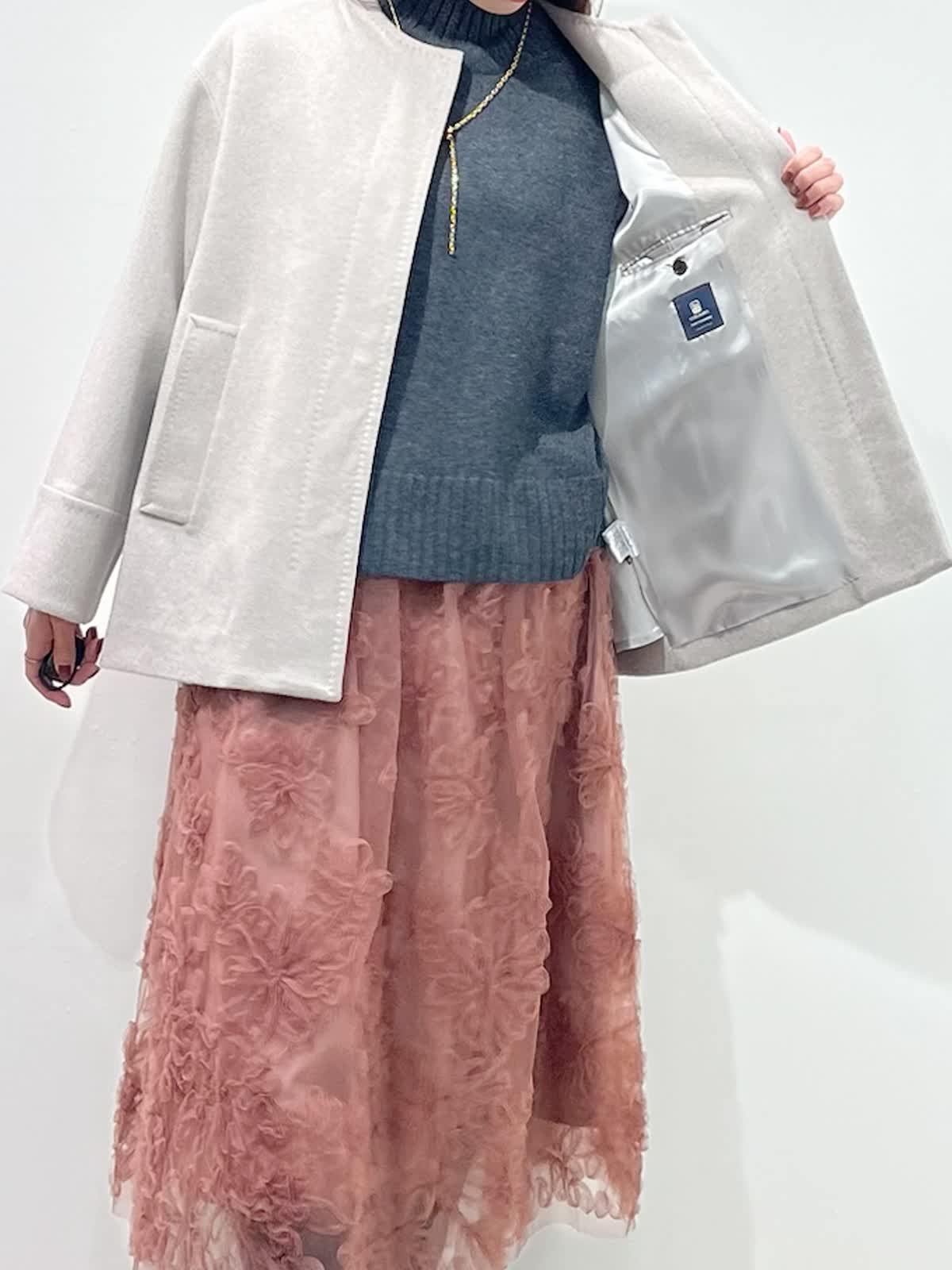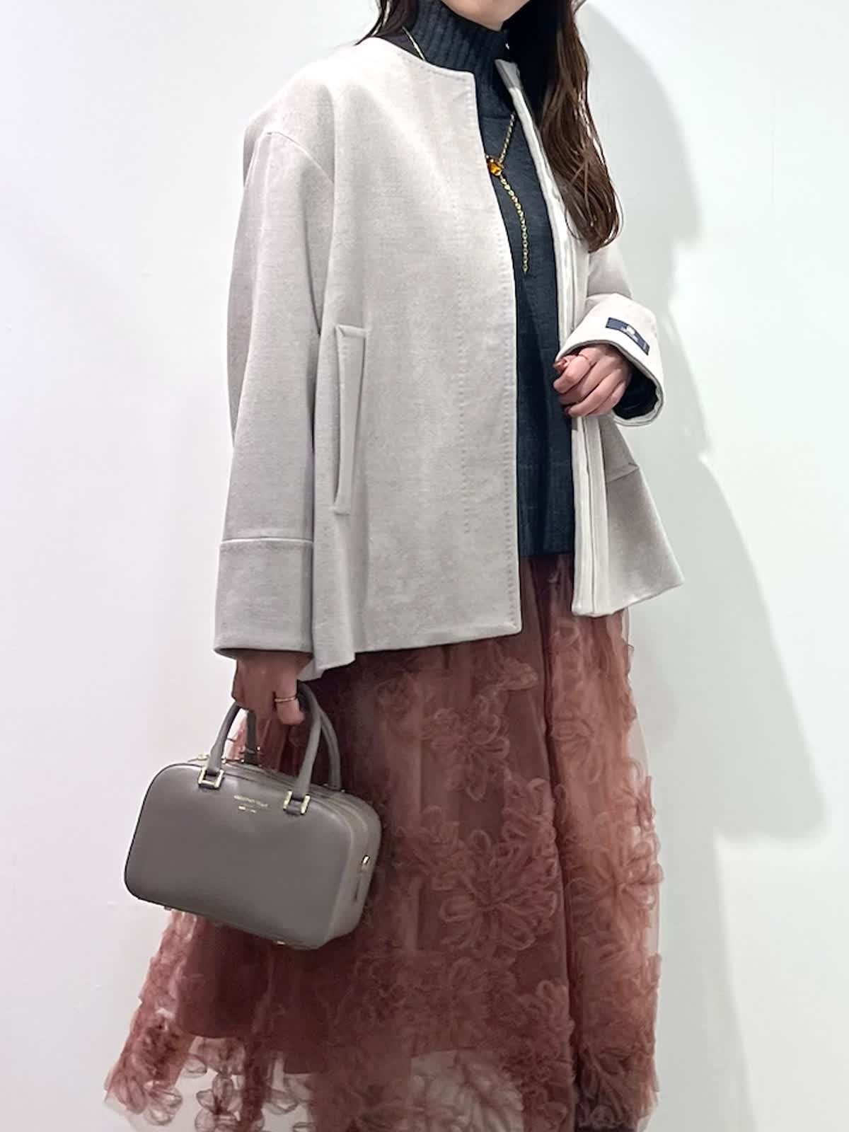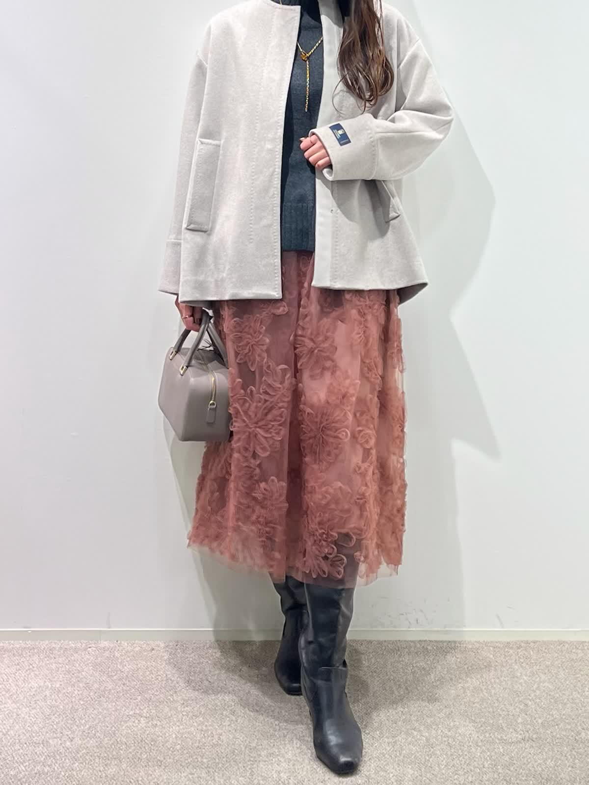 【着用サイズ】全て9号 【着用カラー】コート:ベージュ ニット:チャコールグレー スカート:ピンク バッグ:グレーベージュ 「上質カシミヤコートの華やかフェミニンコーデ」 纏うだけで、高級感のある上質カシミヤコート。上品なノーカラーのデザインと、コンパクトなミドル丈で、デイリーに着こなせるおすすめのデザイン。華やかなフラワー刺繍がポイントのチュールスカートと合わせたフェミニンコーデ。履くだけで一気にコーディネートが決まる主役級のスカートです。グレー?ピンクのカラー配色で、柔らかい印象の大人フェミニンコーデの完成。