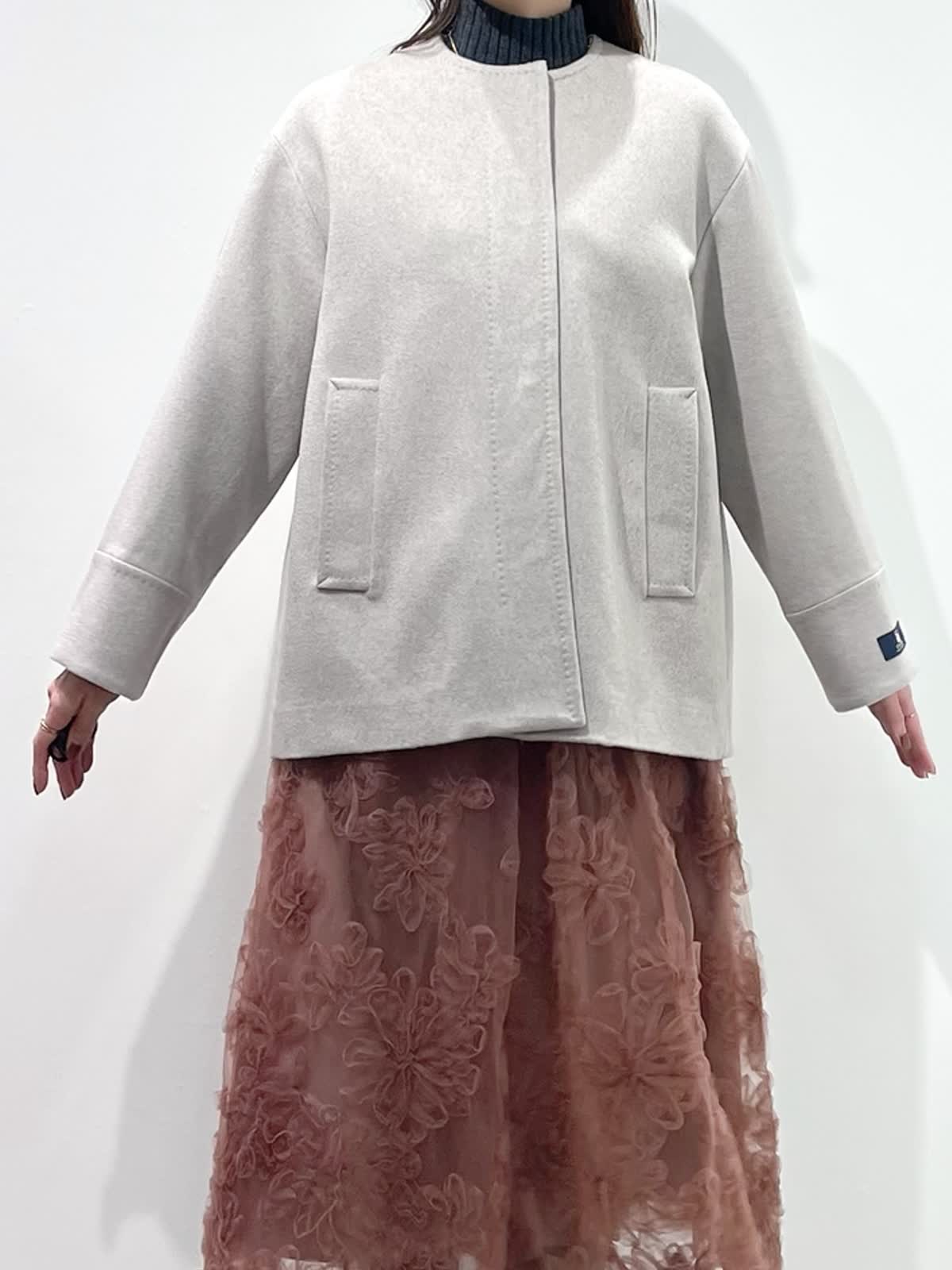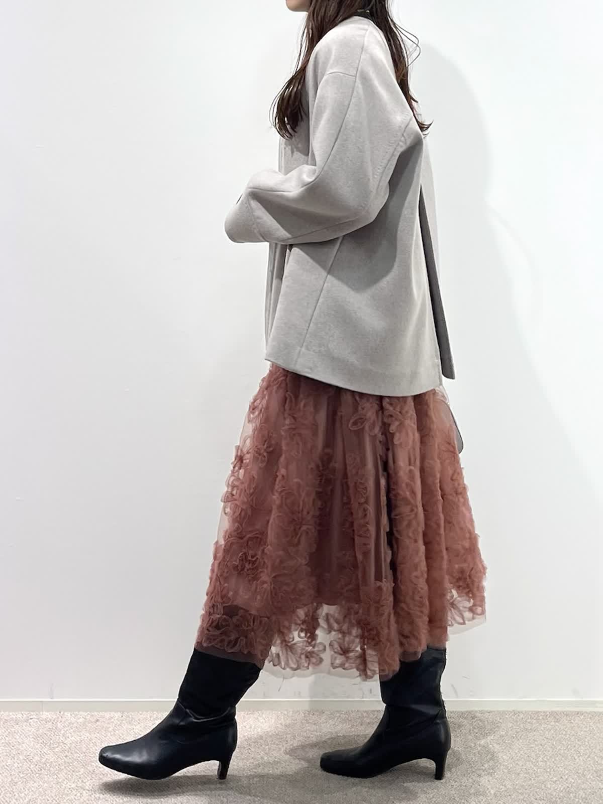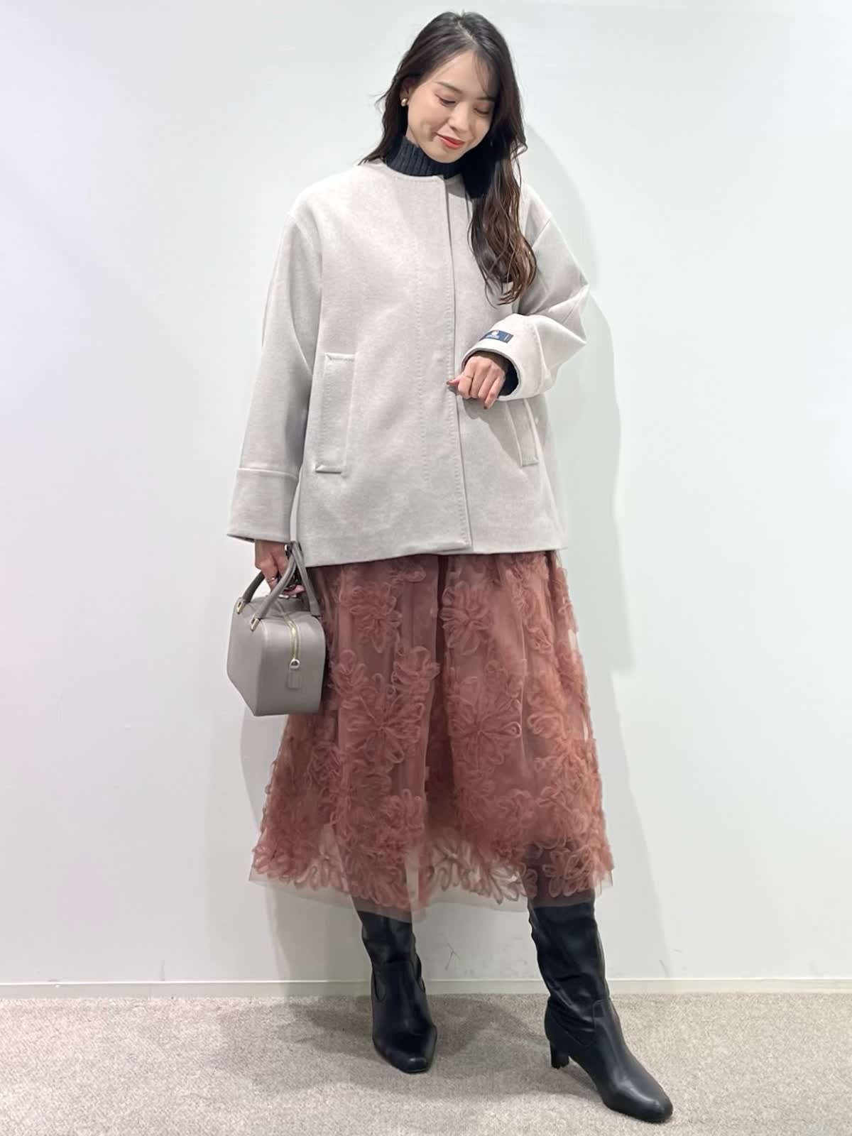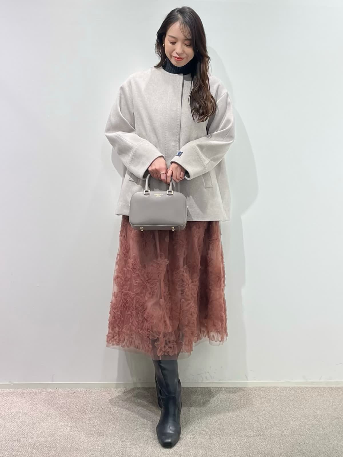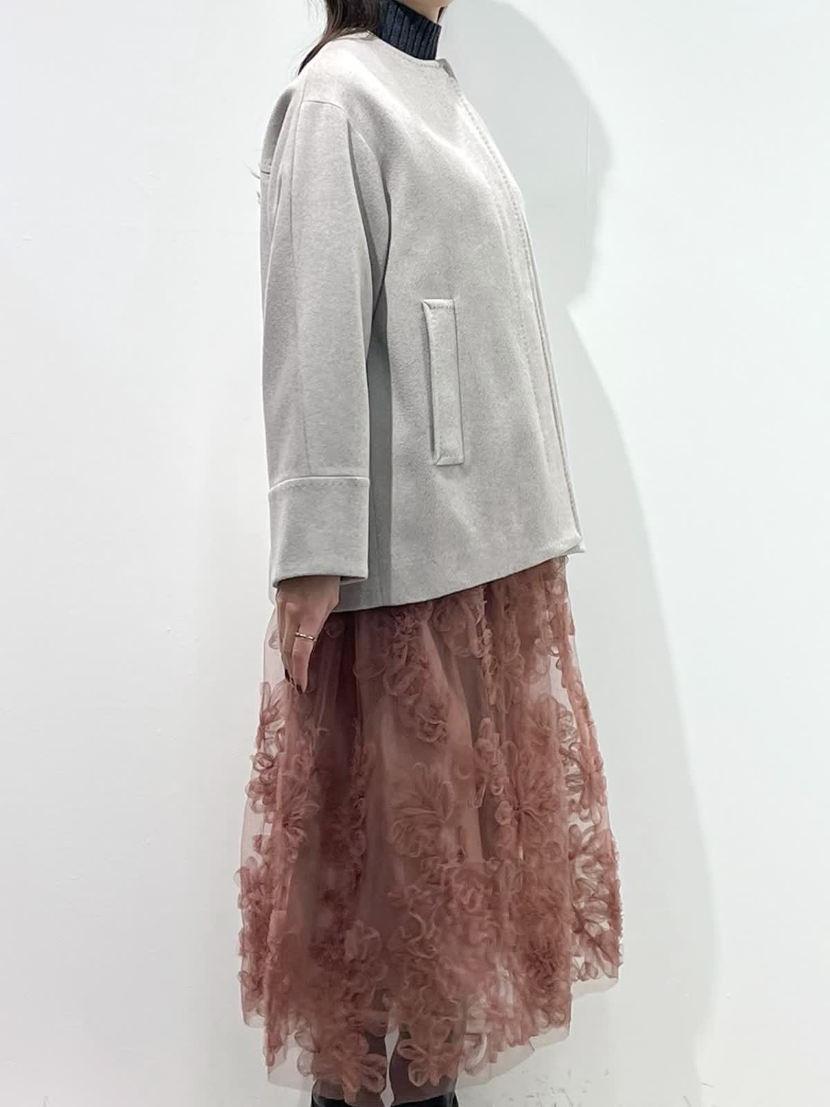 【着用サイズ】全て9号 【着用カラー】コート:ベージュ ニット:チャコールグレー スカート:ピンク バッグ:グレーベージュ 「上質カシミヤコートの華やかフェミニンコーデ」 纏うだけで、高級感のある上質カシミヤコート。上品なノーカラーのデザインと、コンパクトなミドル丈で、デイリーに着こなせるおすすめのデザイン。華やかなフラワー刺繍がポイントのチュールスカートと合わせたフェミニンコーデ。履くだけで一気にコーディネートが決まる主役級のスカートです。グレー?ピンクのカラー配色で、柔らかい印象の大人フェミニンコーデの完成。
