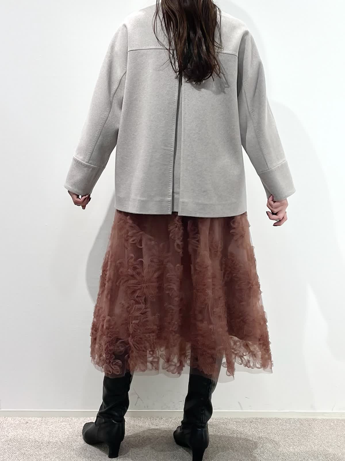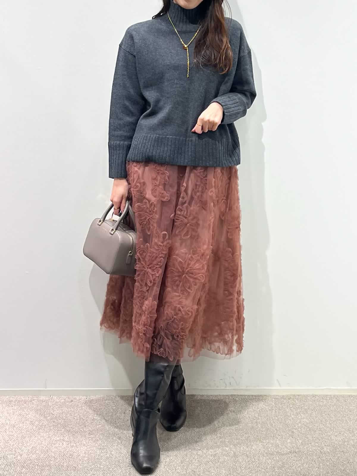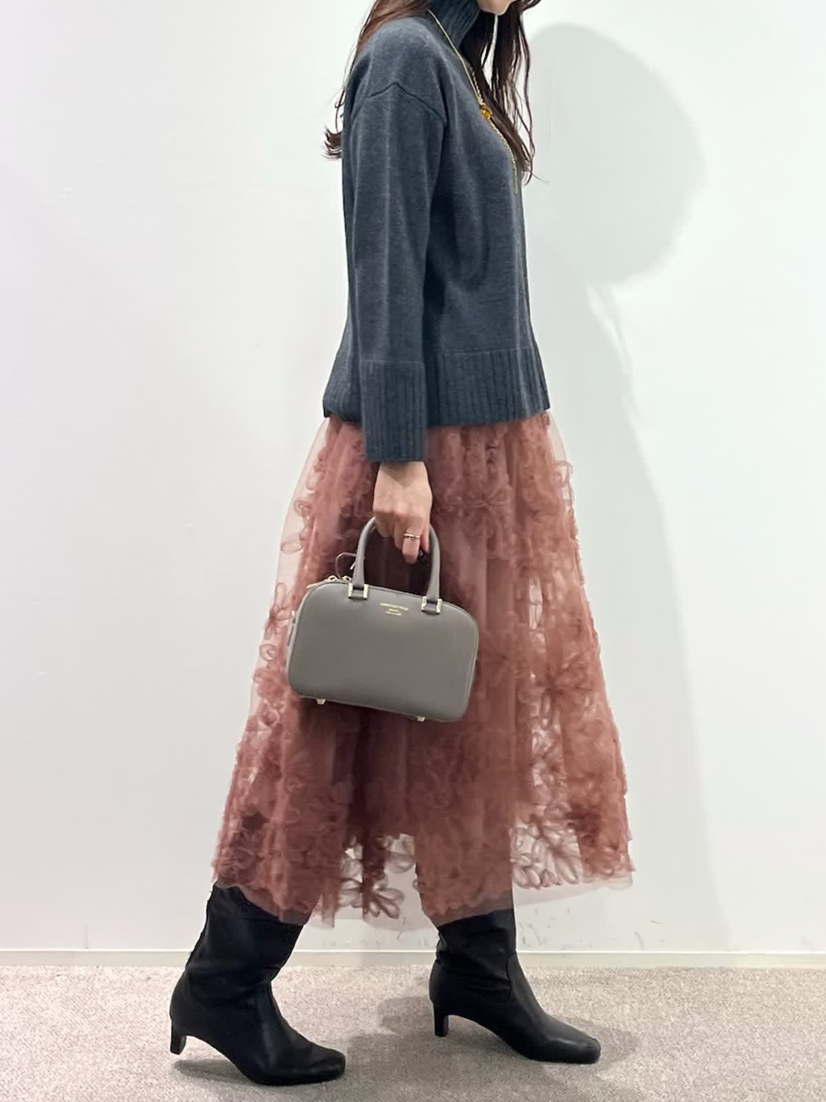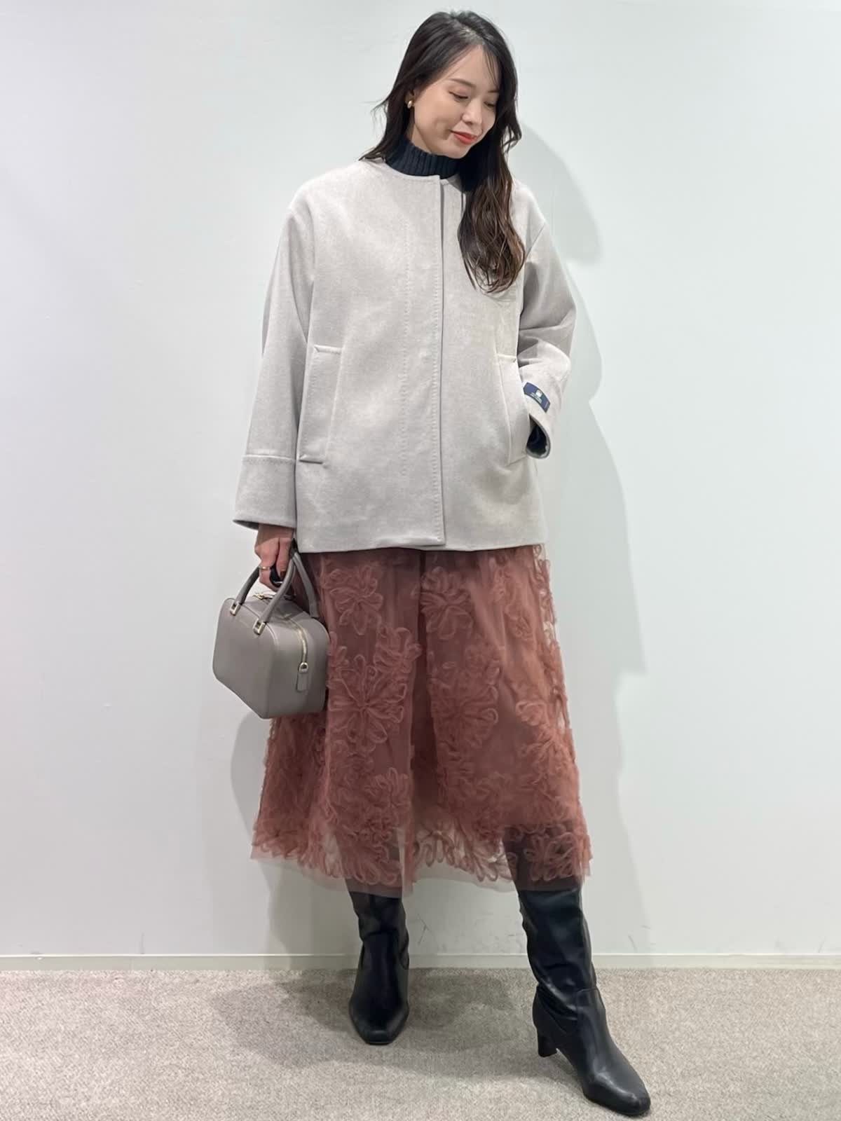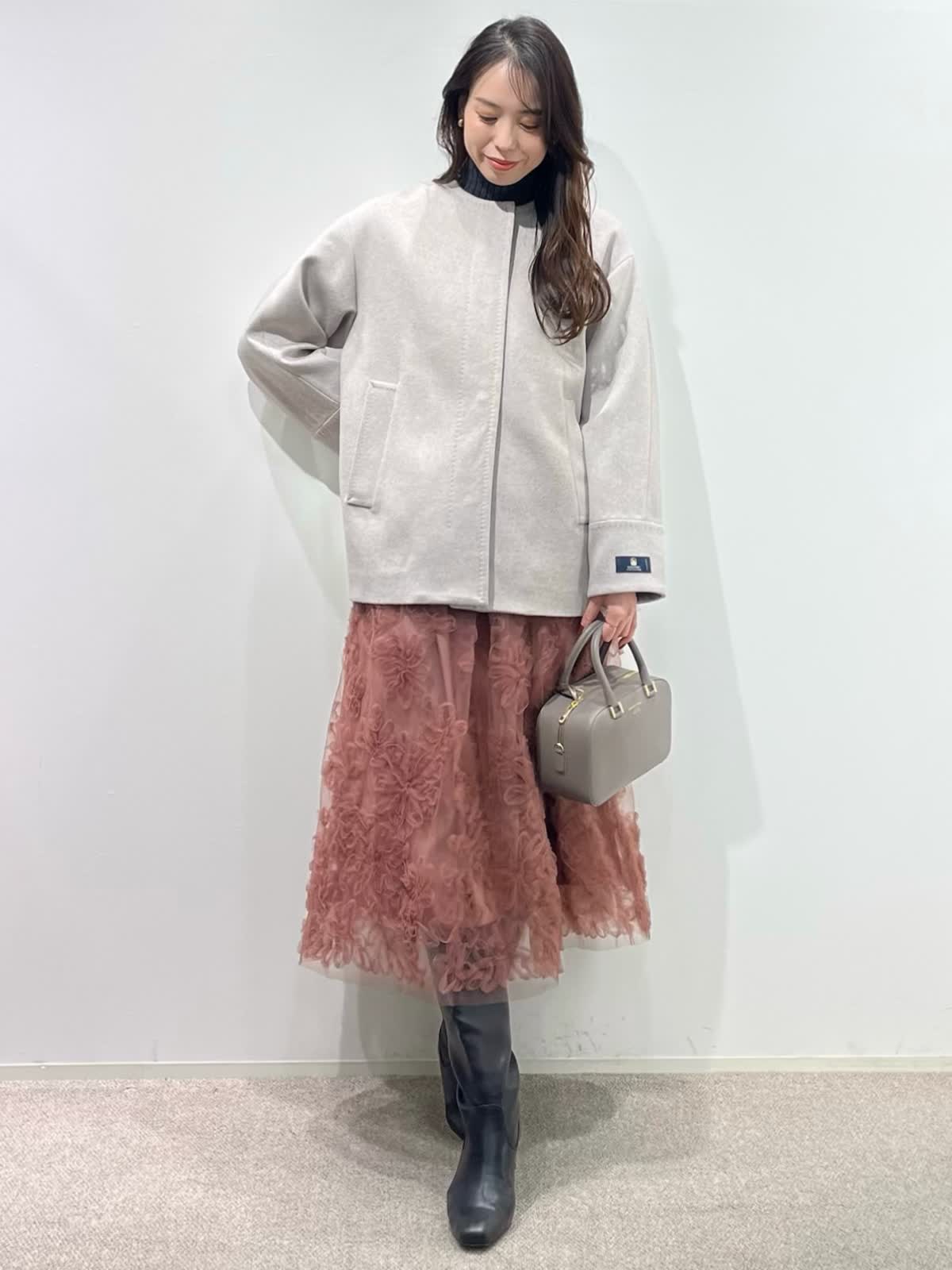 【着用サイズ】全て9号 【着用カラー】コート:ベージュ ニット:チャコールグレー スカート:ピンク バッグ:グレーベージュ 「上質カシミヤコートの華やかフェミニンコーデ」 纏うだけで、高級感のある上質カシミヤコート。上品なノーカラーのデザインと、コンパクトなミドル丈で、デイリーに着こなせるおすすめのデザイン。華やかなフラワー刺繍がポイントのチュールスカートと合わせたフェミニンコーデ。履くだけで一気にコーディネートが決まる主役級のスカートです。グレー?ピンクのカラー配色で、柔らかい印象の大人フェミニンコーデの完成。