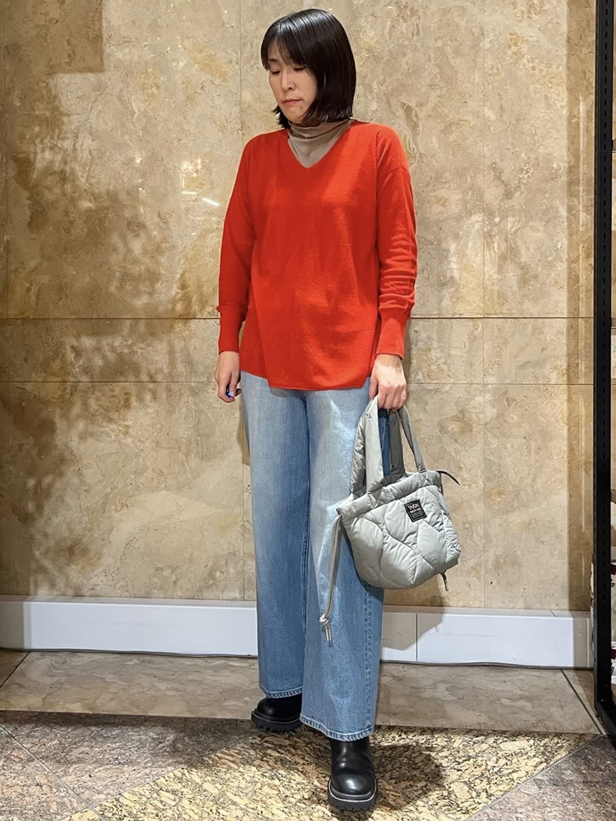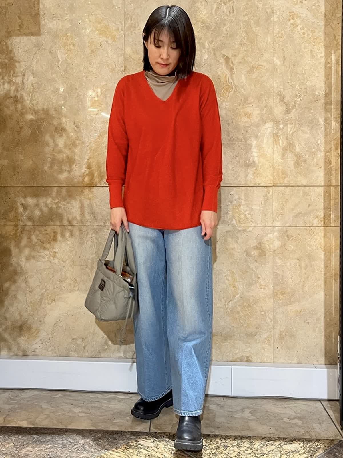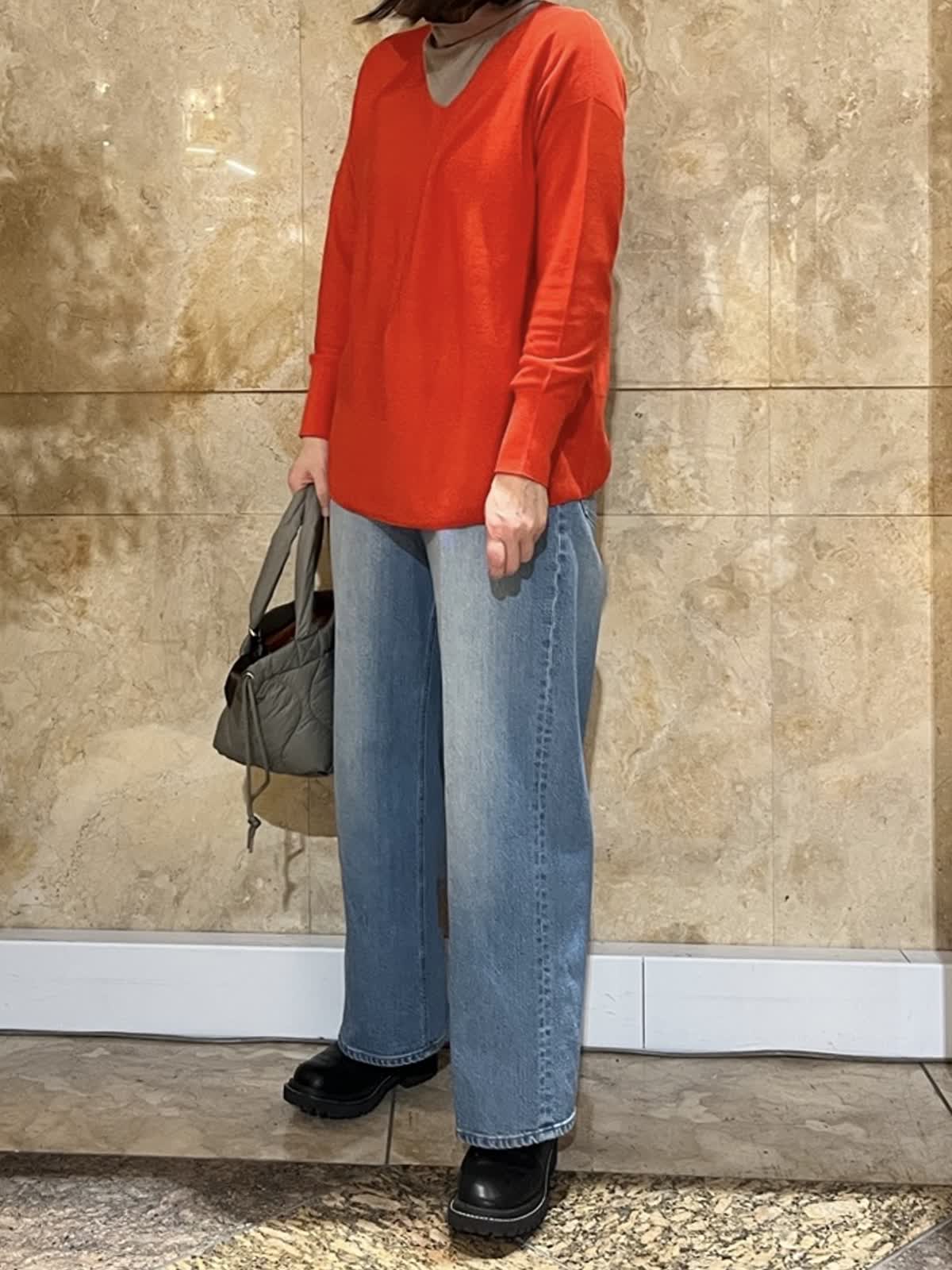 【着用サイズ/カラー】ニット:フリーサイズ/オレンジ カットタートル:11号/モカチャ デニム:9号/ブルー 顔映りを明るくしてくれるオレンジがが、大人の装いにほどよい華やかさをプラス。 Vネックの抜け感で重たく見えず、インナーとのレイヤードも楽しめます。 体のラインも拾いにくいです。 パンツにもスカートにも合わせやすく、長くご愛用いただけるニットです。 春まで着ていただけるコーディネートでオススメ◎ 首周りを楽にしたいのでインナー通常9号の所11号にして楽に着てます。