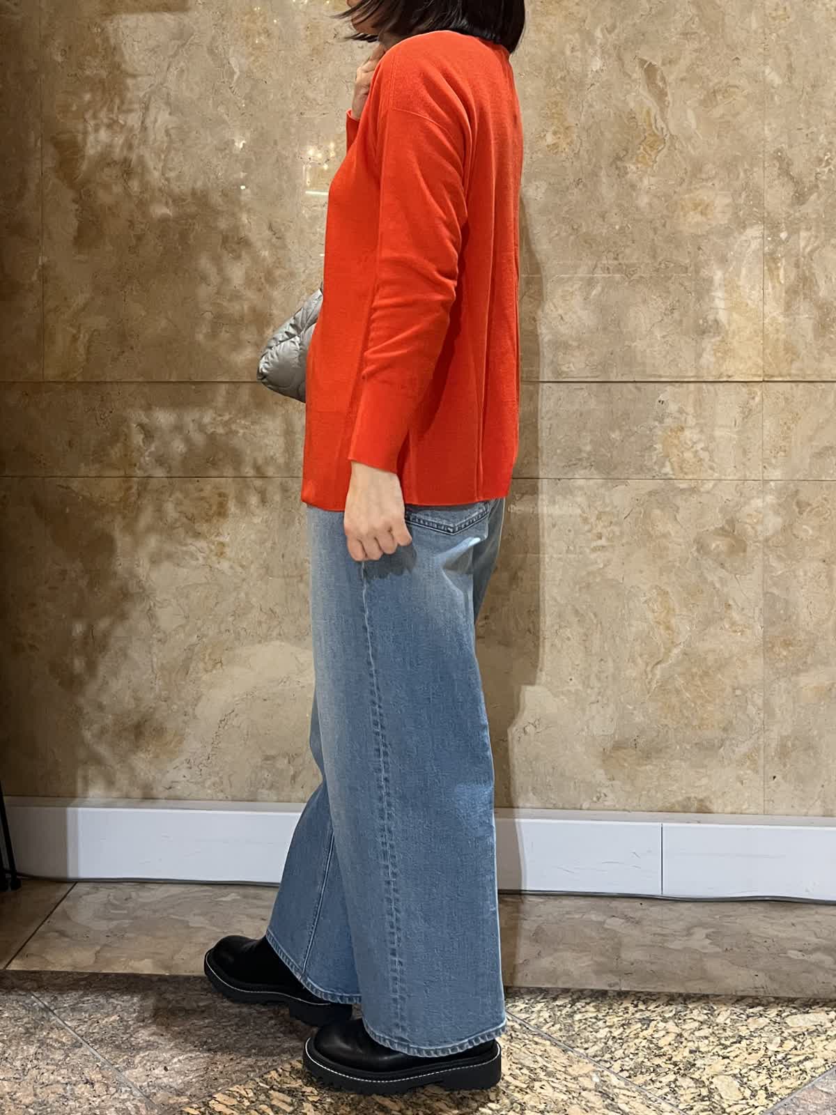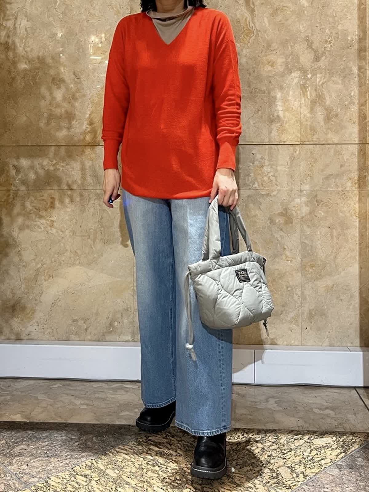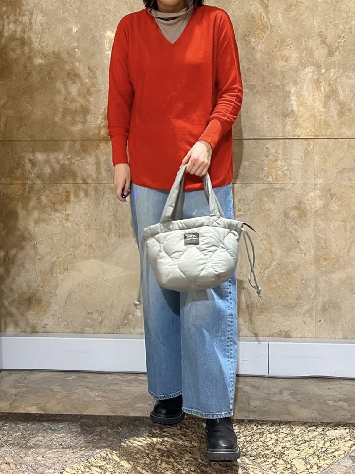 【着用サイズ/カラー】ニット:フリーサイズ/オレンジ カットタートル:11号/モカチャ デニム:9号/ブルー 顔映りを明るくしてくれるオレンジがが、大人の装いにほどよい華やかさをプラス。 Vネックの抜け感で重たく見えず、インナーとのレイヤードも楽しめます。 体のラインも拾いにくいです。 パンツにもスカートにも合わせやすく、長くご愛用いただけるニットです。 春まで着ていただけるコーディネートでオススメ◎ 首周りを楽にしたいのでインナー通常9号の所11号にして楽に着てます。