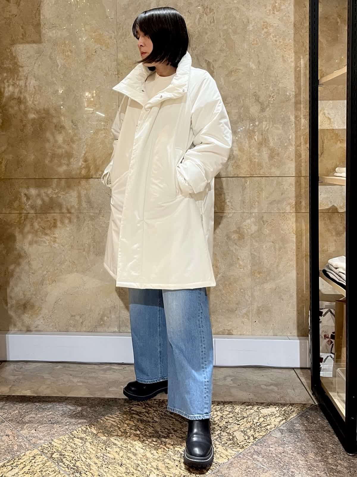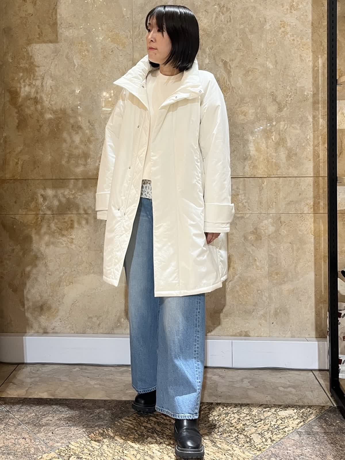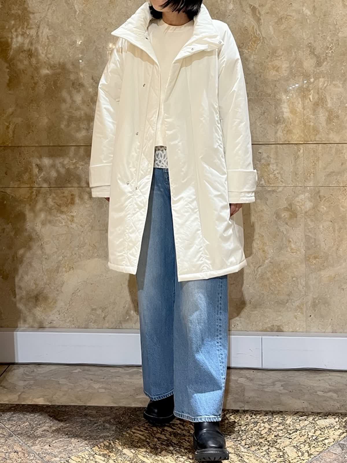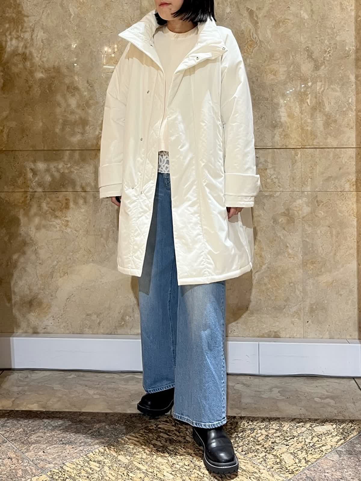 【着用サイズ/カラー】中綿コート:フリーサイズ/アイボリー ニット:フリーサイズ/オフホワイト ドッキングカットソー:9号/アイボリー デニム:9号/ブルー 程よい光沢感のあるホワイトアウターが、冬の装いを明るく上品に演出。 ゆったりとしたシルエットで厚手のトップスの上からも羽織りやすく、体のラインを拾いにくいのも嬉しいポイントです。 デニムからきれいめパンツまで幅広く合わせやすく、日常使いからお出かけまで活躍します。