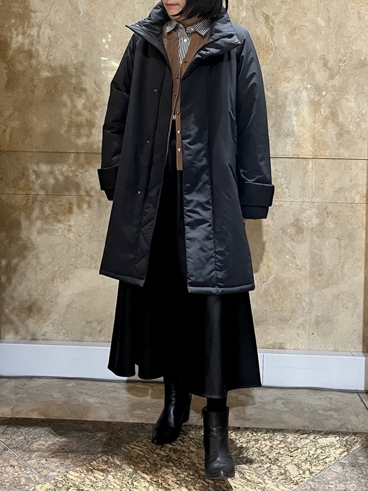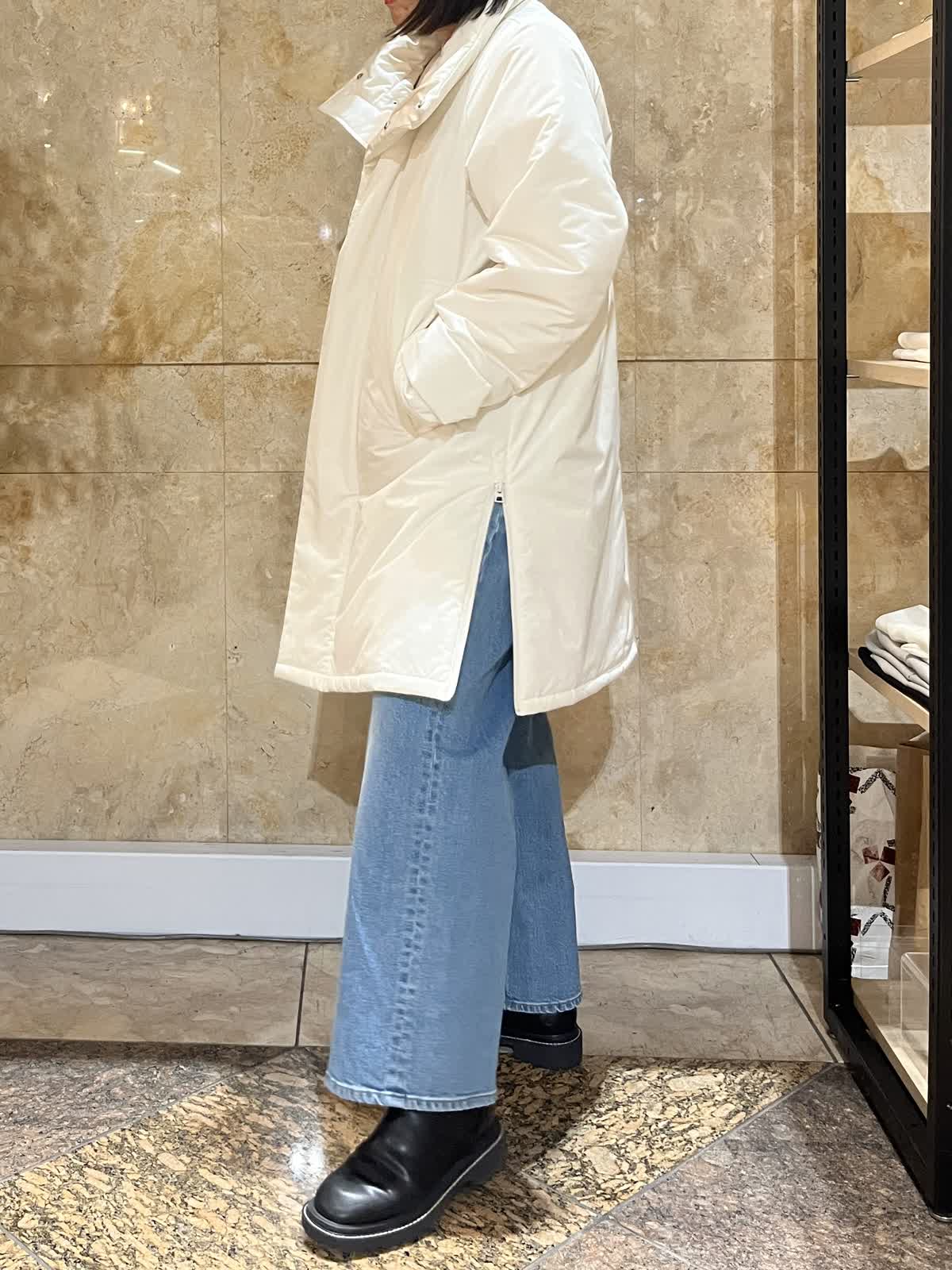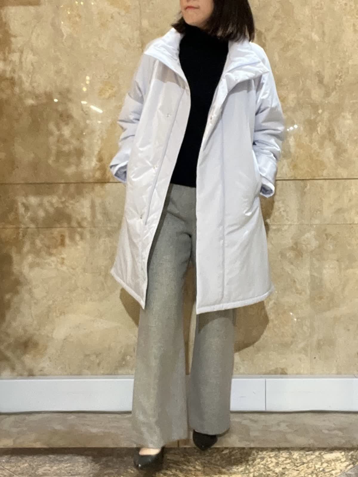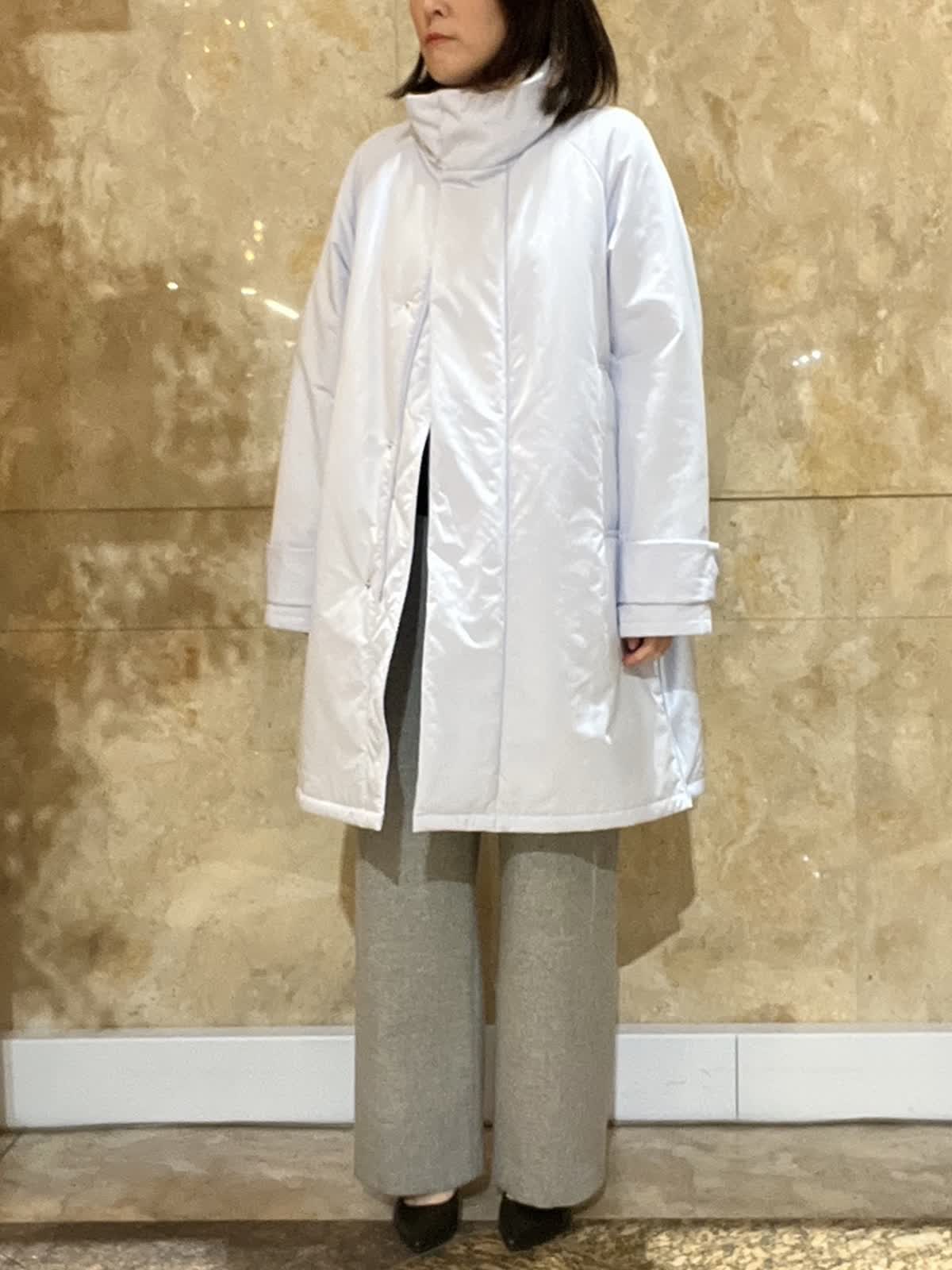 【着用サイズ/カラー】中綿コート:フリーサイズ/アイボリー ニット:フリーサイズ/オフホワイト ドッキングカットソー:9号/アイボリー デニム:9号/ブルー 程よい光沢感のあるホワイトアウターが、冬の装いを明るく上品に演出。 ゆったりとしたシルエットで厚手のトップスの上からも羽織りやすく、体のラインを拾いにくいのも嬉しいポイントです。 デニムからきれいめパンツまで幅広く合わせやすく、日常使いからお出かけまで活躍します。