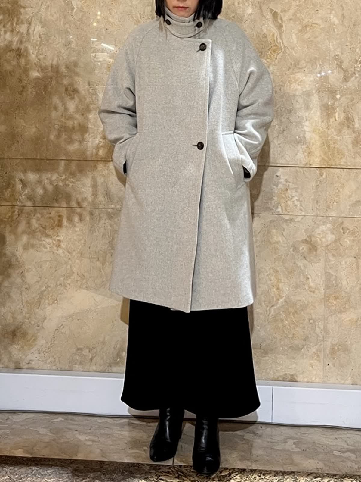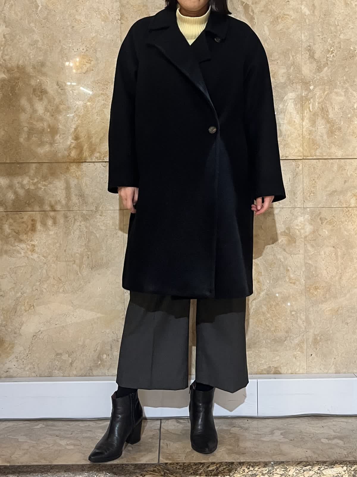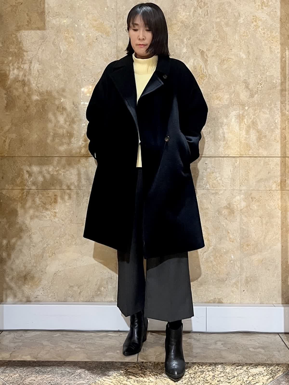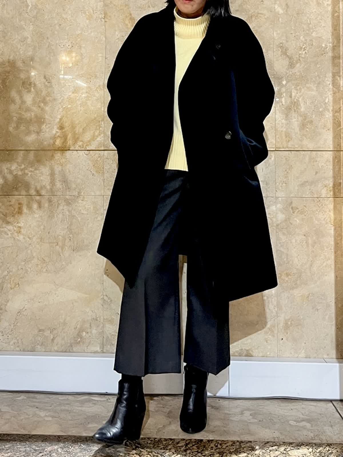 【着用サイズ/カラー】コート:フリーサイズ/ブラック ニット:フリーサイズ/イエロー パンツ:9号/チャコールグレー 上質感のあるブラックコートを主役にした、落ち着きのある大人のスタイリング。 首元はスタンドカラー仕様で、すっきりとした印象を保ちながら、防寒性も兼ね備えています。 程よくゆとりのあるシルエットで、厚手のニットの上からも無理なく羽織ることができ、体のラインを拾いにくいのも魅力。 流行に左右されにくく、パンツ・スカートどちらにも合わせやすいため、通勤からお出かけまで幅広いシーンで活躍し長くご愛用いただけます。