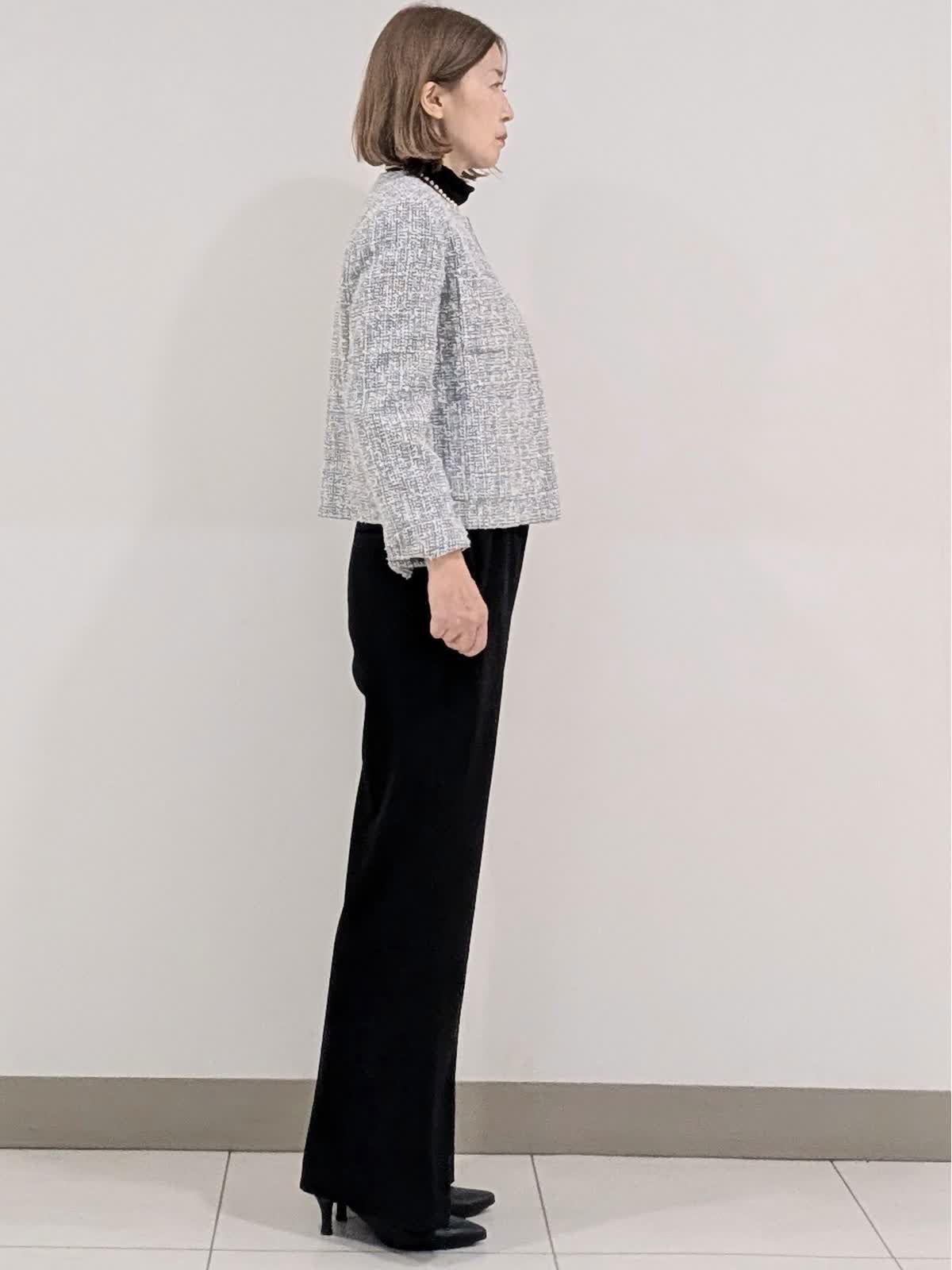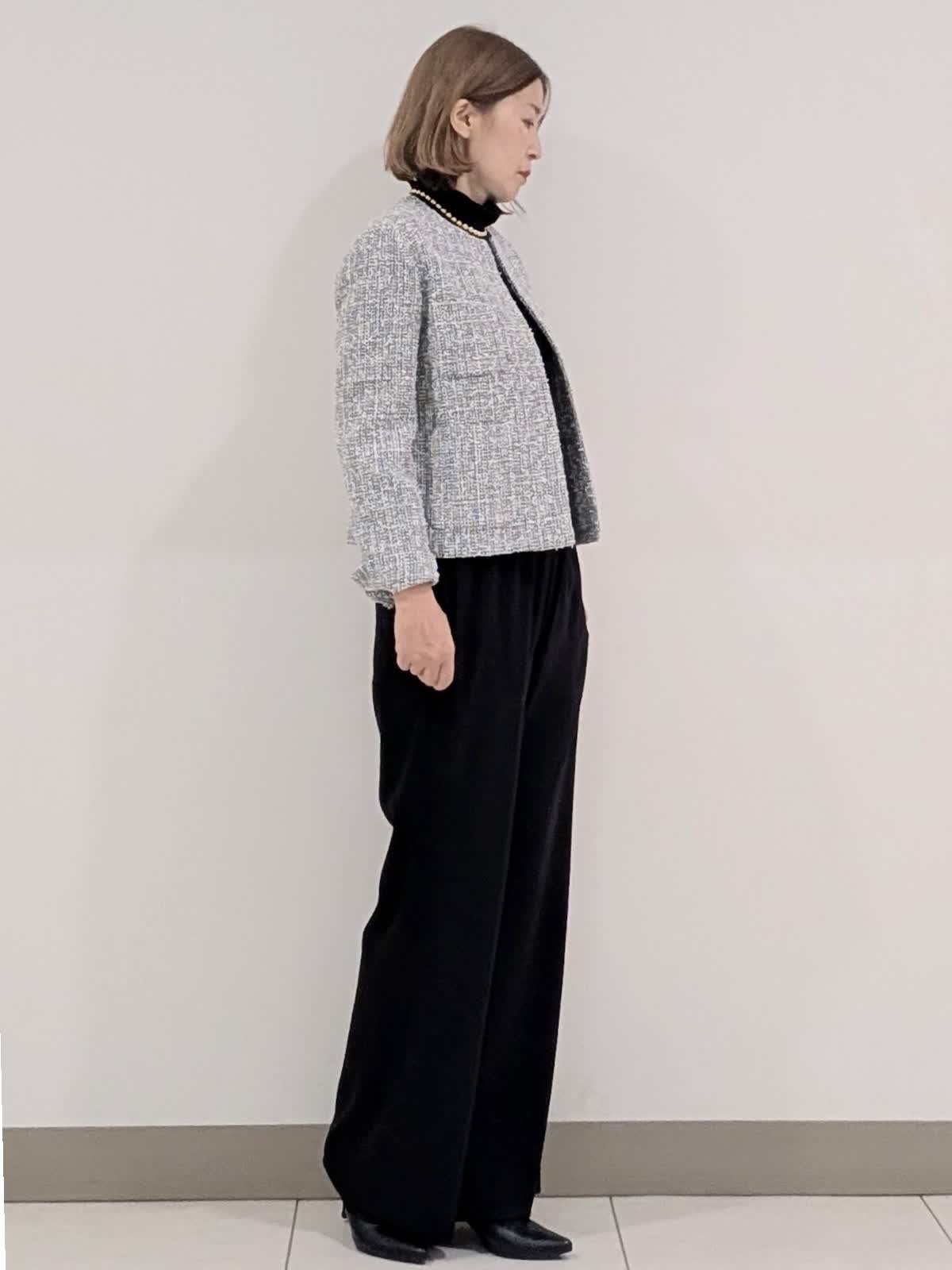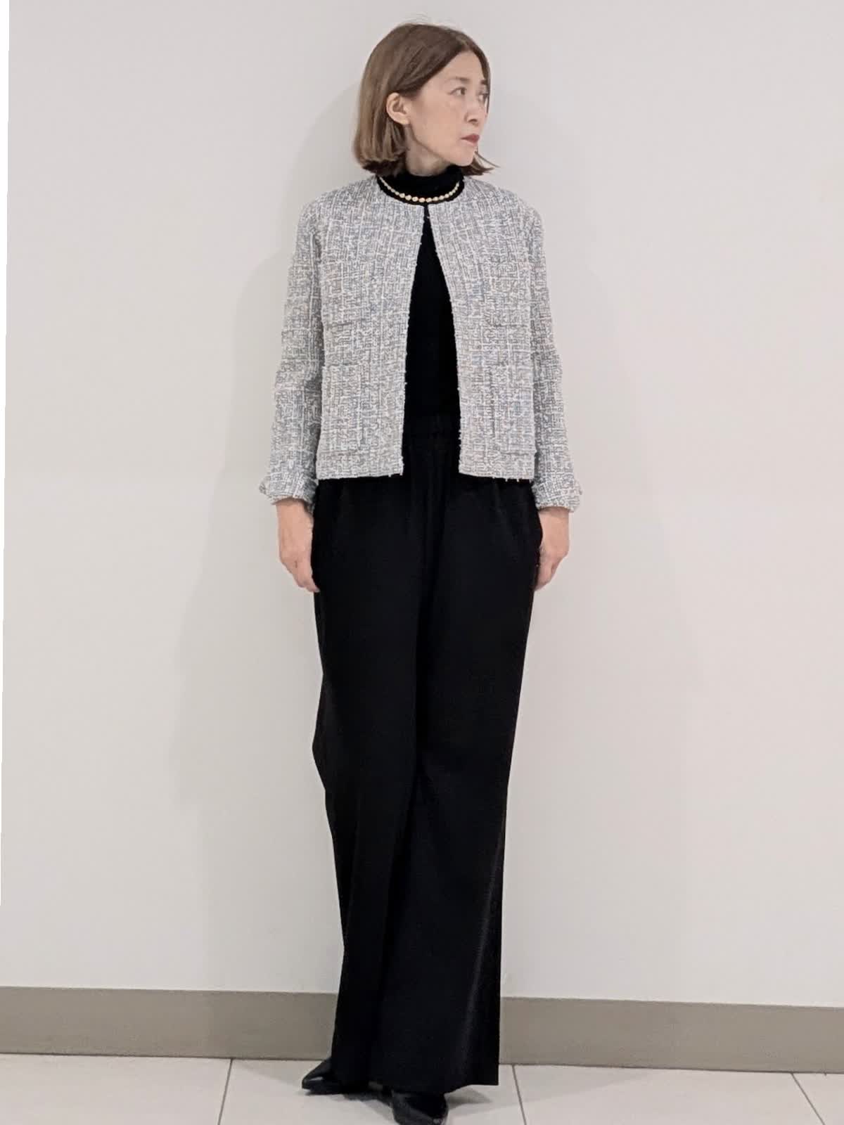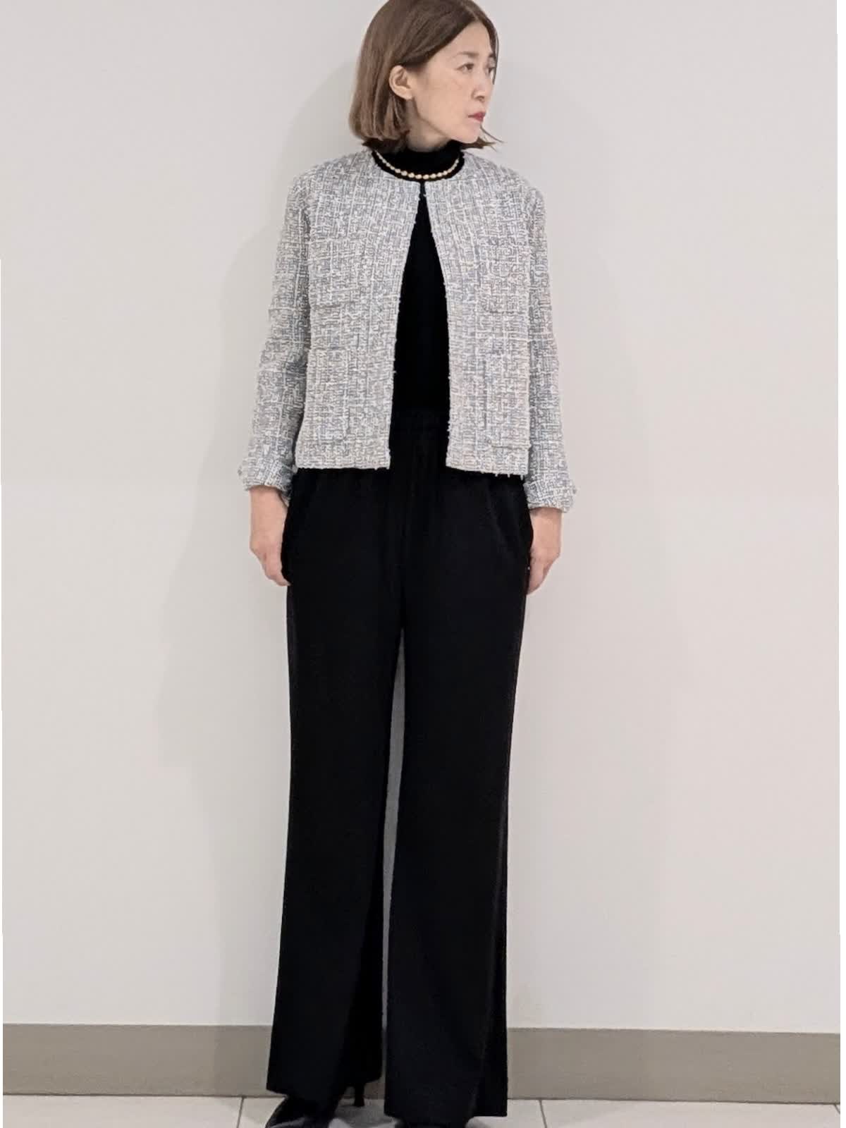 【着用サイズ9号】 表情豊かなメランジ感が上品なクラス感のあるツィードを使用したノーカラージャケット。やや短めのコンパクトなフォルムとフロント4つポケットをアクセントに。セレモニーやオフィスシーンはもちろんカジュアルにも使える万能アイテム◎ インナーは、おすすめのリブタートルを合わせスッキリと。 パンツはウエストゴムのポリエステル素材のイージーパンツをキレイめにコーディネート。