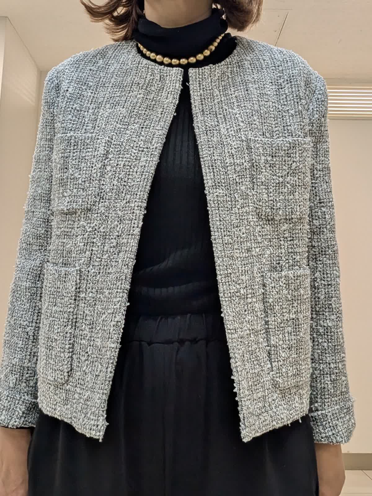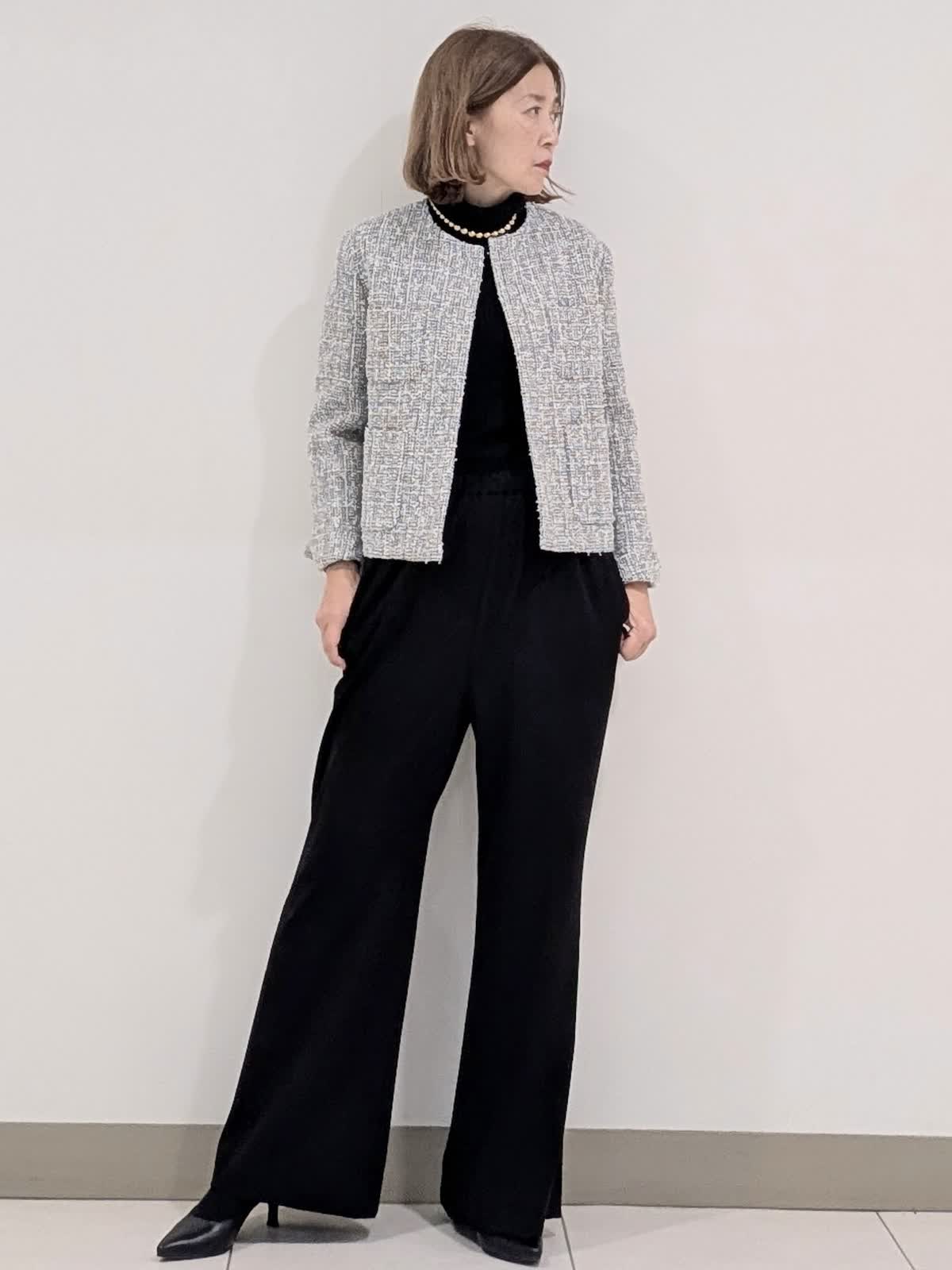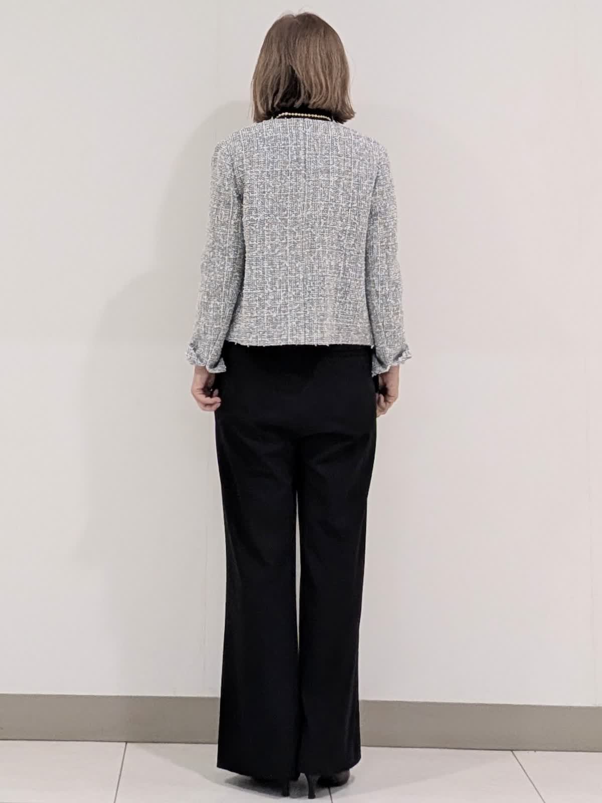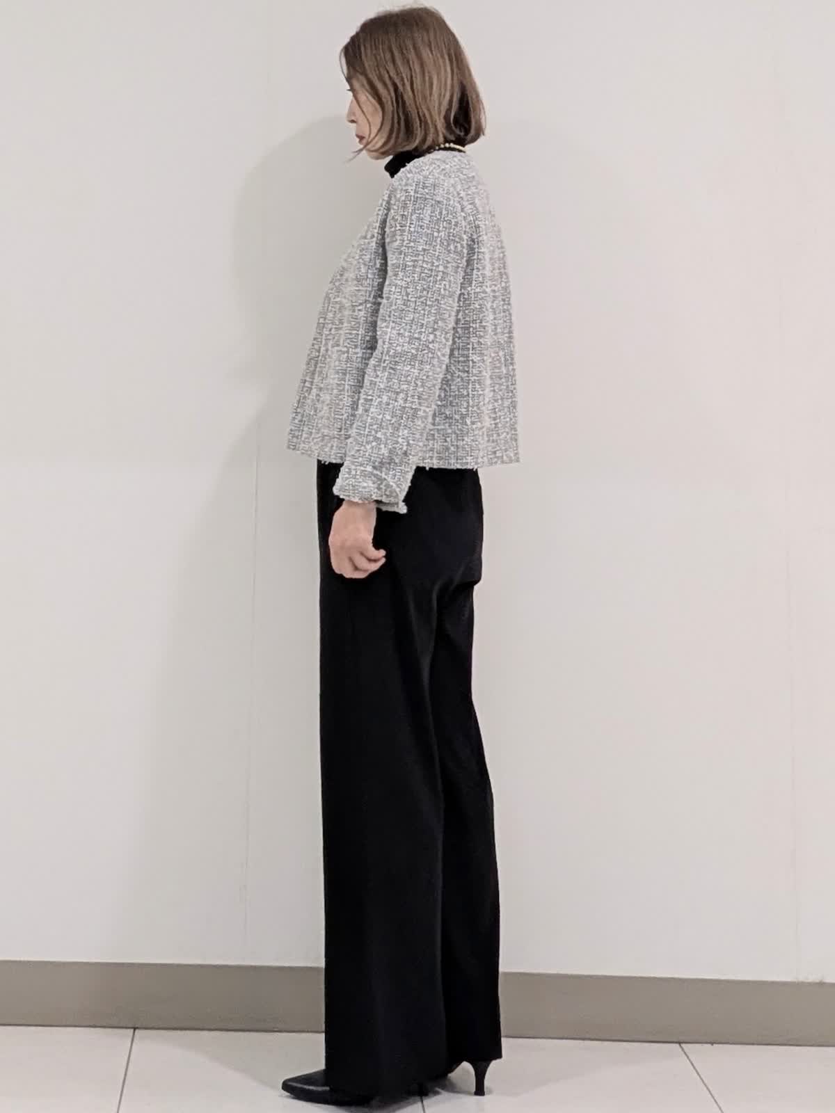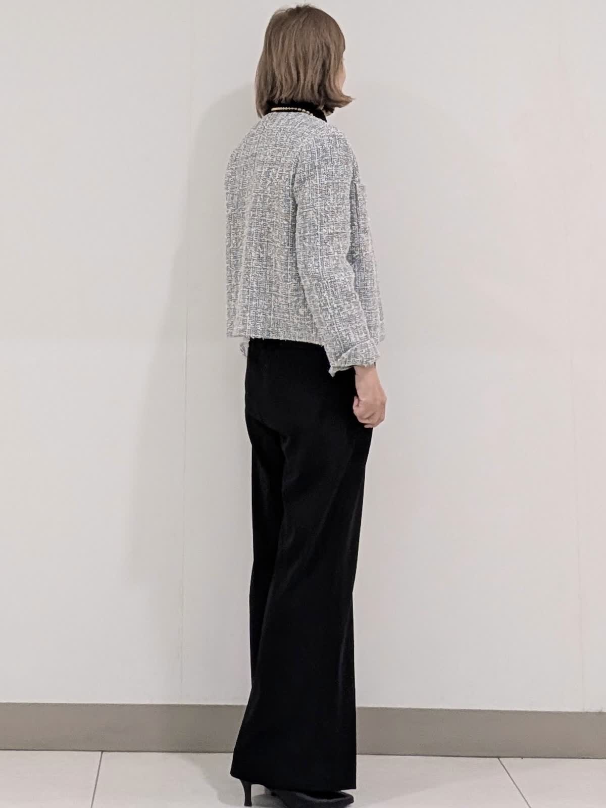 【着用サイズ9号】 表情豊かなメランジ感が上品なクラス感のあるツィードを使用したノーカラージャケット。やや短めのコンパクトなフォルムとフロント4つポケットをアクセントに。セレモニーやオフィスシーンはもちろんカジュアルにも使える万能アイテム◎ インナーは、おすすめのリブタートルを合わせスッキリと。 パンツはウエストゴムのポリエステル素材のイージーパンツをキレイめにコーディネート。