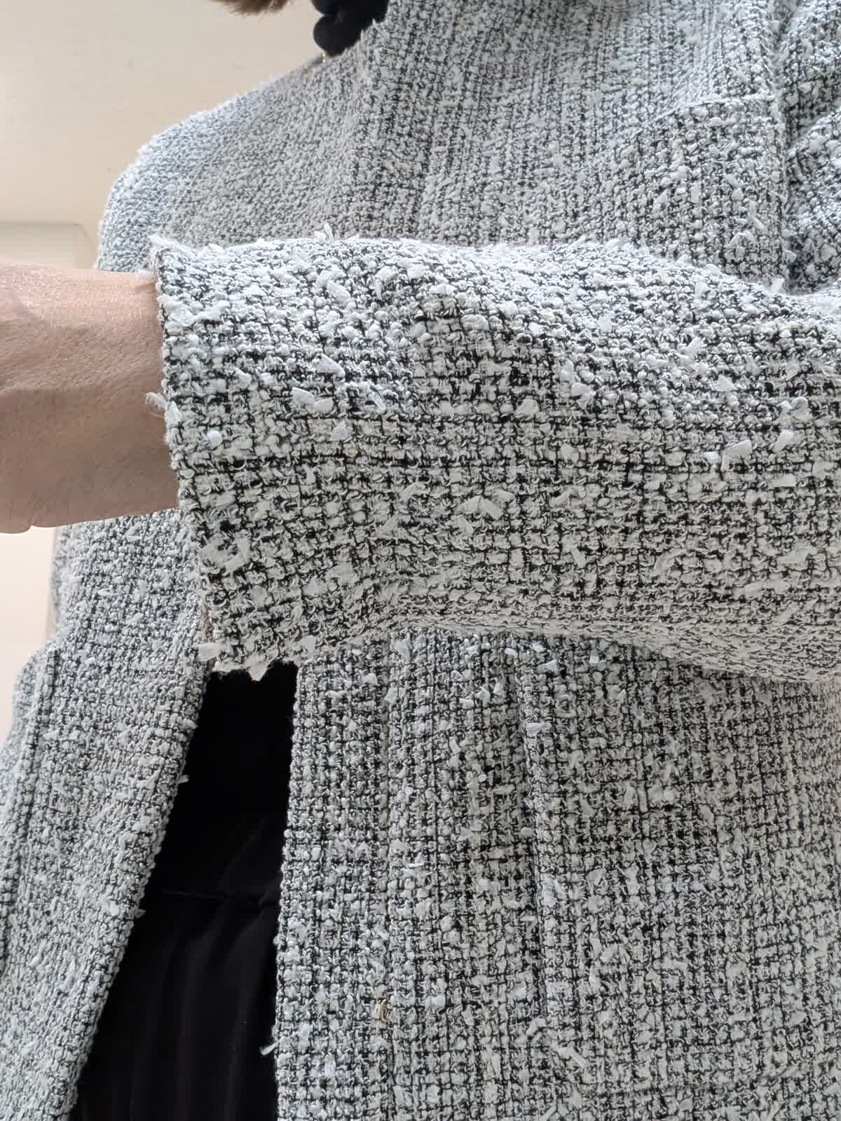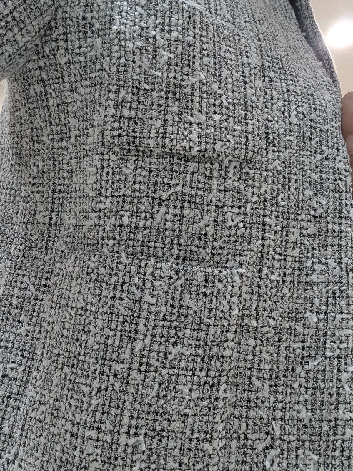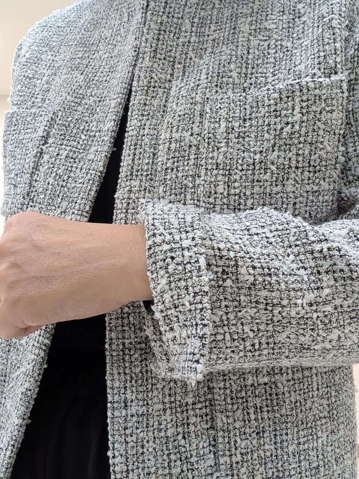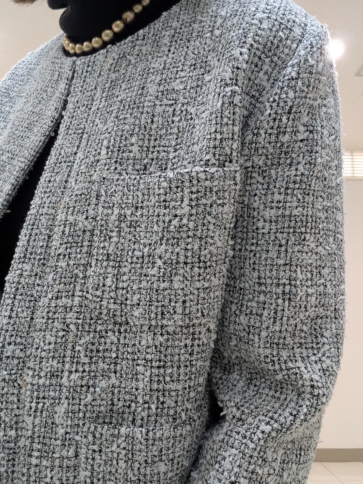 【着用サイズ9号】 表情豊かなメランジ感が上品なクラス感のあるツィードを使用したノーカラージャケット。やや短めのコンパクトなフォルムとフロント4つポケットをアクセントに。セレモニーやオフィスシーンはもちろんカジュアルにも使える万能アイテム◎ インナーは、おすすめのリブタートルを合わせスッキリと。 パンツはウエストゴムのポリエステル素材のイージーパンツをキレイめにコーディネート。