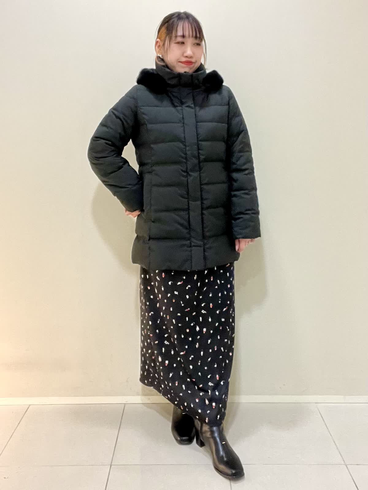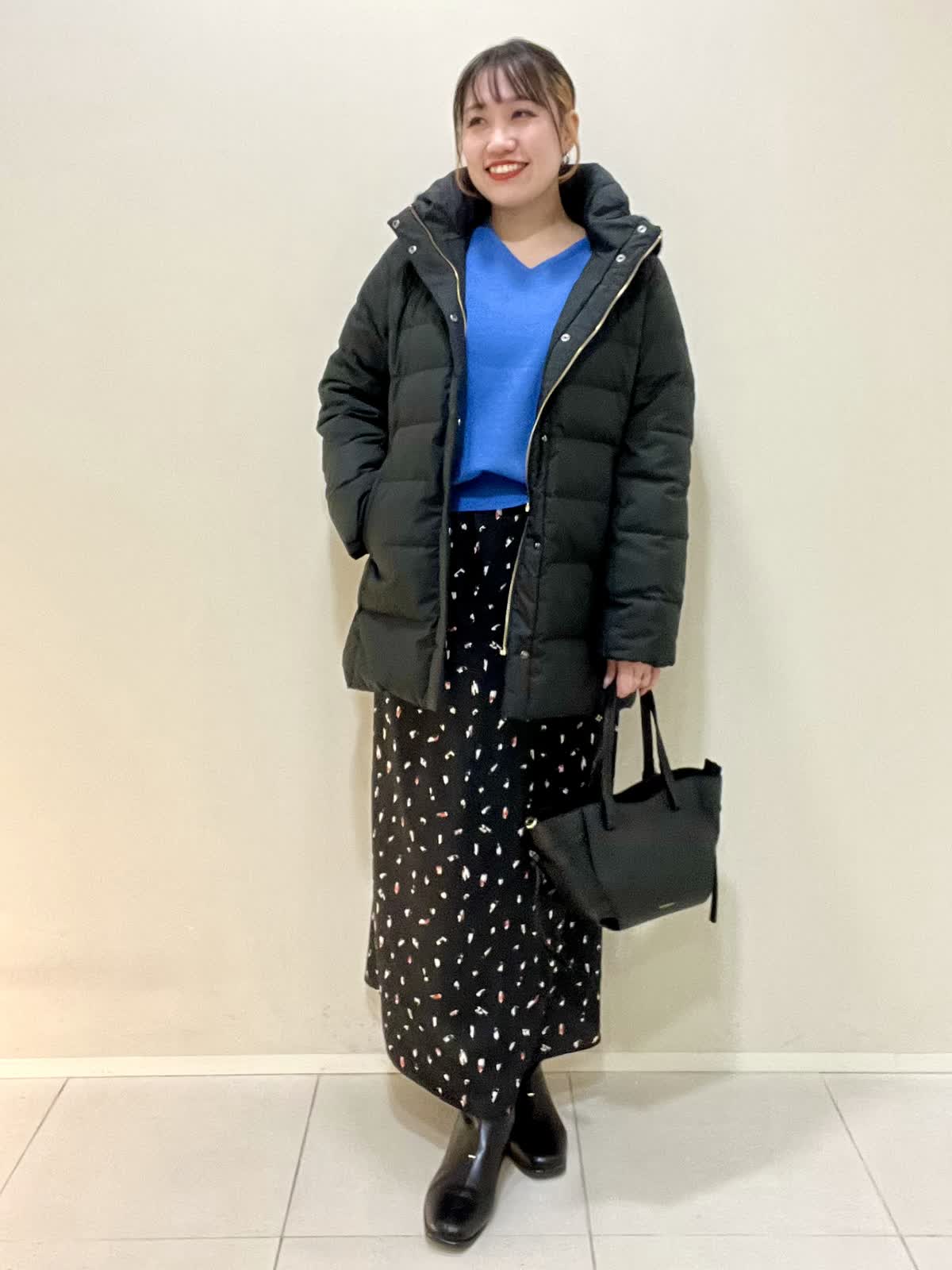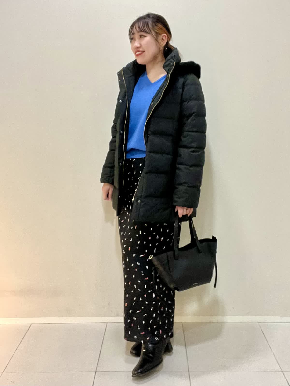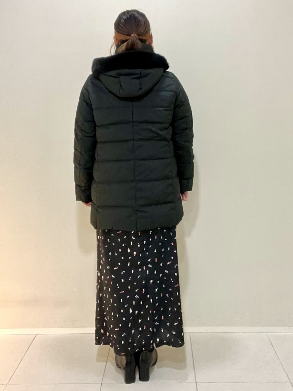 【着用サイズ】ダウン:M ニット:M スカート:フリー 【着用カラー】ダウン:ブラック ニット:ブルー スカート:ブラック とても暖かいダウンで綺麗めコーディネートです。ダウン90%、フェザー10%の暖かいダウンは、すっきりシルエットです。フードが取り外し可能で、フードに付いているファー取り外し可能です。長すぎず短すぎずの着丈なので、スカートで合わせてもすっきり着ることができました。重たい感じもありませんが、フードを取るとより軽く感じました。首元まで暖かく、袖口はゴムが入っているので風を通しにくいです。寒い日も1着あれば安心なダウンコートです。