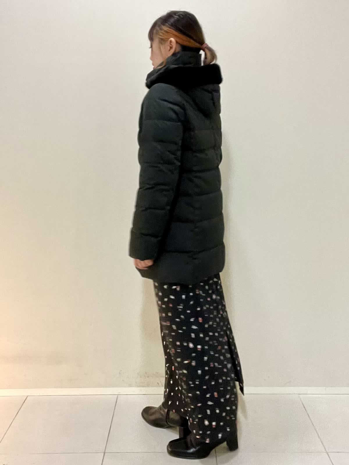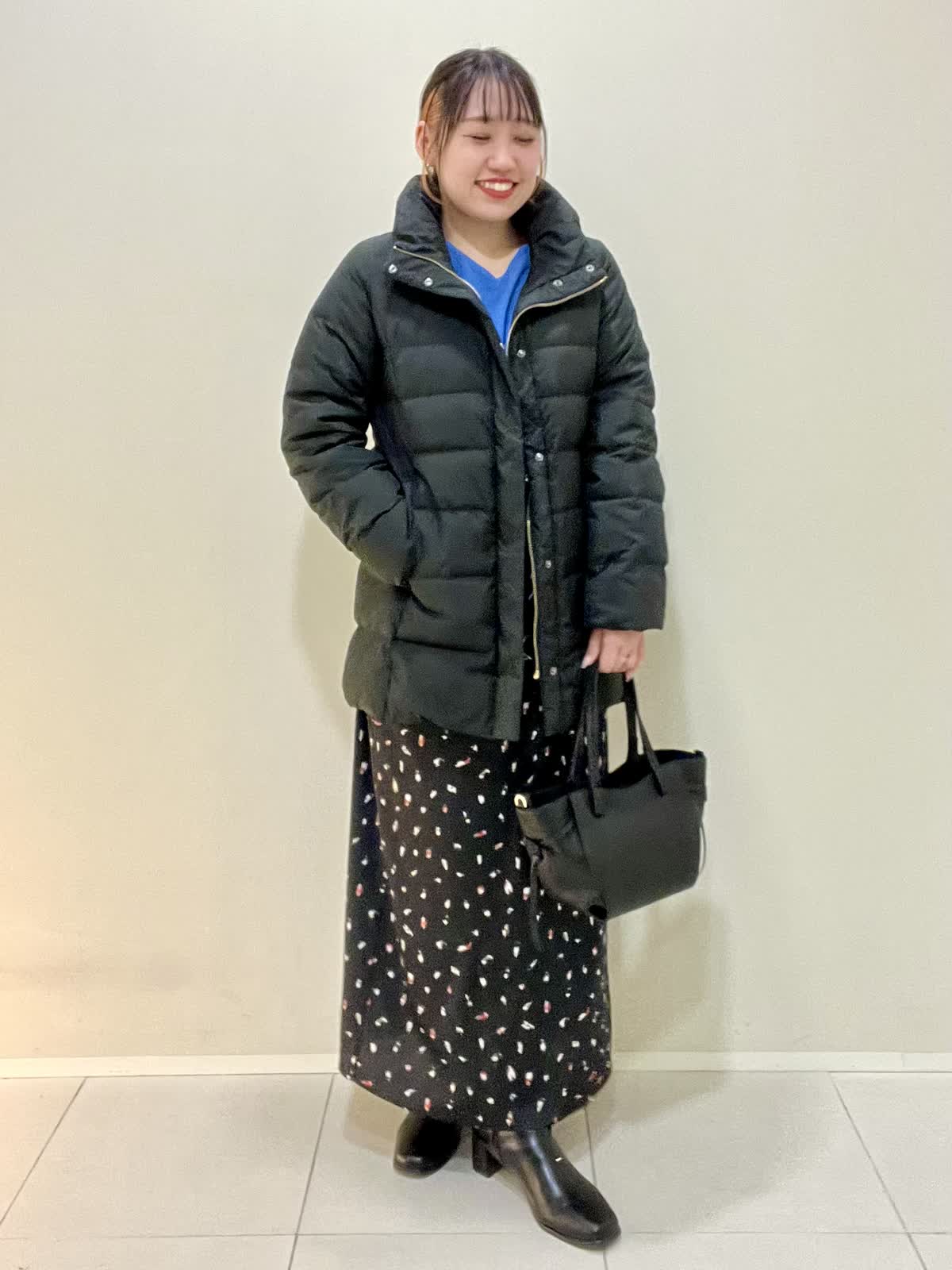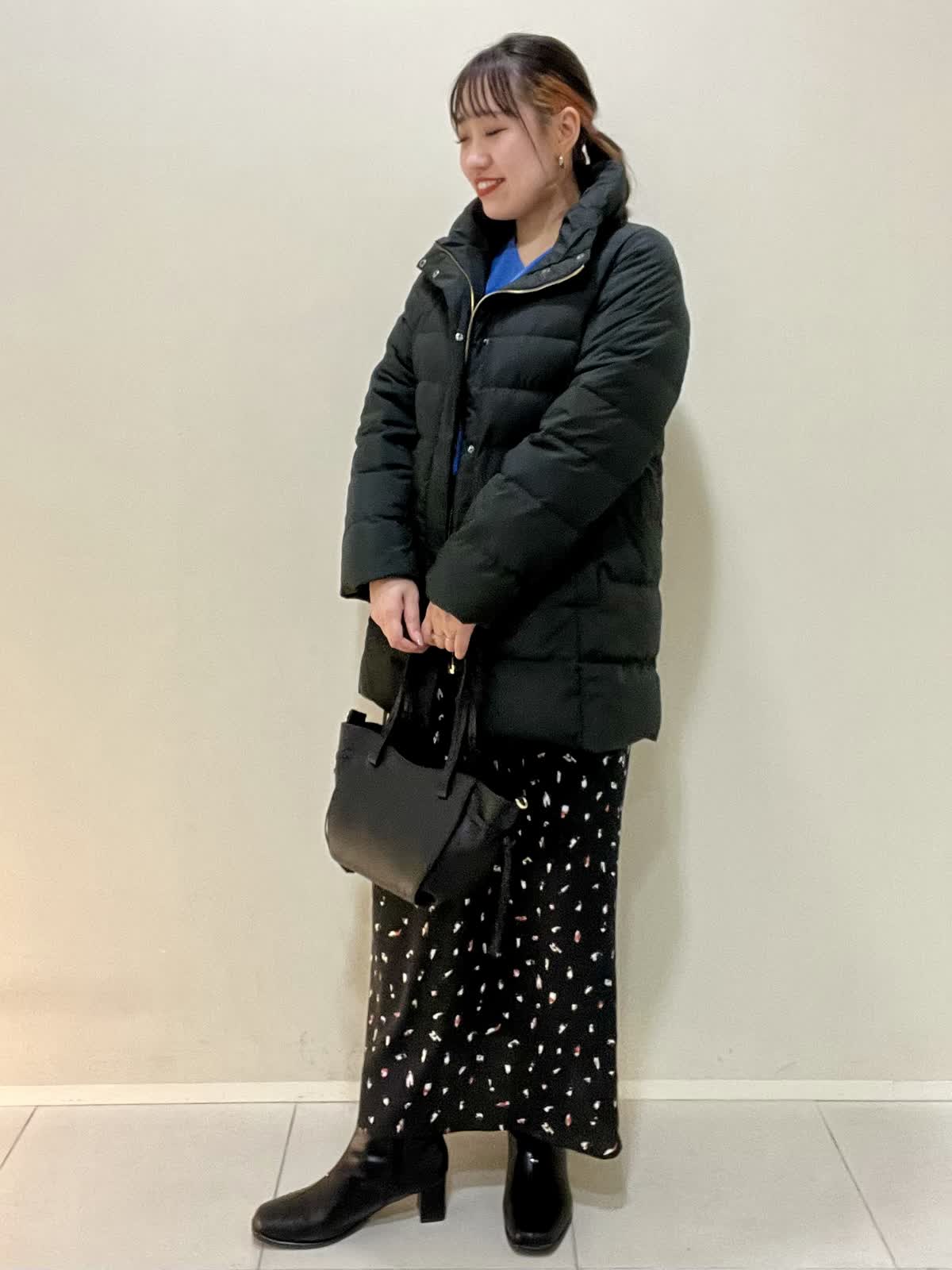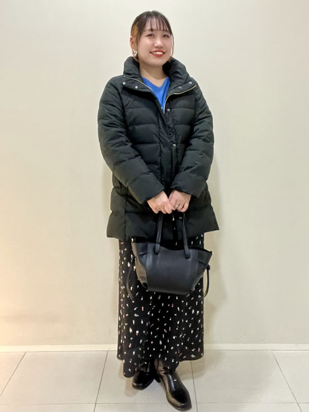 【着用サイズ】ダウン:M ニット:M スカート:フリー 【着用カラー】ダウン:ブラック ニット:ブルー スカート:ブラック とても暖かいダウンで綺麗めコーディネートです。ダウン90%、フェザー10%の暖かいダウンは、すっきりシルエットです。フードが取り外し可能で、フードに付いているファー取り外し可能です。長すぎず短すぎずの着丈なので、スカートで合わせてもすっきり着ることができました。重たい感じもありませんが、フードを取るとより軽く感じました。首元まで暖かく、袖口はゴムが入っているので風を通しにくいです。寒い日も1着あれば安心なダウンコートです。