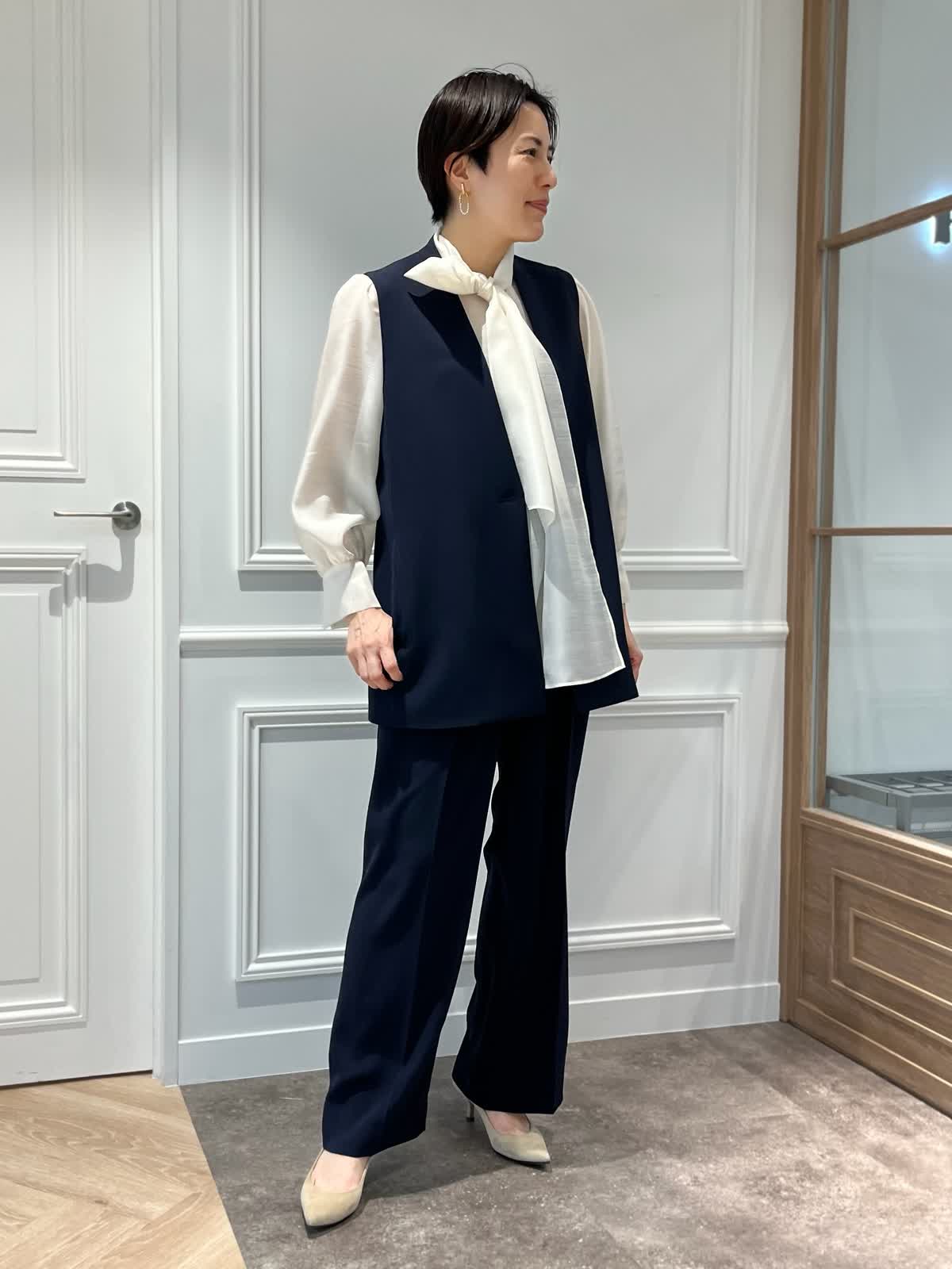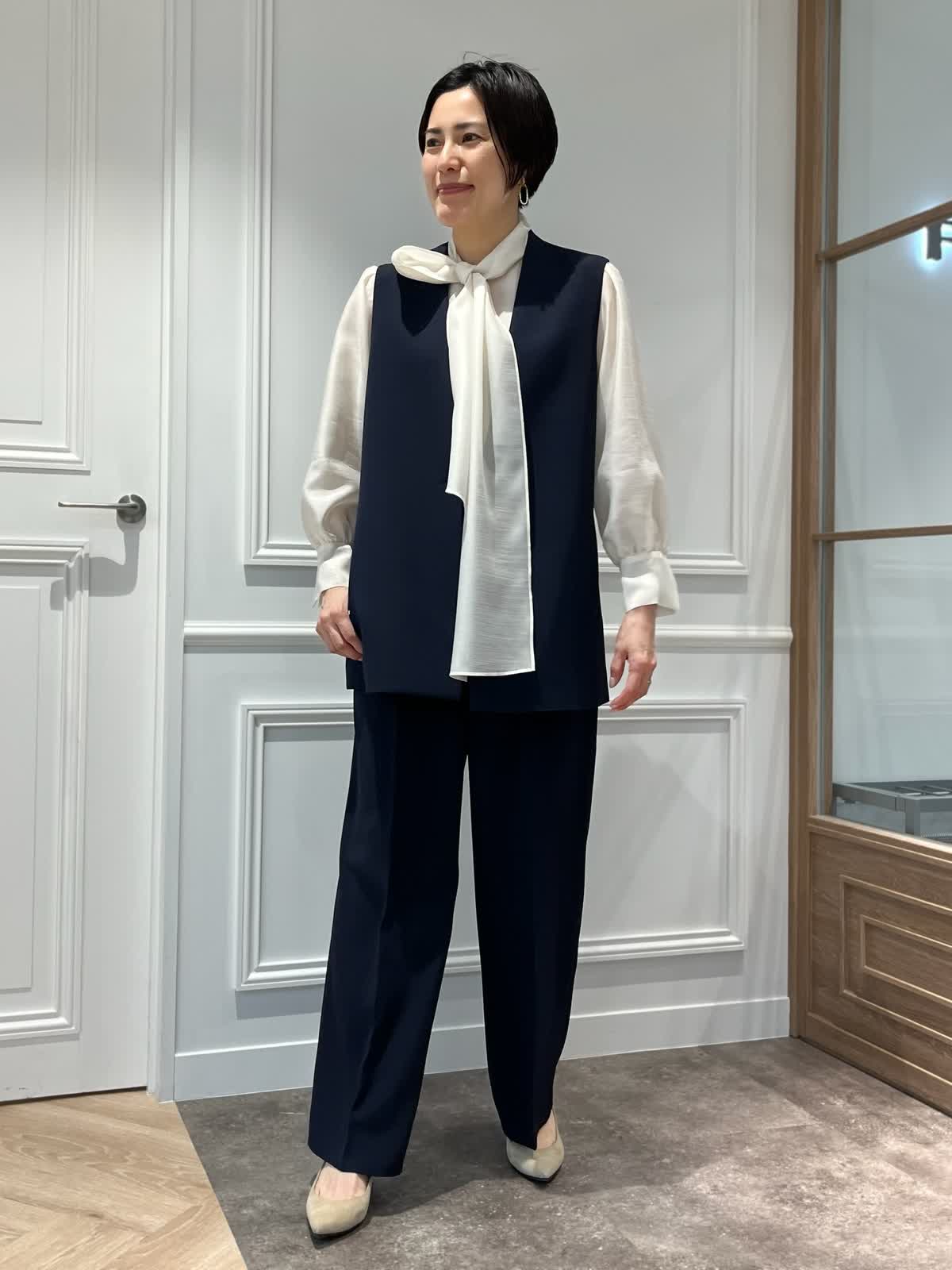 【着用カラー・サイズ】ジレ・パンツ:ネイビー ブラウス:アイボリー 全て9号 オールシーズン活躍するマルチセットアップシリーズのジレとセミワイドパンツコーディネート 春先のイベントにぴったりのシアーボウタイブラウスで華やかな印象に。長めの着丈のジレはきちんと感とスタイルアップ効果を兼ね揃えていて、襟もないのでインナーが合わせやすい優れものです。