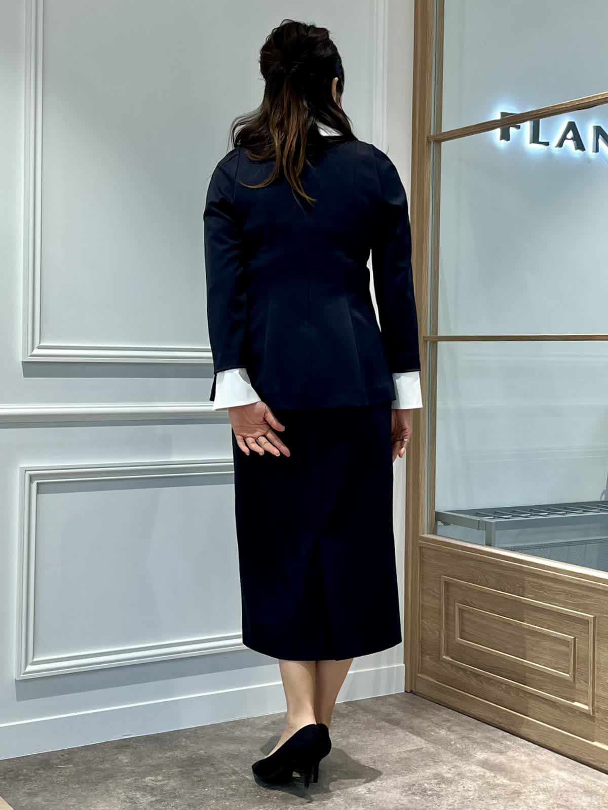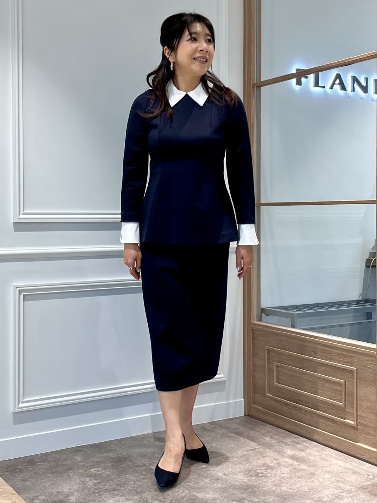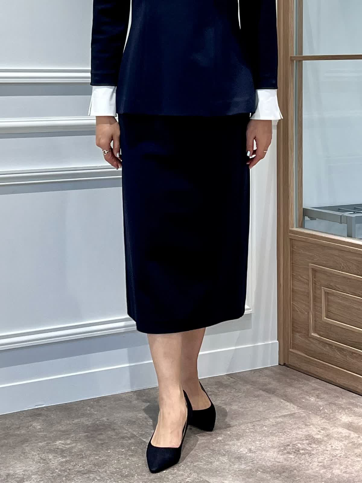 【着用カラー・サイズ】上下共にネイビー・9号 セレモニーやお呼ばれにおすすめのブラウスセットアップ。ストレッチがきいているので、フィットしたシルエットでも着心地は快適です。座っていても膝が隠れるスカート丈もポイント。1セットあるといざというときに便利なシリーズです。