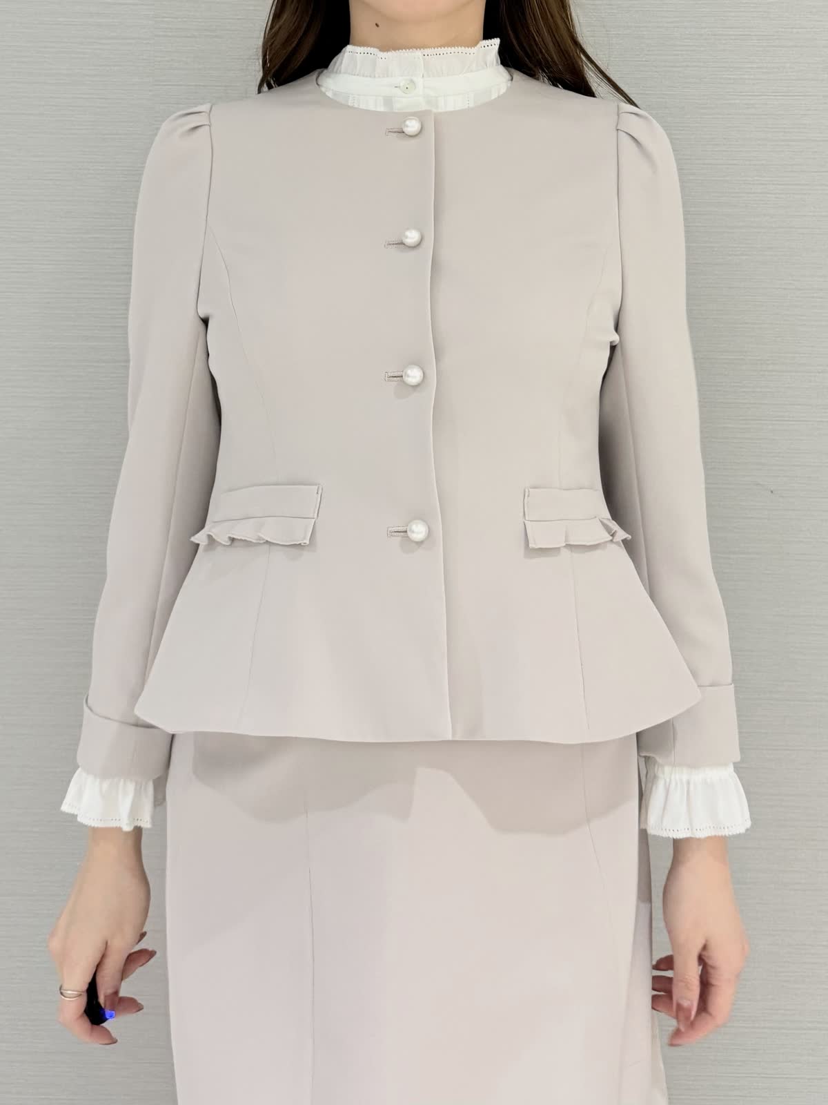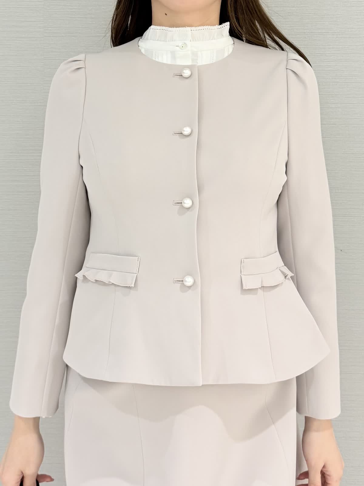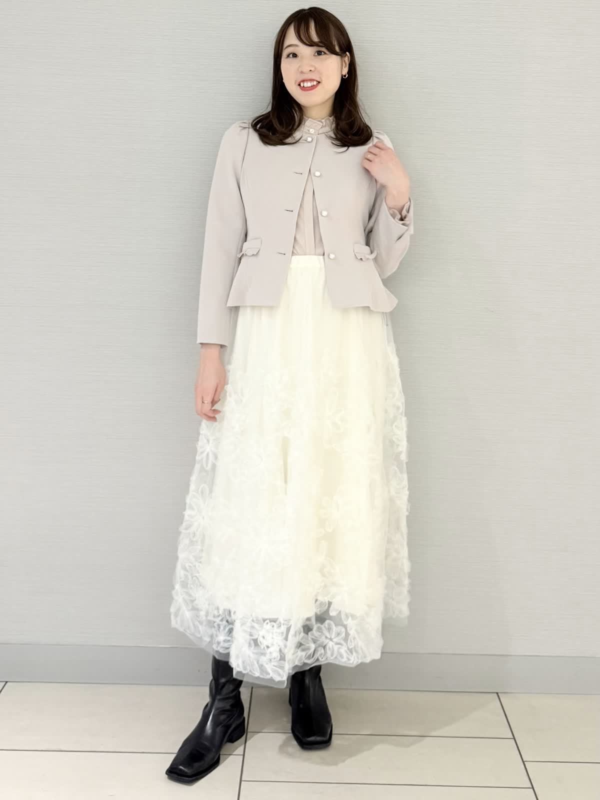 【着用サイズ/カラー】ジャケット:9号/グレーブラウス:9号ピンクスカート:9号/オフホワイト《お食事などにおすすめなジャケットコーディネート。セットアップにせず、華やかなスカートを合わせるとお食事やセミフォーマルなどにもお召しいただけます。ブラウスをジャケットの色味と合わせたのもポイントです。》