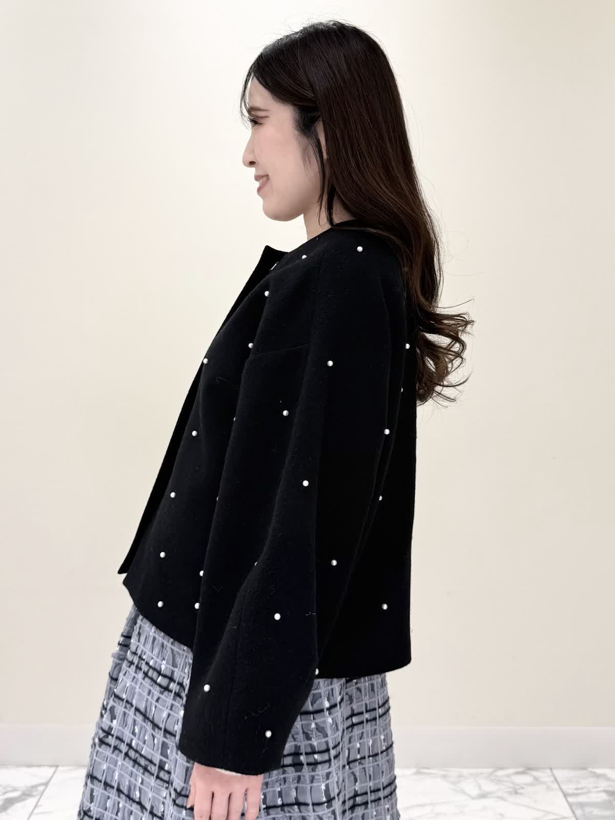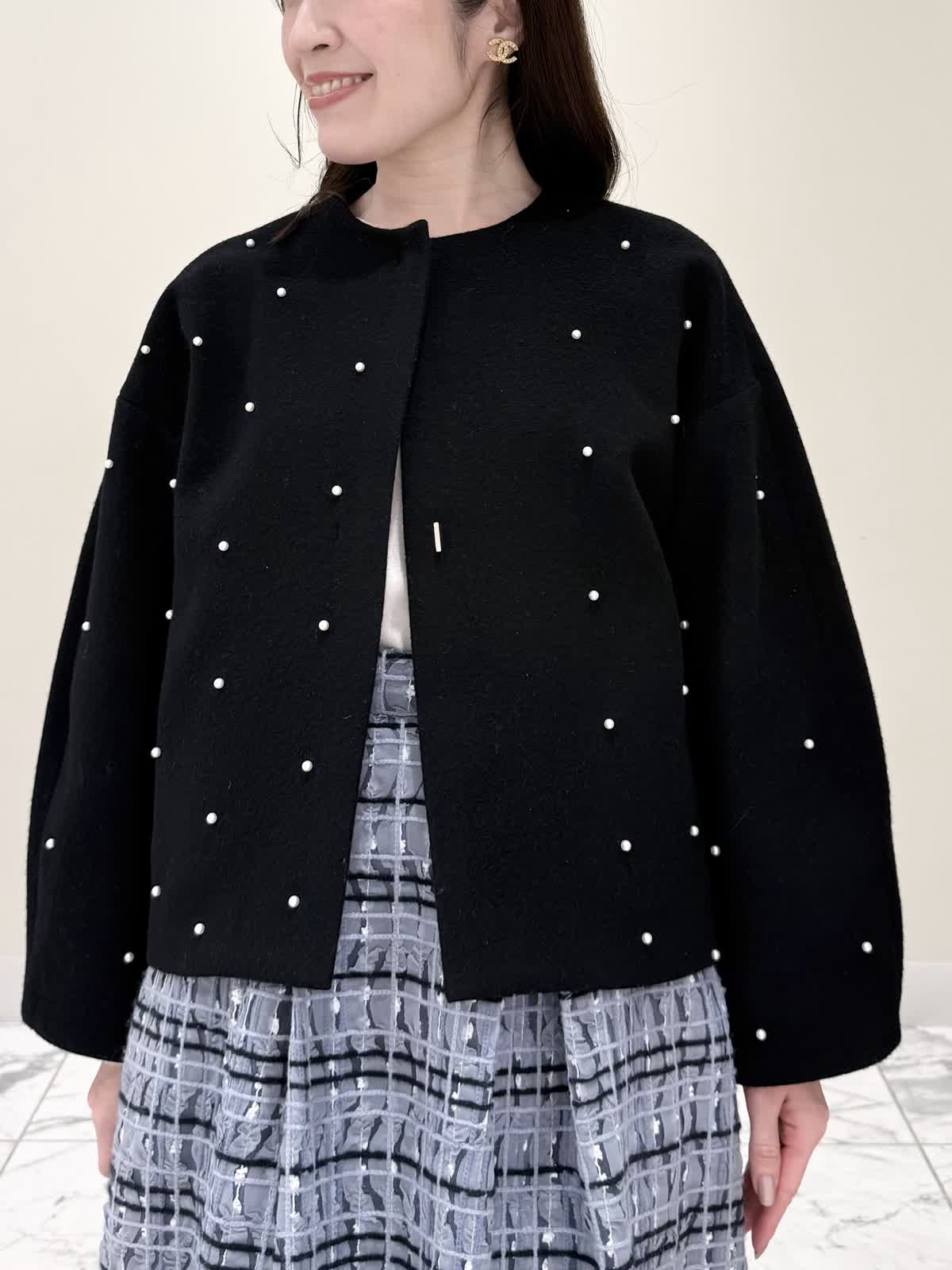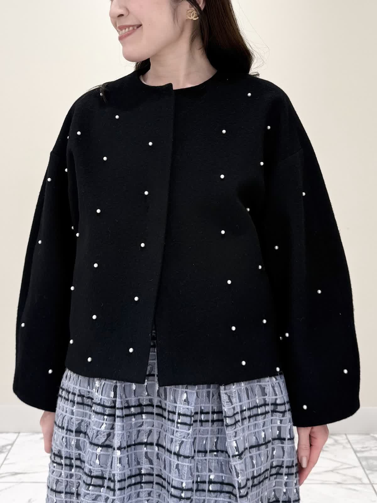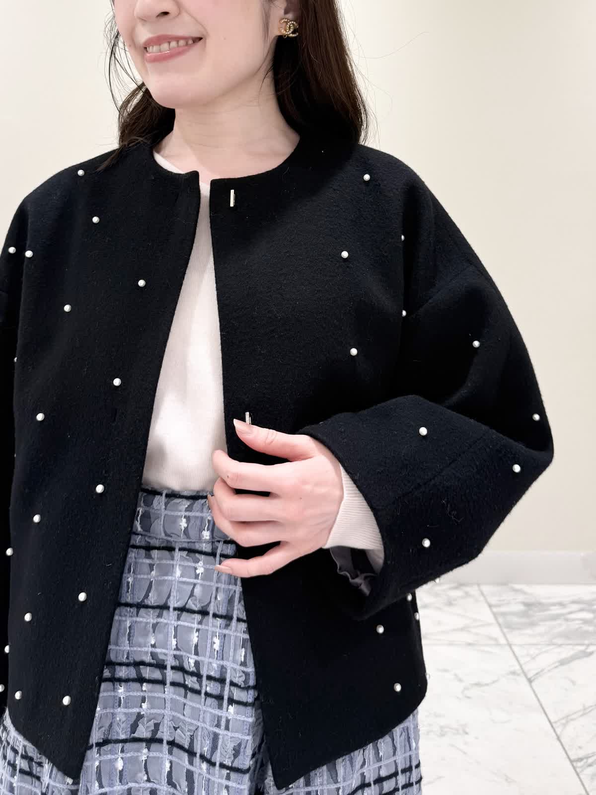 【着用サイズ/カラー】コート:7号/ブラック ニット:9号/オフホワイト スカート:9号/サックス ブラック×サックスの大人可愛いコーディネート♪コートは贅沢にパールを散りばめたコートはとっても軽いウール生地で触り心地、着心地共に◎ラグランスリーブなのでインナーに着るものは袖にボリュームや装飾があっても着やすいです。アームホール、身幅共にゆったりめなので、コンパクトに着たい方は1サイズ小さめでも◯インナーはシンプルなVネックニット。柔らかいウール生地で着心地◎厚手すぎず薄手すぎず、インナーにピッタリな生地感。ピタッとなりすぎないので、パンツ合わせもおすすめです。合わせはチュール生地にネイビーとサックスの糸やリボンテープでツイードの様な特別な生地のチェック柄スカート。後ろは柔らかいゴム仕様なのでいつものサイズで大丈夫です。着用は9号ですが、色違いで7号を着用しいつもの7号サイズだったので購入する際は5号にします。裾に抜け感が出るように裏地は表地より少し短めなので小柄な方にも着やすいです。