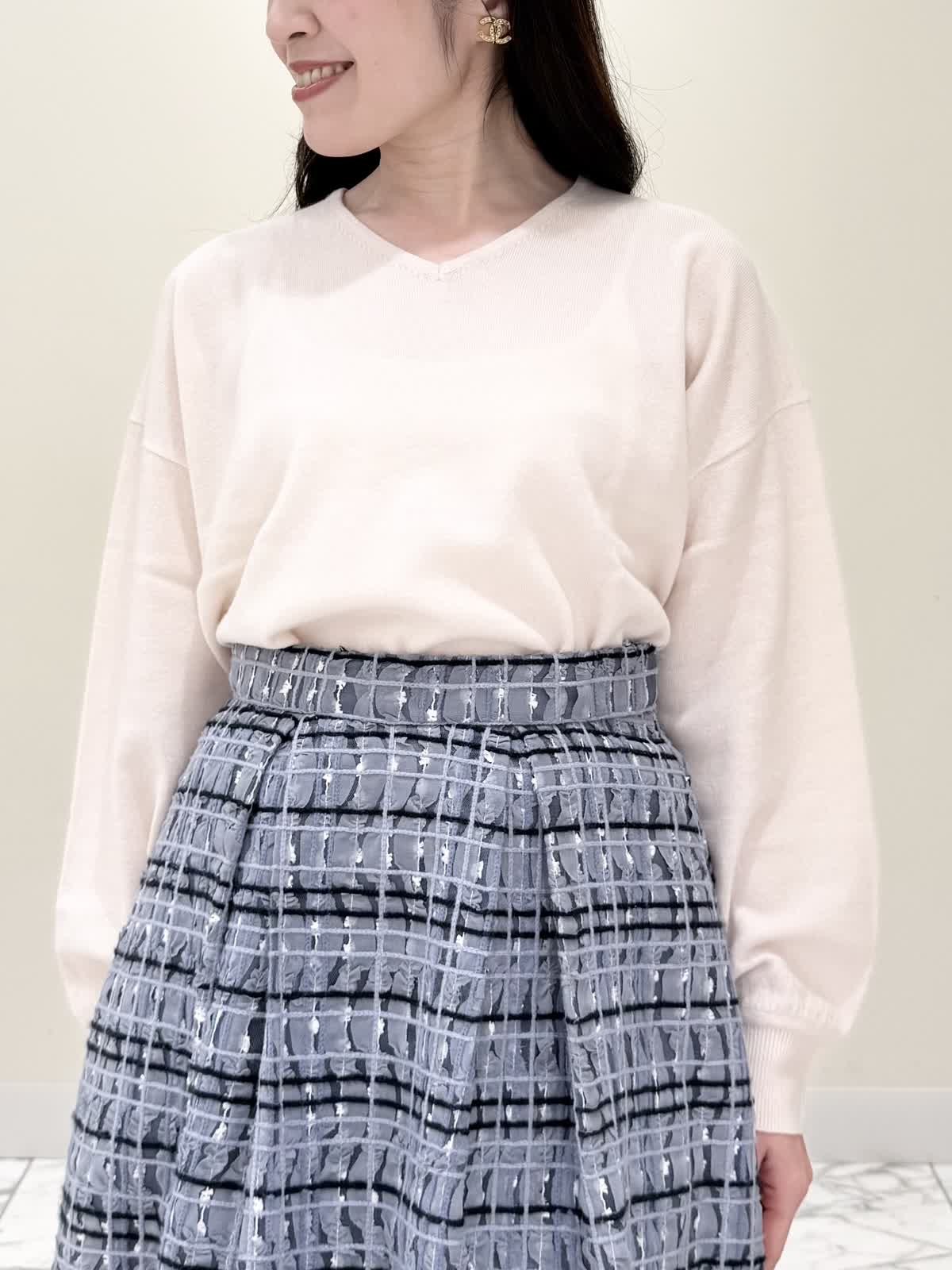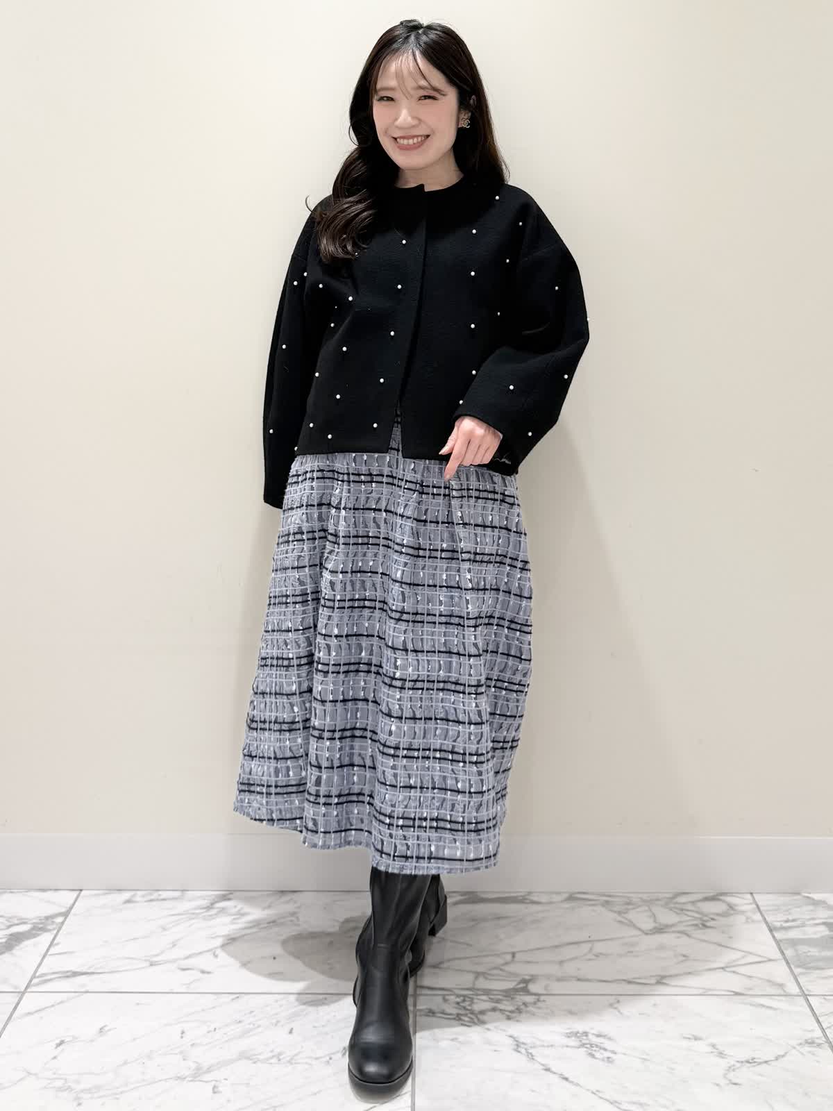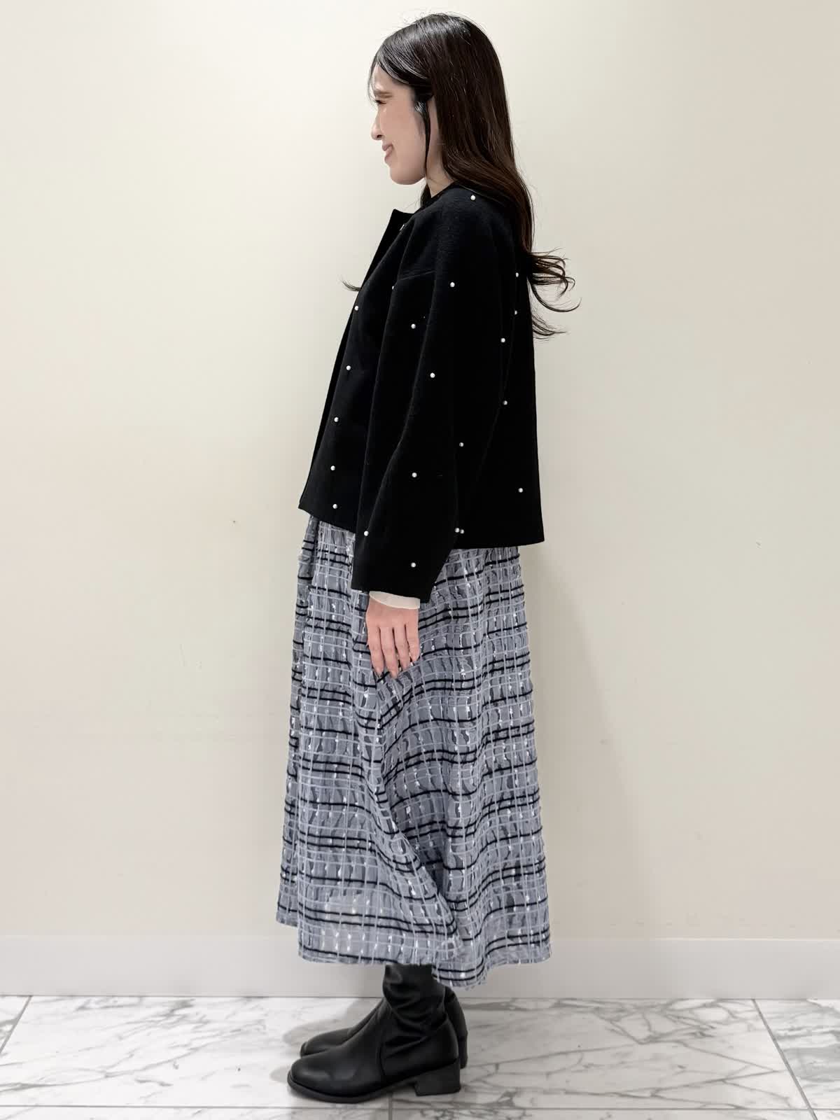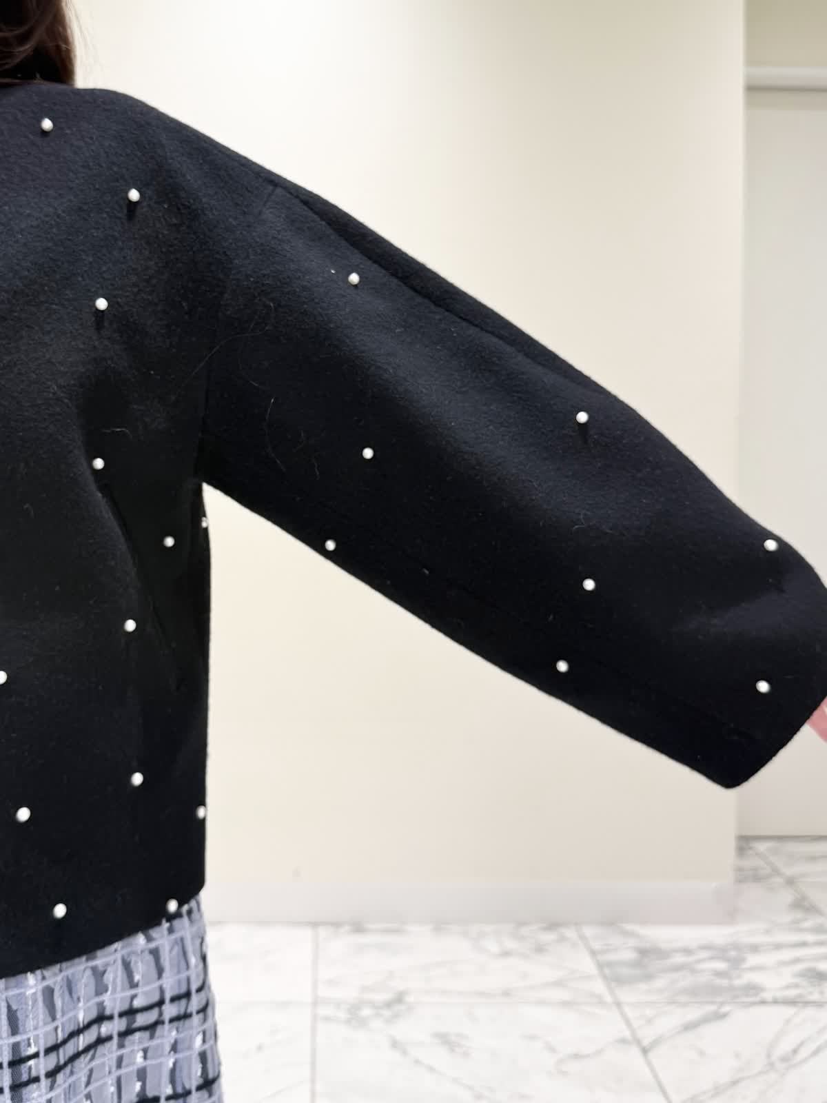 【着用サイズ/カラー】コート:7号/ブラック ニット:9号/オフホワイト スカート:9号/サックス ブラック×サックスの大人可愛いコーディネート♪コートは贅沢にパールを散りばめたコートはとっても軽いウール生地で触り心地、着心地共に◎ラグランスリーブなのでインナーに着るものは袖にボリュームや装飾があっても着やすいです。アームホール、身幅共にゆったりめなので、コンパクトに着たい方は1サイズ小さめでも◯インナーはシンプルなVネックニット。柔らかいウール生地で着心地◎厚手すぎず薄手すぎず、インナーにピッタリな生地感。ピタッとなりすぎないので、パンツ合わせもおすすめです。合わせはチュール生地にネイビーとサックスの糸やリボンテープでツイードの様な特別な生地のチェック柄スカート。後ろは柔らかいゴム仕様なのでいつものサイズで大丈夫です。着用は9号ですが、色違いで7号を着用しいつもの7号サイズだったので購入する際は5号にします。裾に抜け感が出るように裏地は表地より少し短めなので小柄な方にも着やすいです。