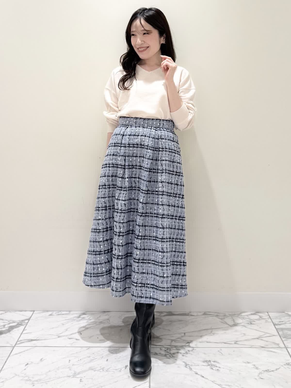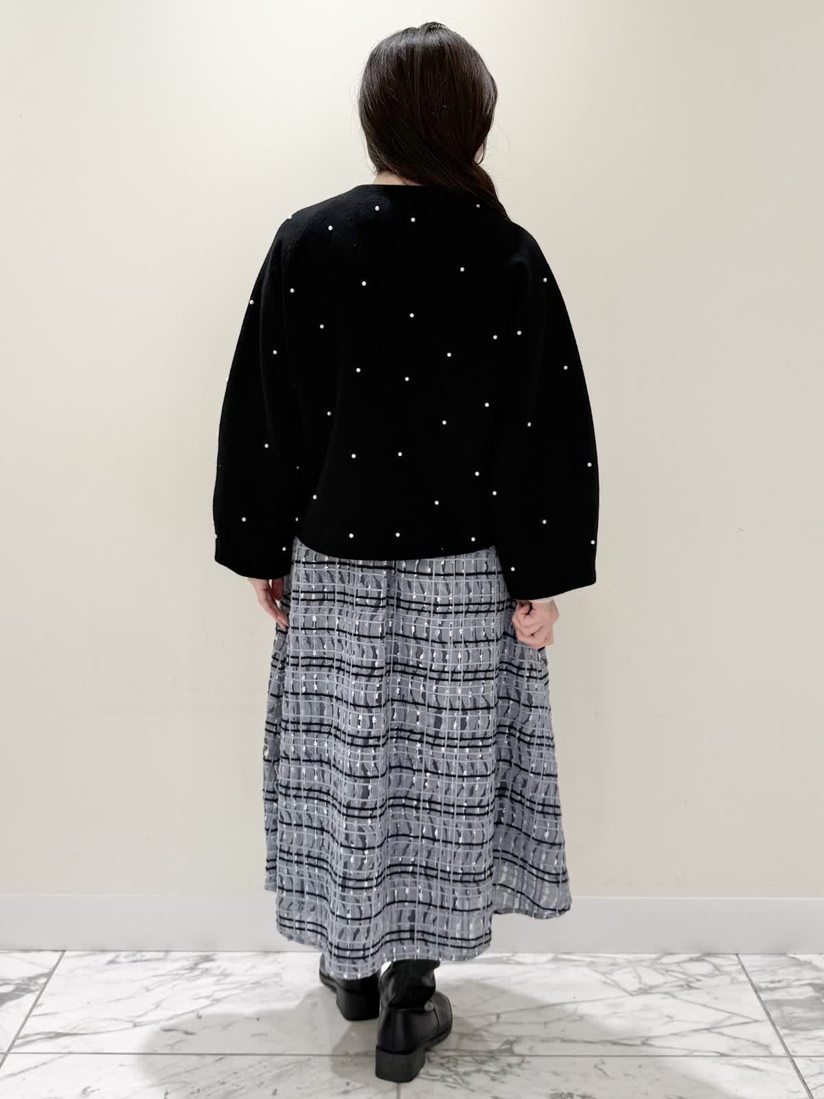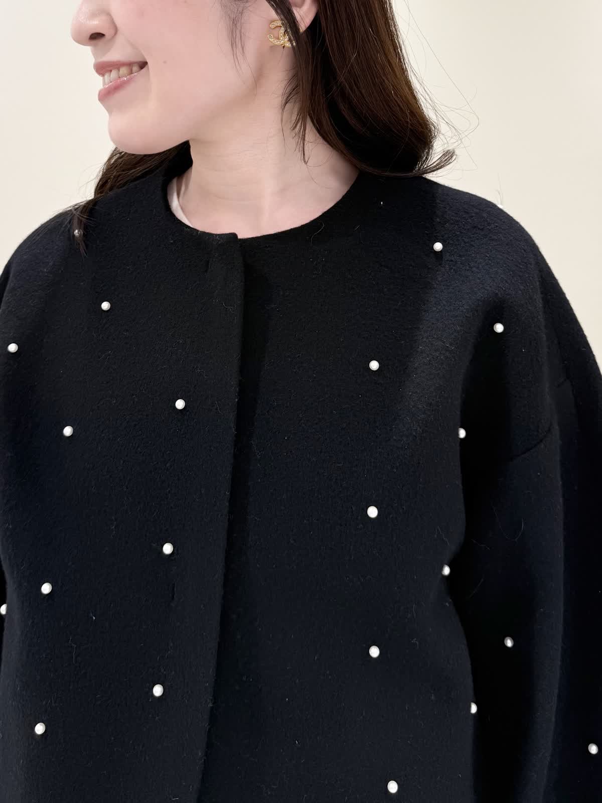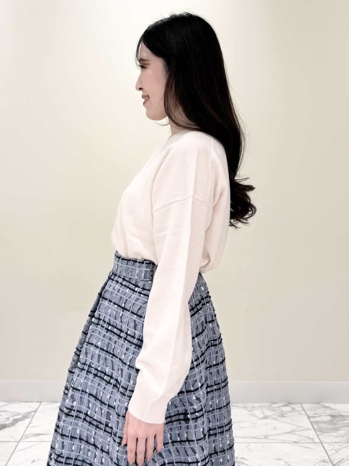 【着用サイズ/カラー】コート:7号/ブラック ニット:9号/オフホワイト スカート:9号/サックス ブラック×サックスの大人可愛いコーディネート♪コートは贅沢にパールを散りばめたコートはとっても軽いウール生地で触り心地、着心地共に◎ラグランスリーブなのでインナーに着るものは袖にボリュームや装飾があっても着やすいです。アームホール、身幅共にゆったりめなので、コンパクトに着たい方は1サイズ小さめでも◯インナーはシンプルなVネックニット。柔らかいウール生地で着心地◎厚手すぎず薄手すぎず、インナーにピッタリな生地感。ピタッとなりすぎないので、パンツ合わせもおすすめです。合わせはチュール生地にネイビーとサックスの糸やリボンテープでツイードの様な特別な生地のチェック柄スカート。後ろは柔らかいゴム仕様なのでいつものサイズで大丈夫です。着用は9号ですが、色違いで7号を着用しいつもの7号サイズだったので購入する際は5号にします。裾に抜け感が出るように裏地は表地より少し短めなので小柄な方にも着やすいです。