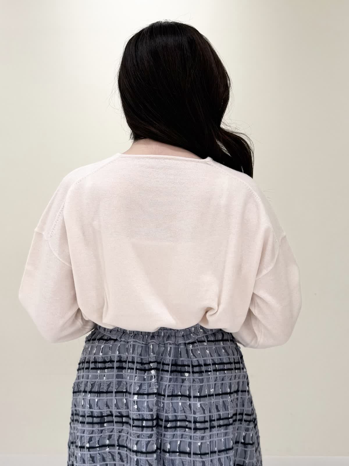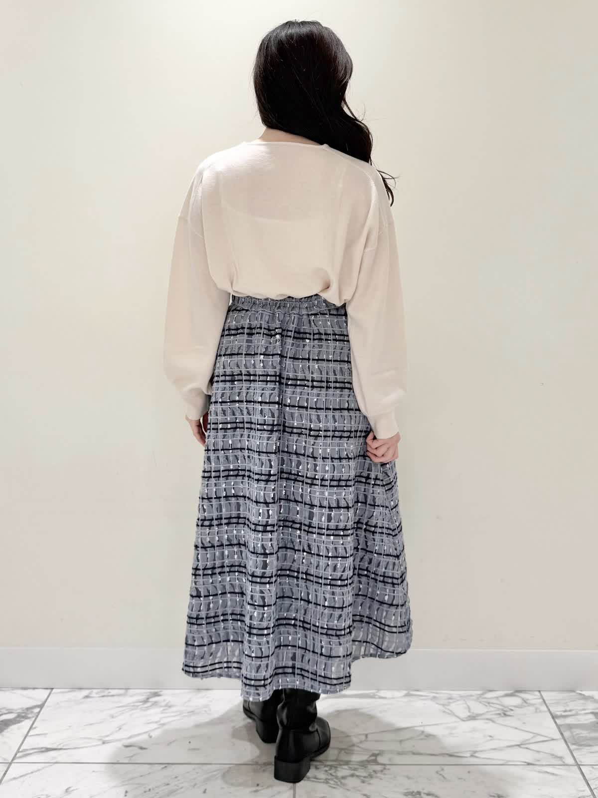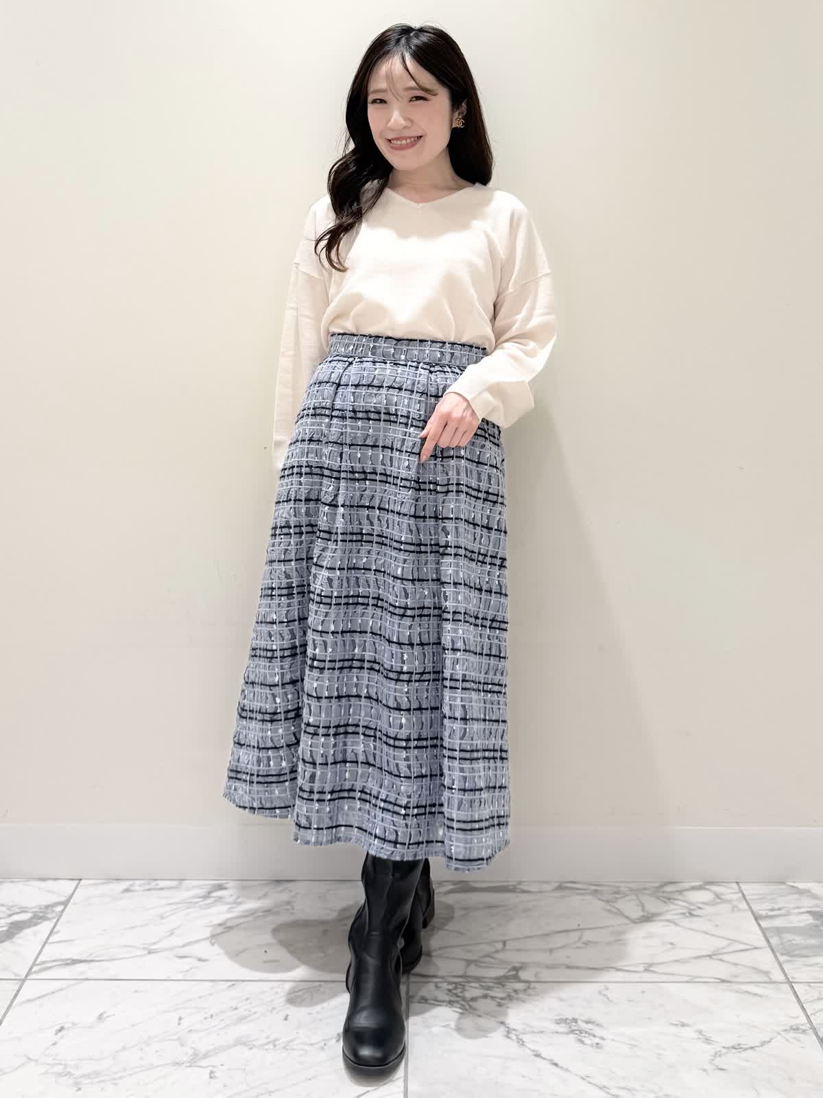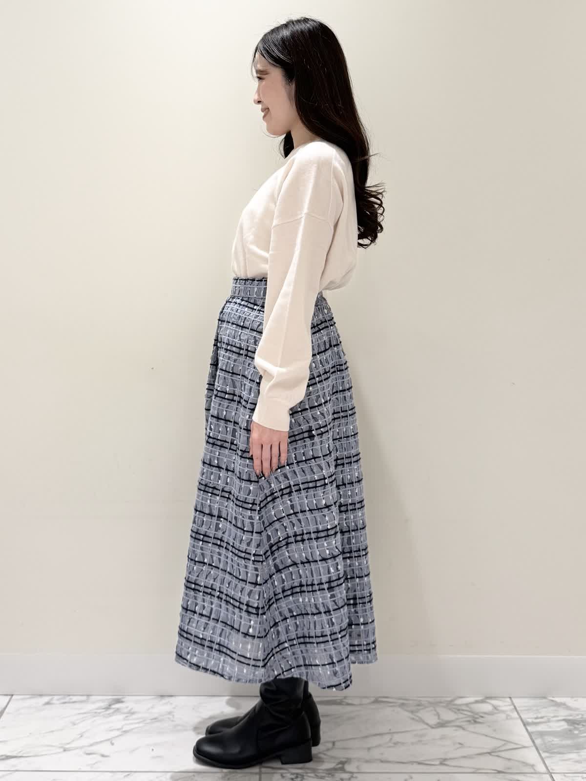 【着用サイズ/カラー】コート:7号/ブラック ニット:9号/オフホワイト スカート:9号/サックス ブラック×サックスの大人可愛いコーディネート♪コートは贅沢にパールを散りばめたコートはとっても軽いウール生地で触り心地、着心地共に◎ラグランスリーブなのでインナーに着るものは袖にボリュームや装飾があっても着やすいです。アームホール、身幅共にゆったりめなので、コンパクトに着たい方は1サイズ小さめでも◯インナーはシンプルなVネックニット。柔らかいウール生地で着心地◎厚手すぎず薄手すぎず、インナーにピッタリな生地感。ピタッとなりすぎないので、パンツ合わせもおすすめです。合わせはチュール生地にネイビーとサックスの糸やリボンテープでツイードの様な特別な生地のチェック柄スカート。後ろは柔らかいゴム仕様なのでいつものサイズで大丈夫です。着用は9号ですが、色違いで7号を着用しいつもの7号サイズだったので購入する際は5号にします。裾に抜け感が出るように裏地は表地より少し短めなので小柄な方にも着やすいです。