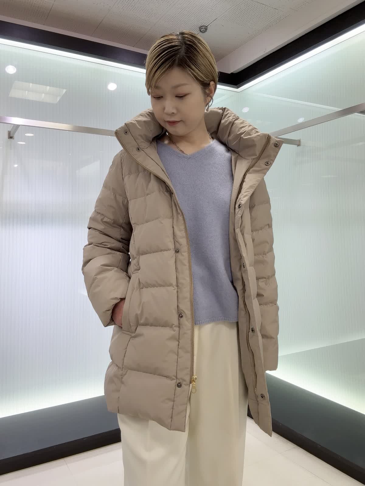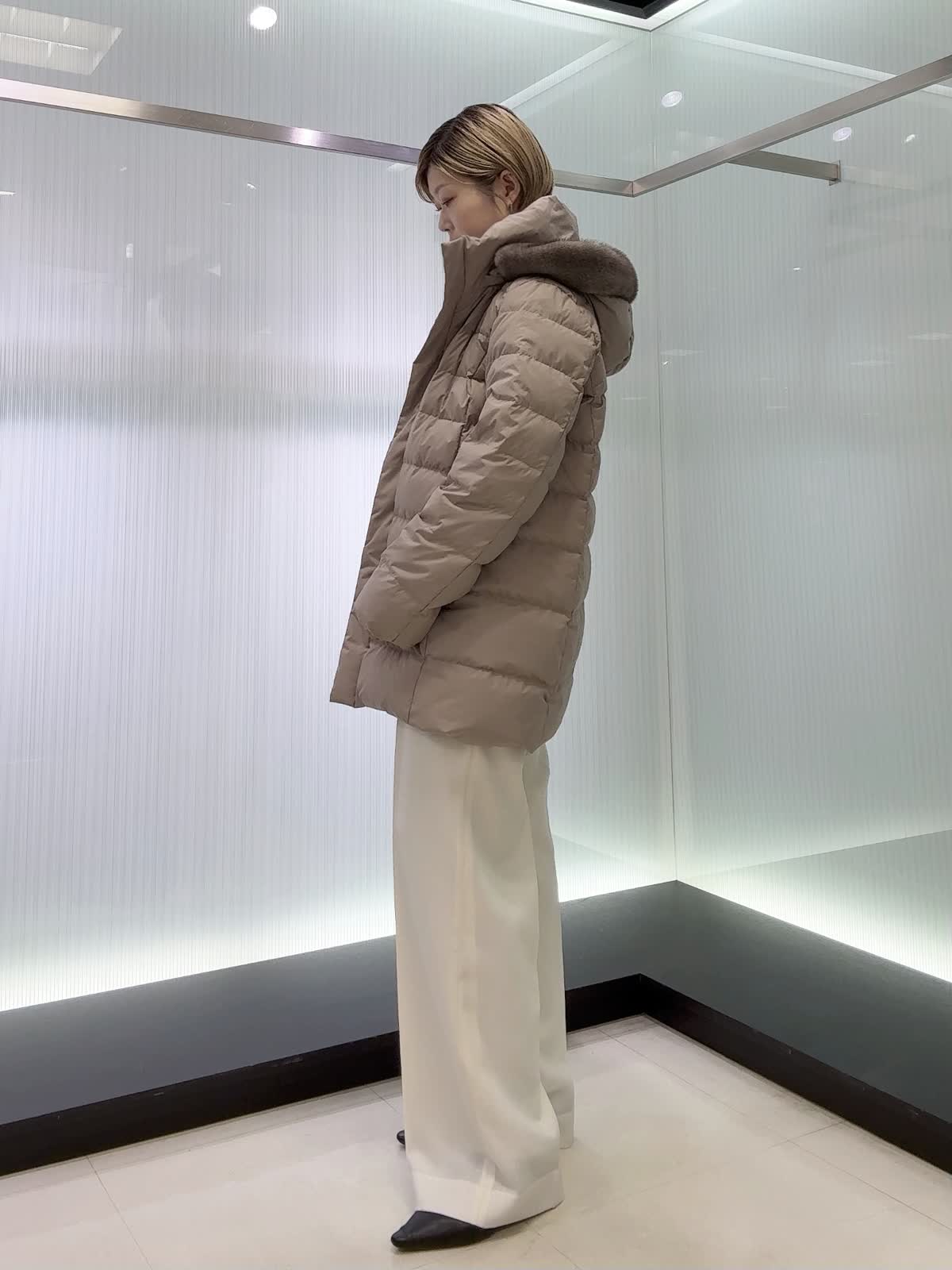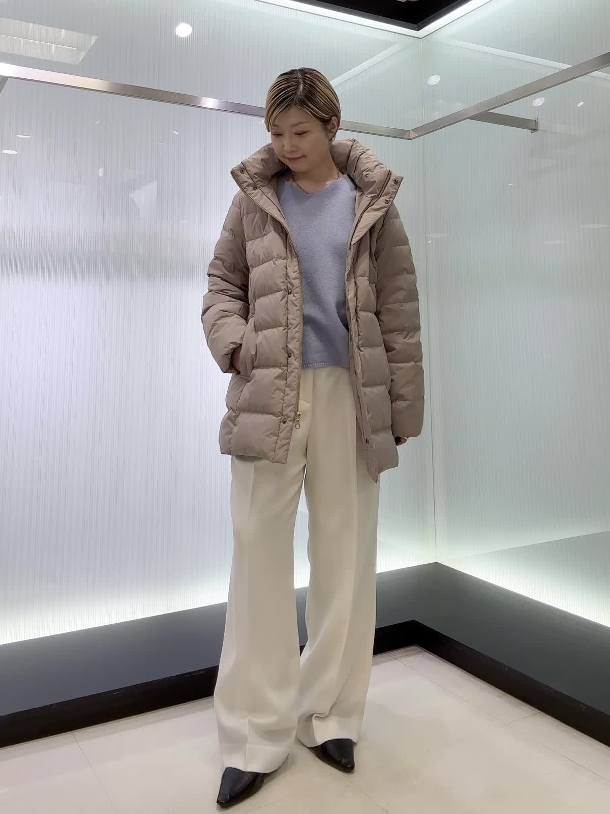 【着用カラー・サイズ】アウター : ベージュ/11号 ニット : サックス/9号 パンツ : オフホワイト/9号 すっきりとしたバランスのダウン♪フード取り外し可能で、袖口の内側はゴムが入っているので冷たい風が入ってこないようになっています。オンオフ問わず着られるアウターなのでおすすめです!