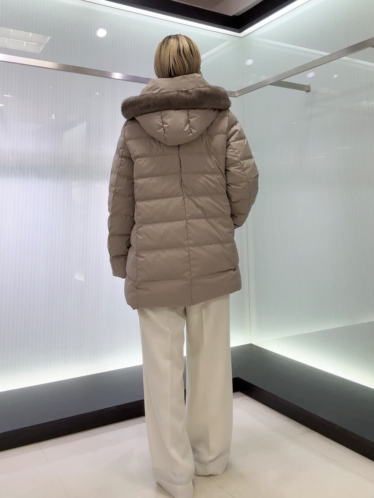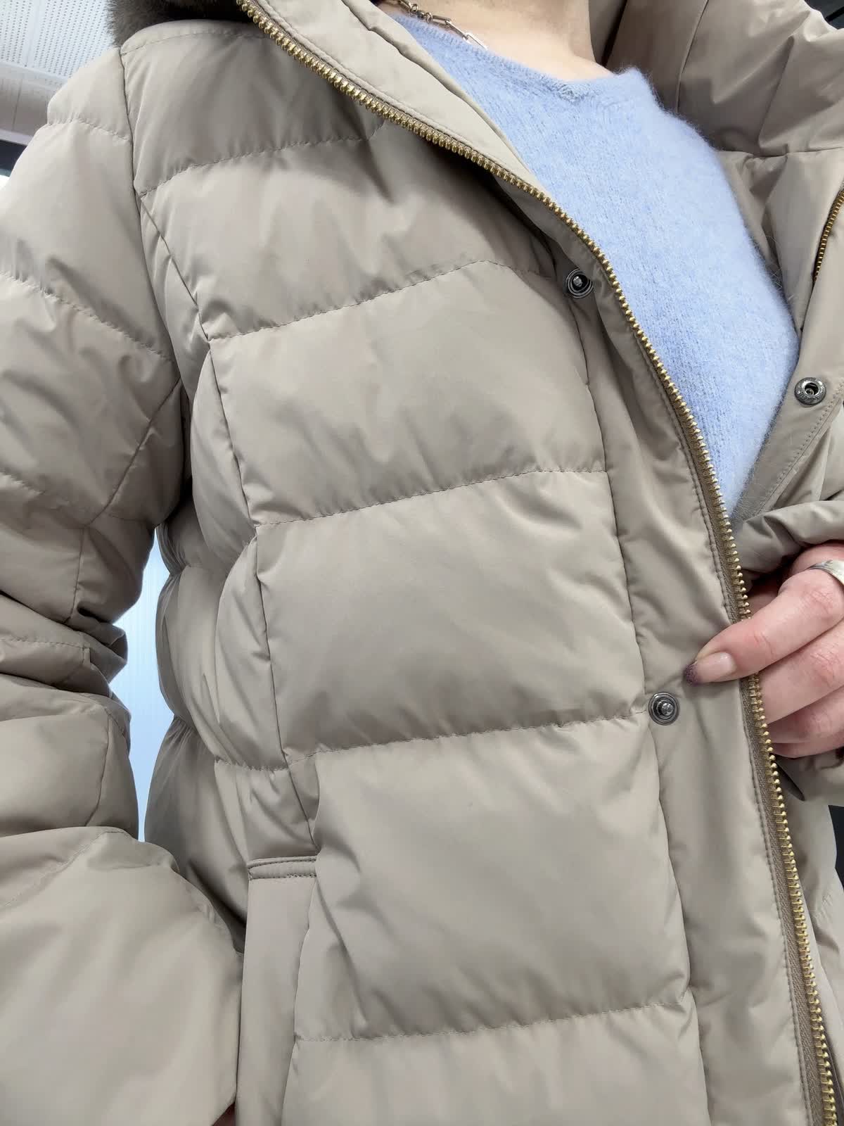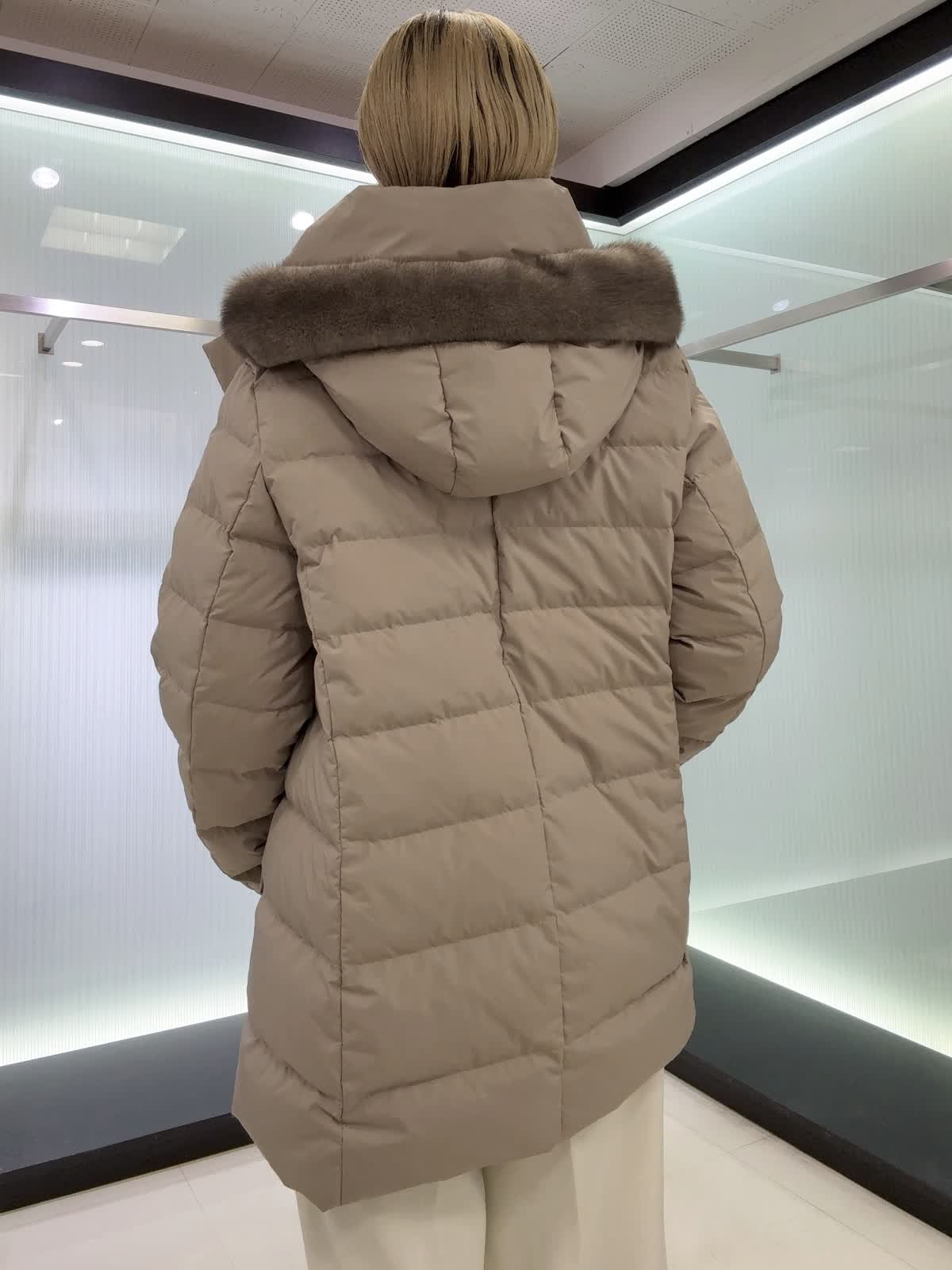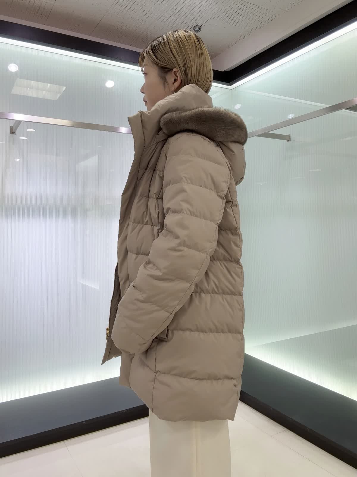 【着用カラー・サイズ】アウター : ベージュ/11号 ニット : サックス/9号 パンツ : オフホワイト/9号 すっきりとしたバランスのダウン♪フード取り外し可能で、袖口の内側はゴムが入っているので冷たい風が入ってこないようになっています。オンオフ問わず着られるアウターなのでおすすめです!
