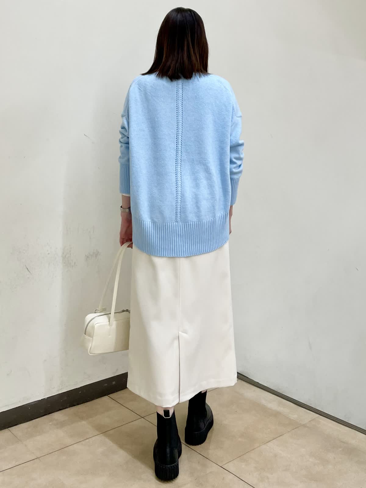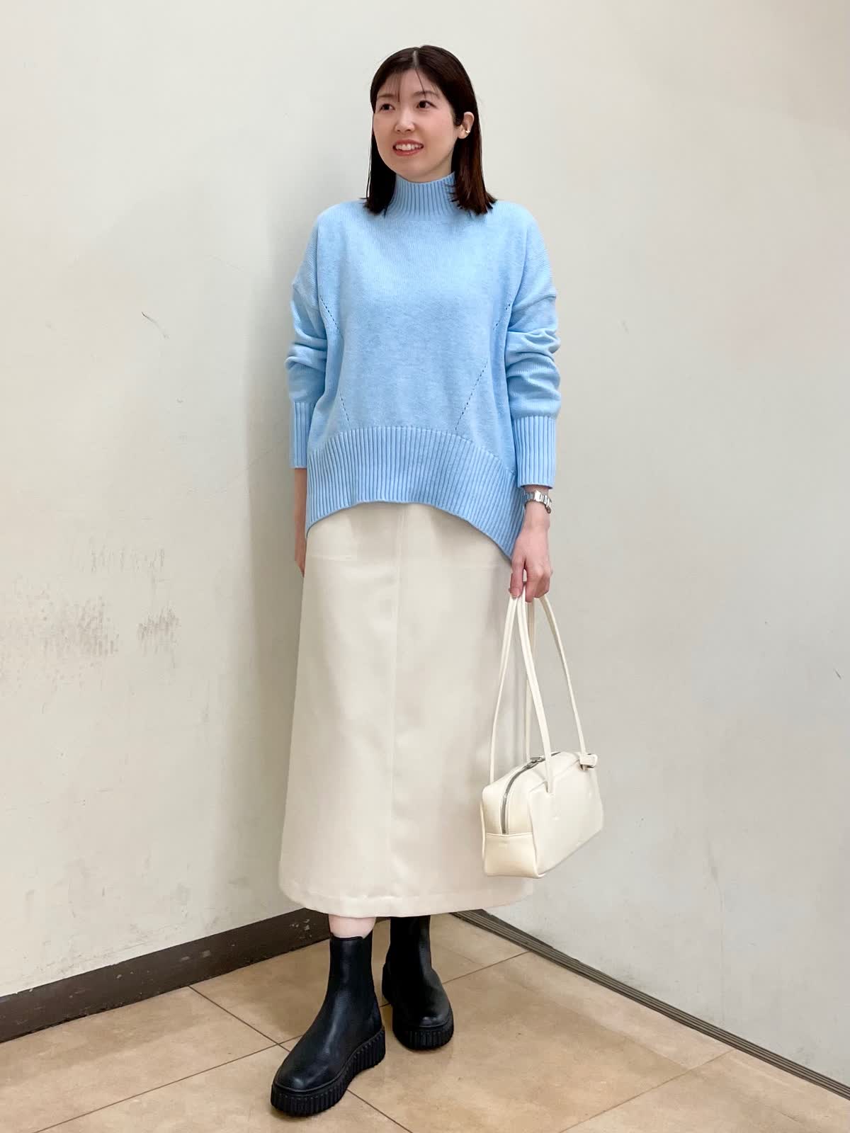 【着用サイズ】ニット:フリー スカート:9号 キレイなカラーが目を惹くハイネックニットはふわっと柔らかな肌触り。前後差をつけたヘムラインで後ろはヒップラインをカバーしてくれる長めのレングスになっています。