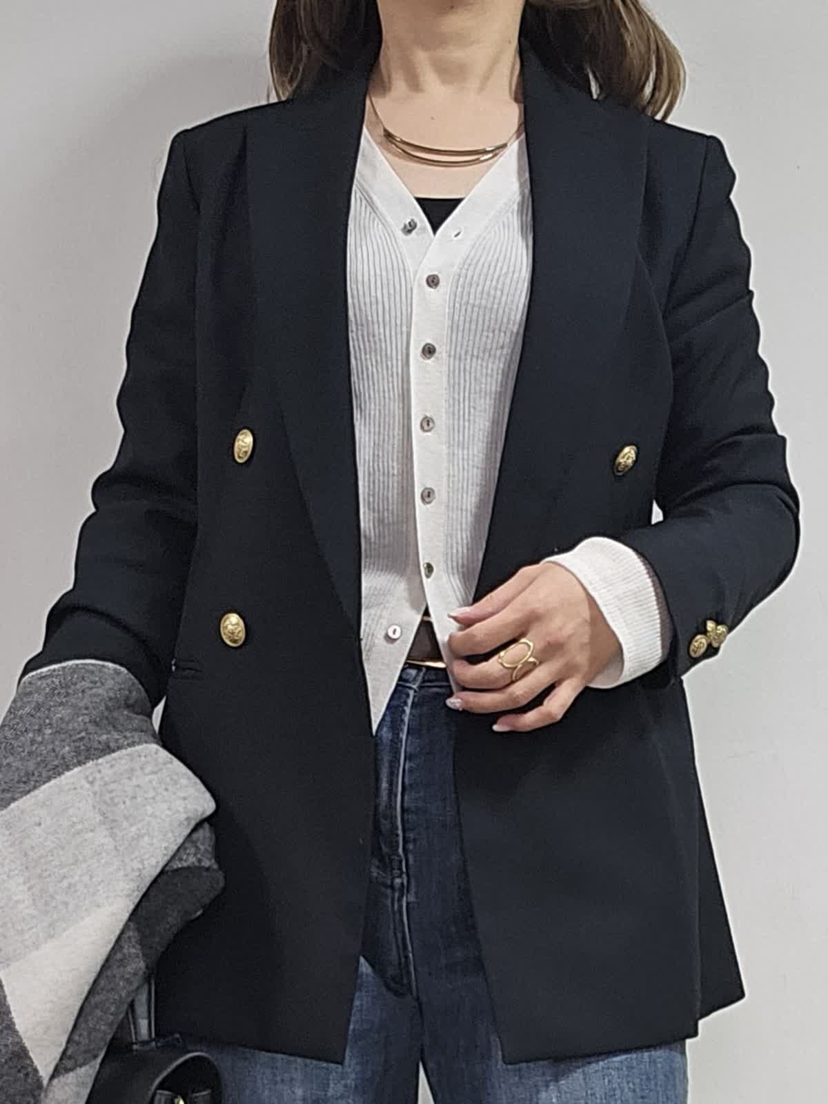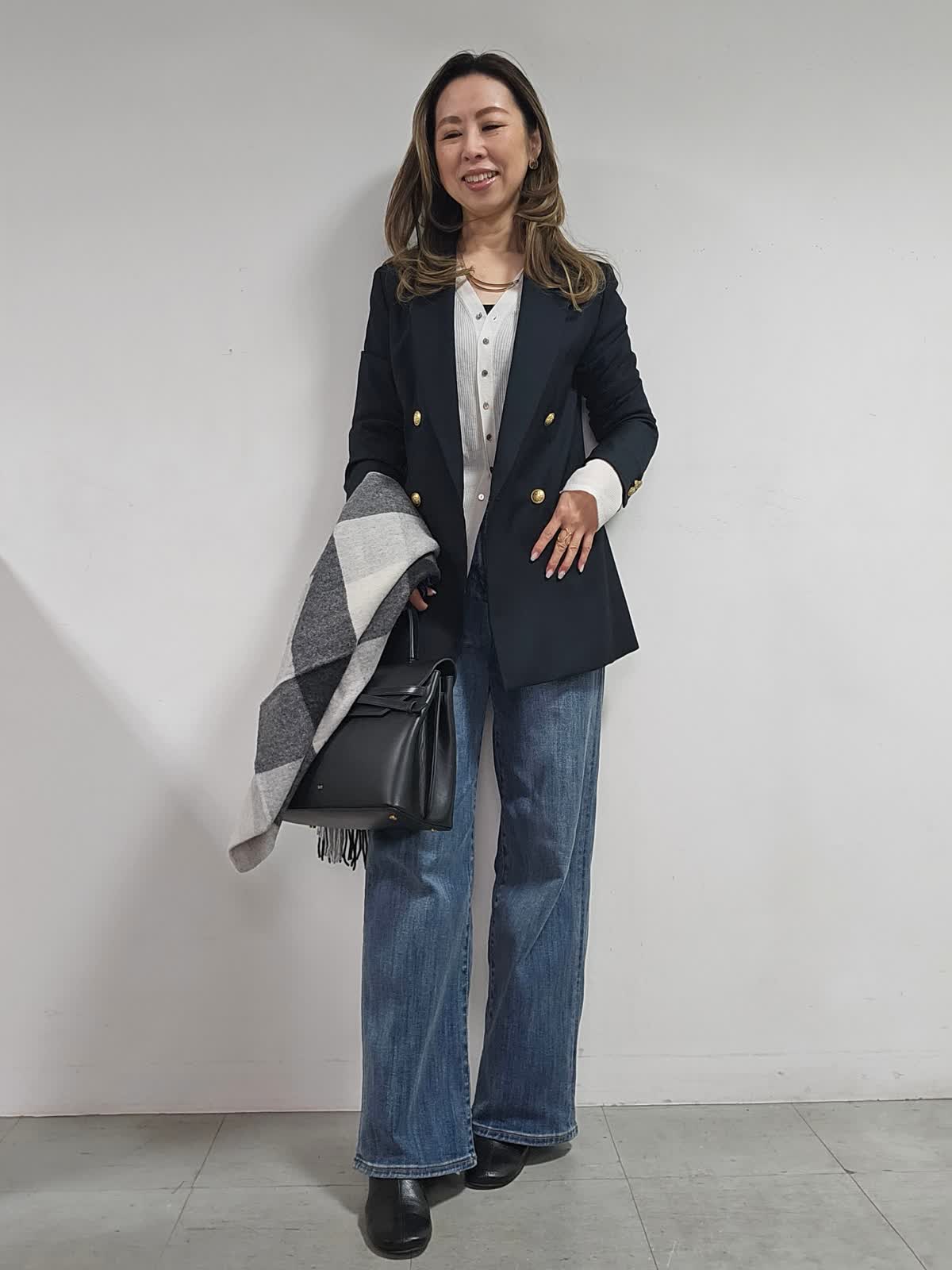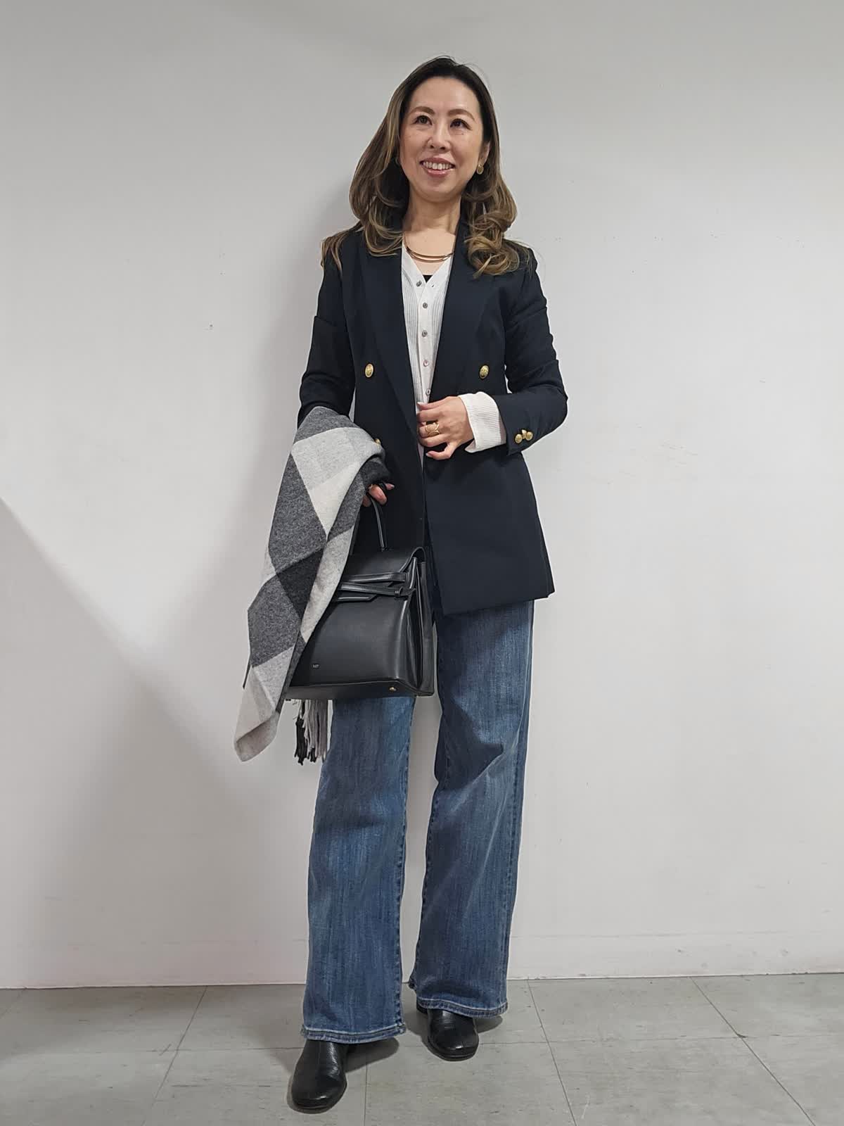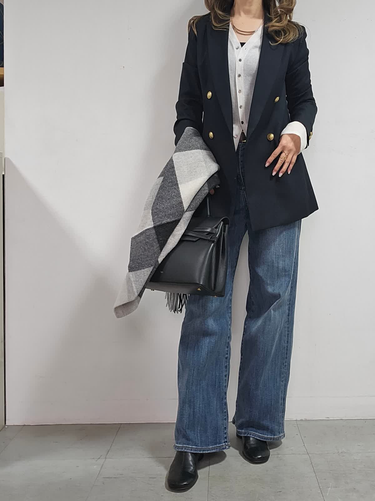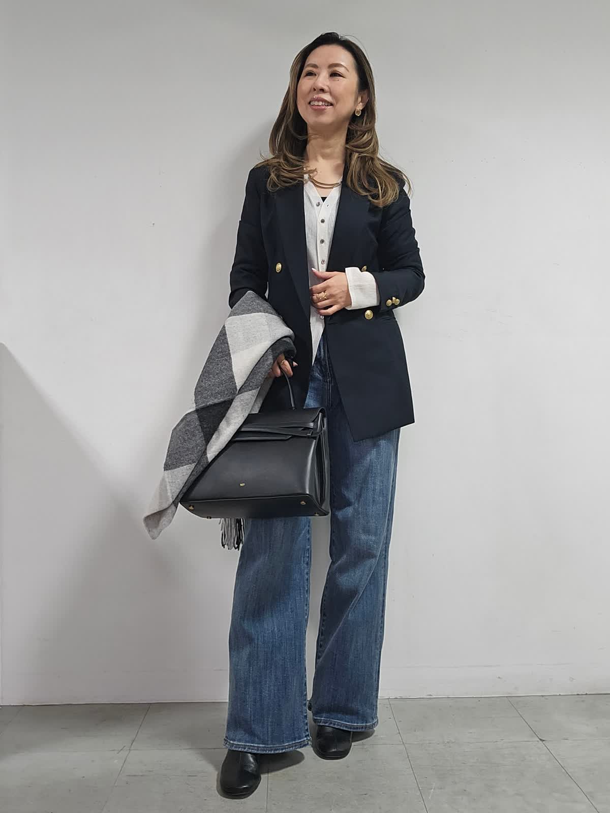 【着用カラー・サイズ】 ジャケット:ネイビー・7号 ニット:オフホワイト・フリー パンツ:インディゴ・7号 ストール:ブラック バッグ:ブラック 上品に見せてくれるだけでなく、タイムレスに活躍する紺ブレザー☆ ひとつ持っておくと、重宝すること間違いなし! トラッドに仕上がるので、クラシカルな着こなしに大人気!