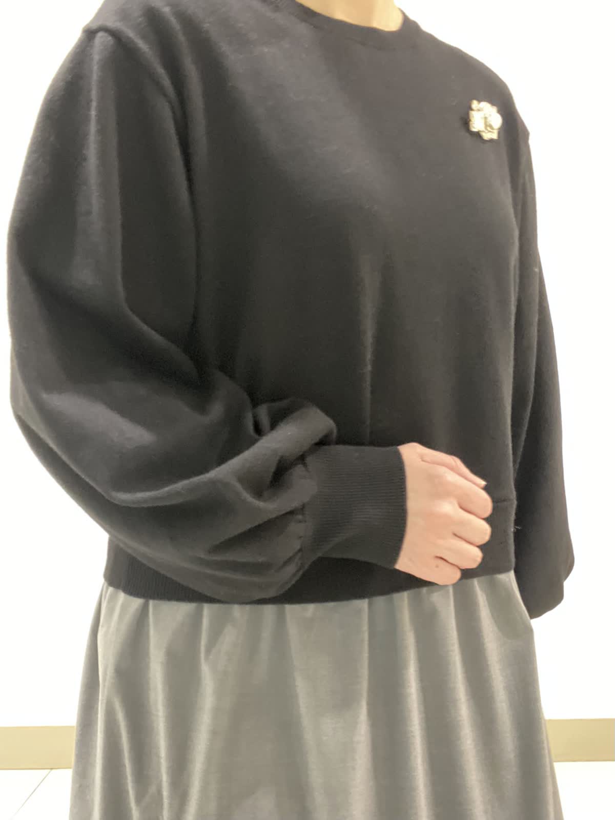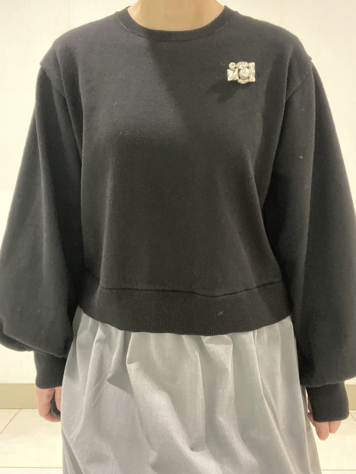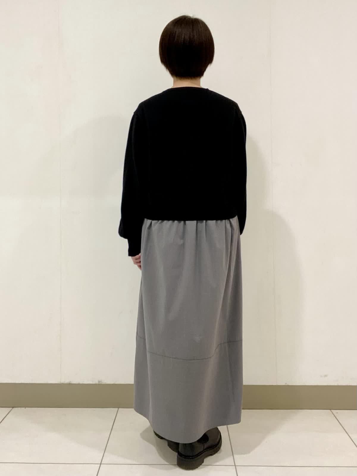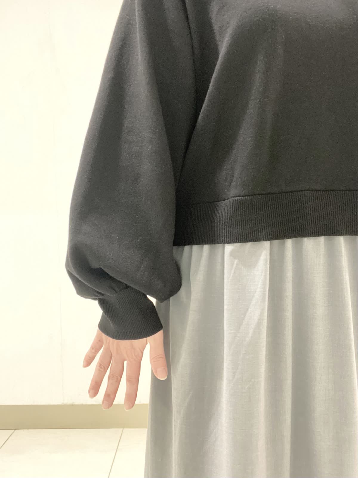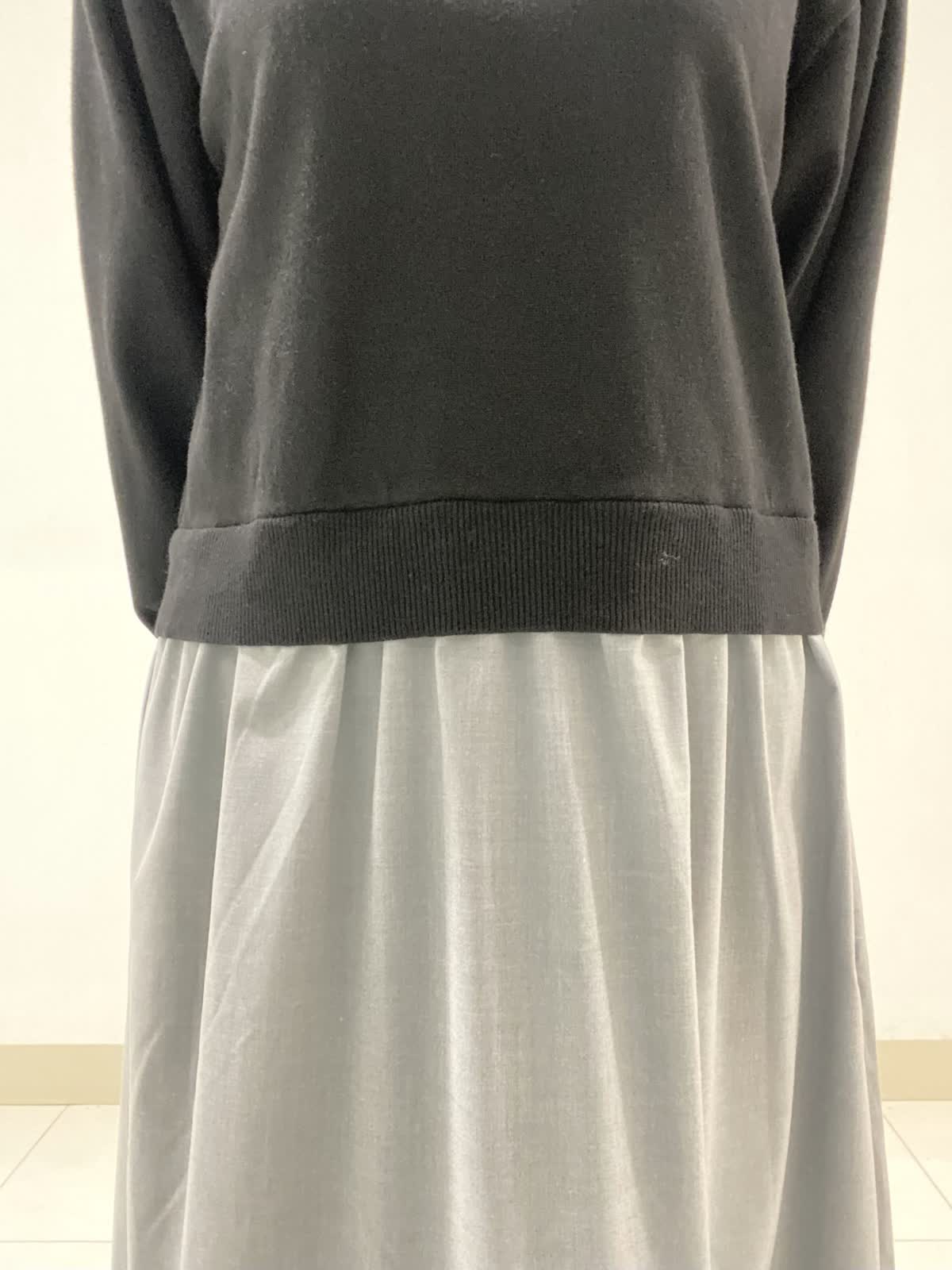【着用サイズ】ワンピース:9号 ニットのプルオーバーにタイプライター素材のスカートを組み合わせた異素材コンビネーションワンピース。シンプルながらもふんわりとしたパフスリーブが大人可愛いデザインになっています。