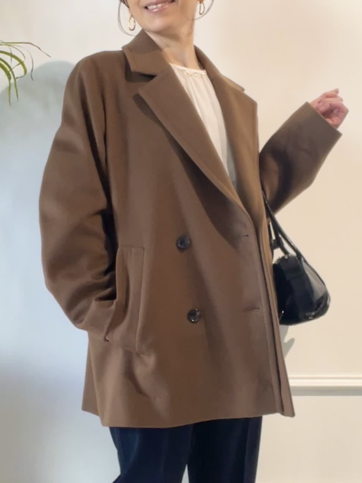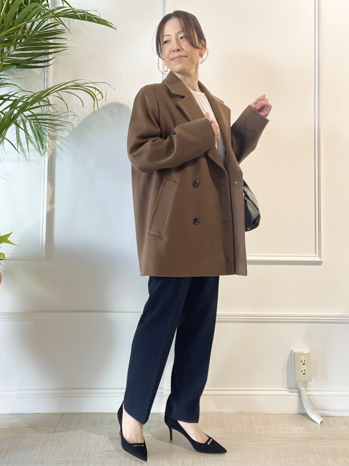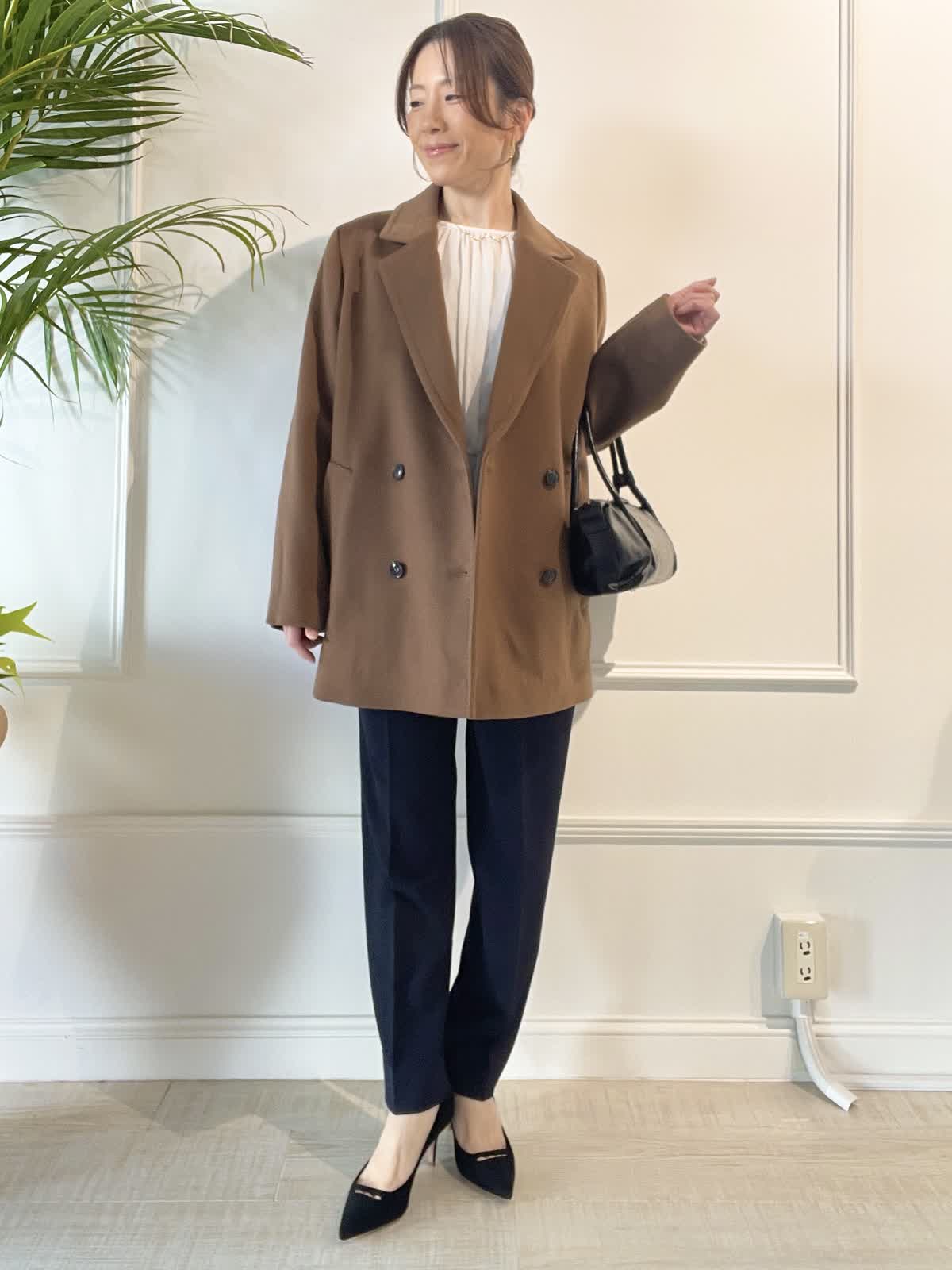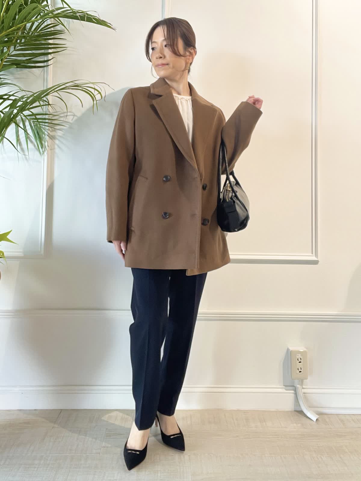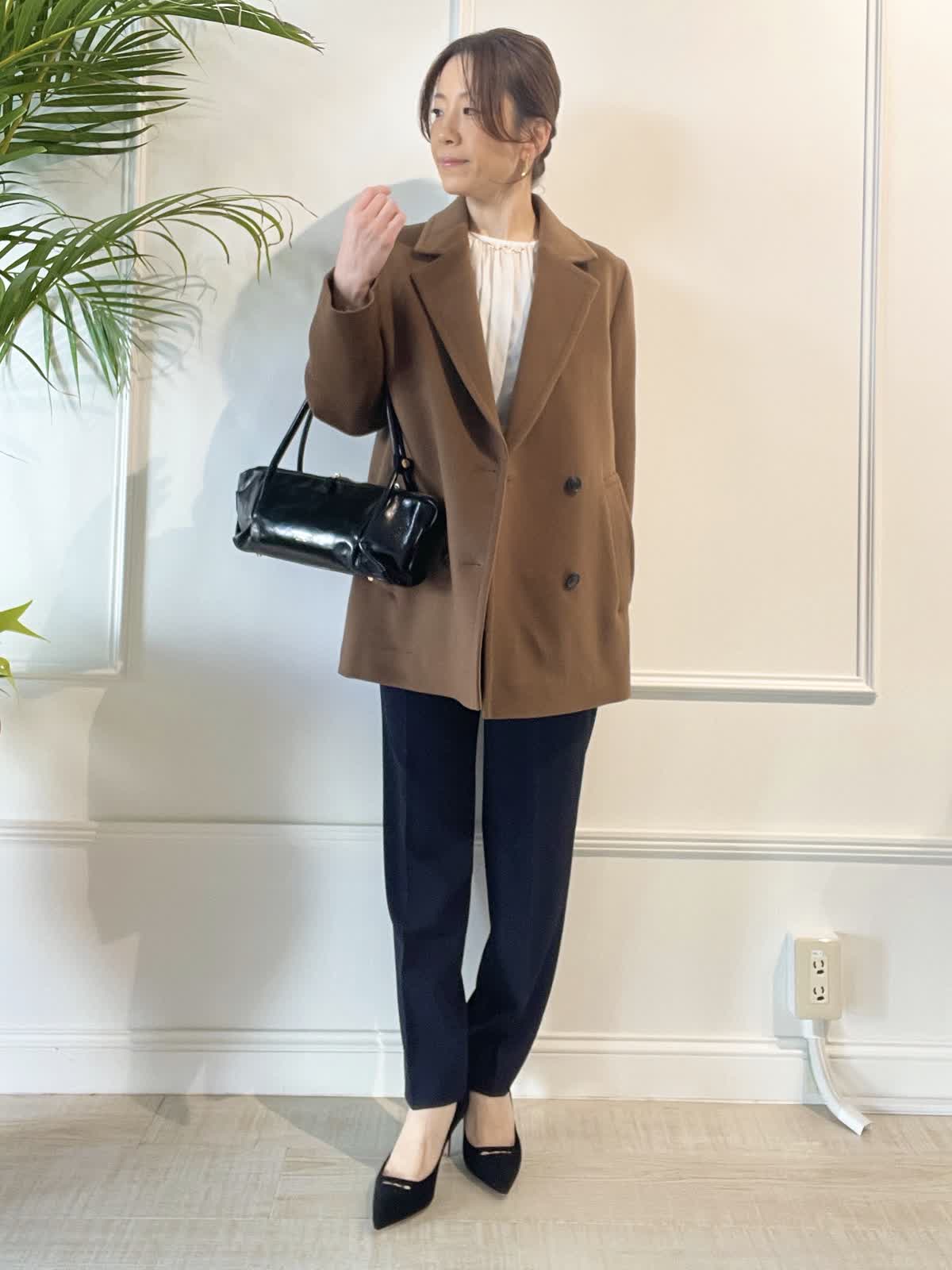 【着用アイテム:カラー/サイズ】 カシミヤコート:キンチャ/9号 ブラウス:オフホワイト/7号 パンツ:ネイビー/7号 バッグ:ブラック 畝と光沢が美しい『COLOMBO』のカシミヤコート。落ち着いたカラーがPコートでも子供っぽくならず、スタイリングを格上げしてくれます。白ブラウスとテーパードパンツでシンプルに合わせました。通勤やお出かけも、スマートに暖かく過ごして頂けます。