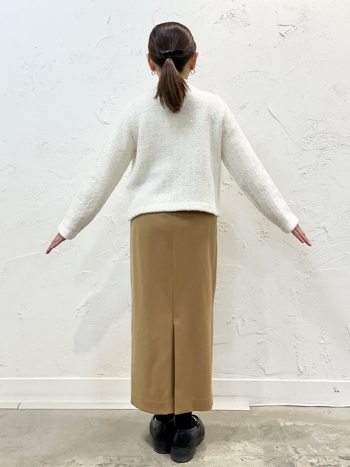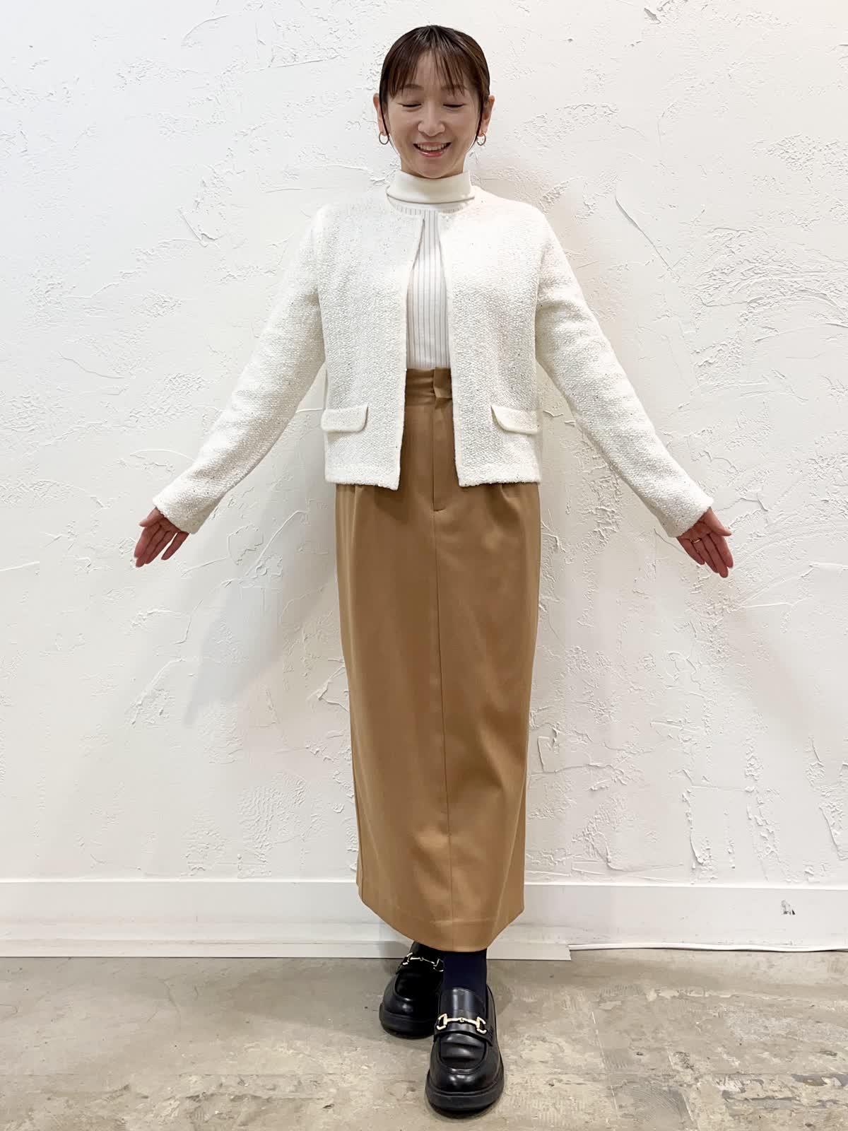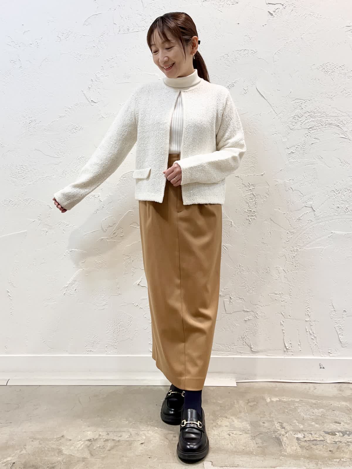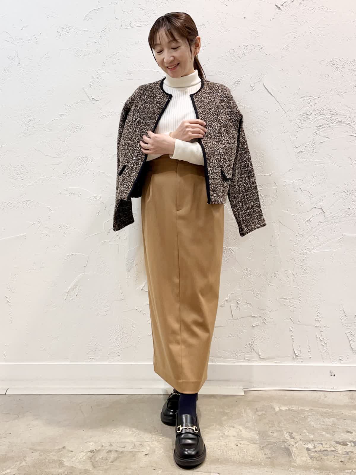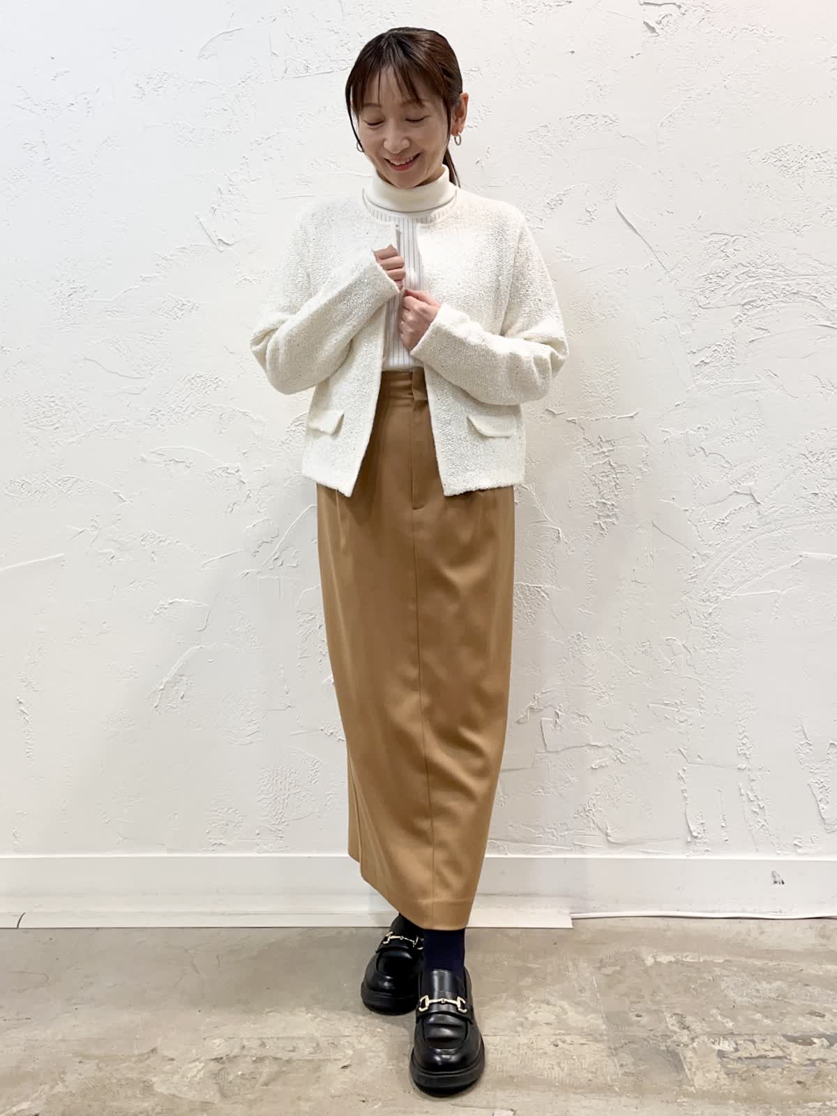 【着用サイズ/カラー】 カーディガン:9号/ブラウン・オフホワイト ニット:9号/オフホワイト スカート:7号/キャメル 寒い日のオフィスコーデ。ツイード風カーデがコーデのポイントに◎ キチンとな日に大活躍!INEDの名品リブタートルに重ねれば寒い日も安心です。冬のオフィス鉄板コーデの完成です♪