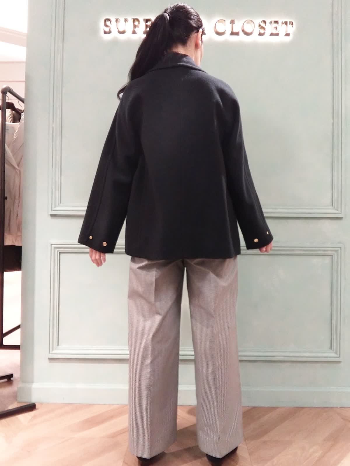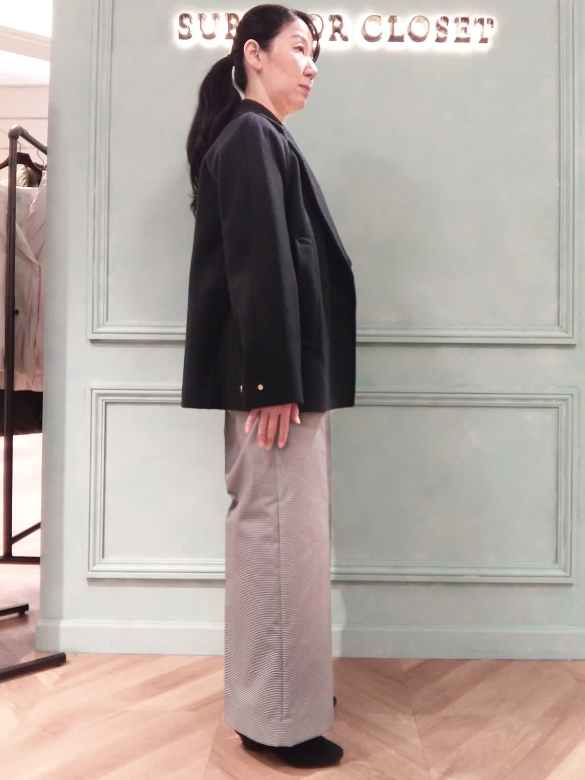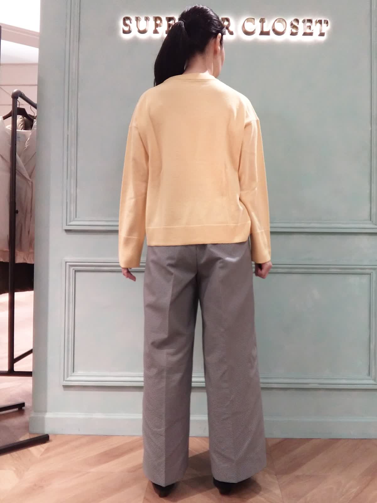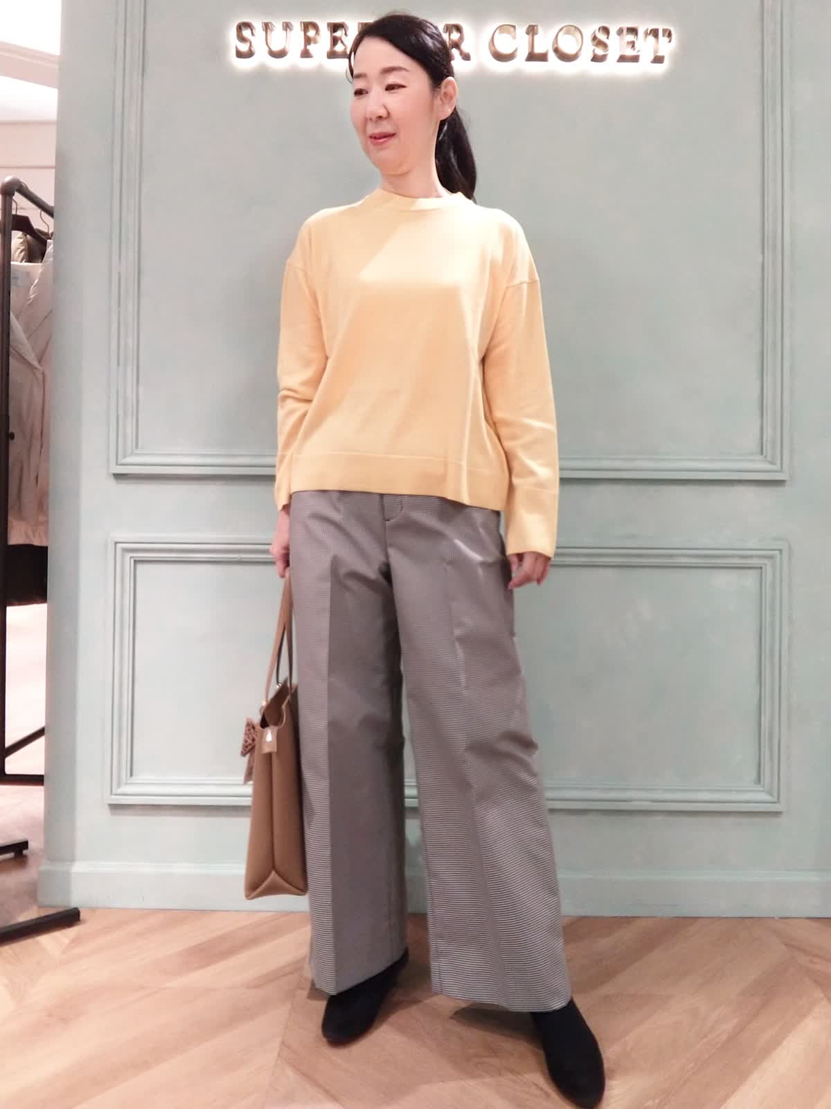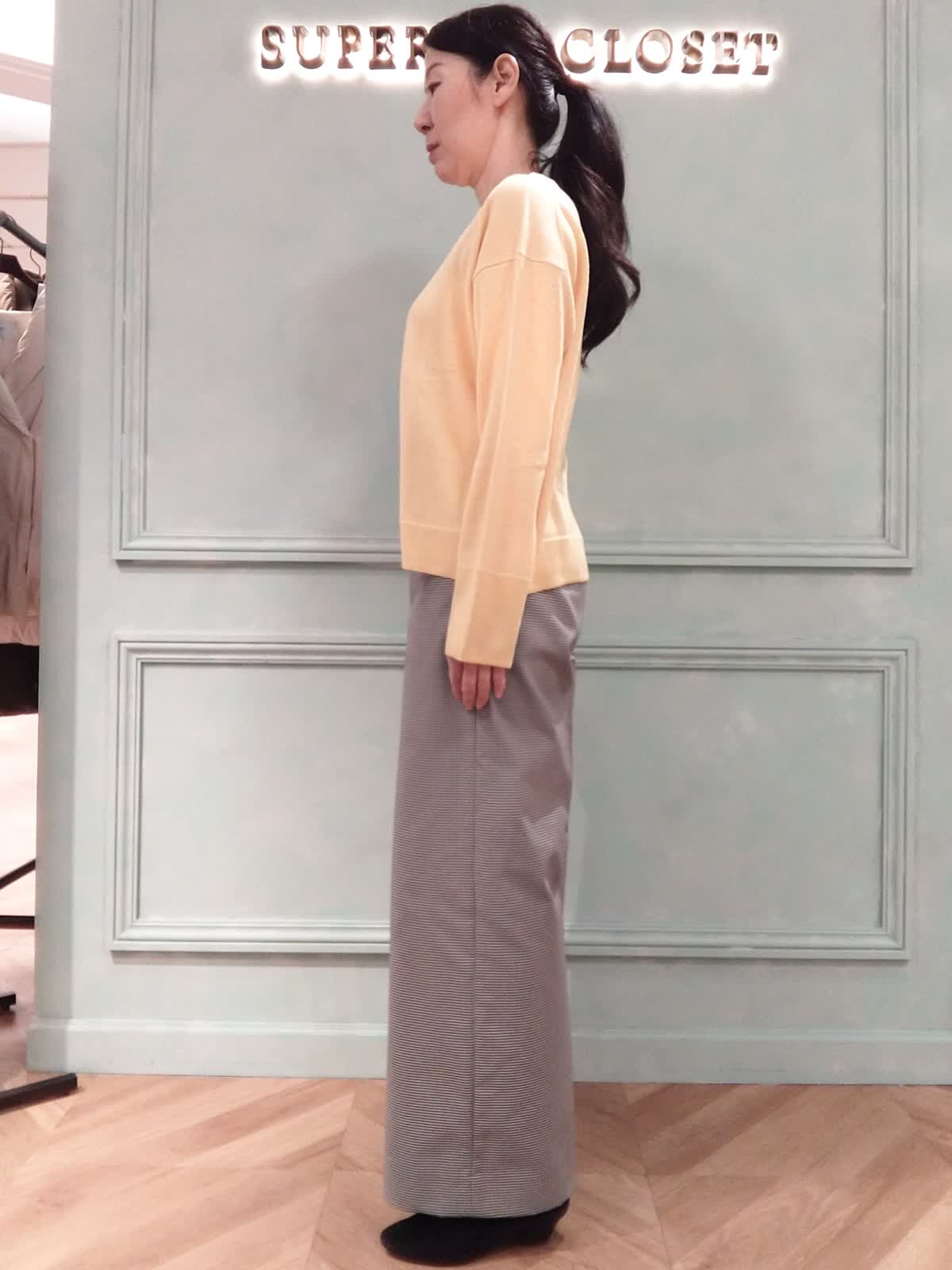 【着用サイズ】コート:9号、ニット:9号、パンツ:9号 【着用カラー】コート:ブラック、ニット:イエロー、パンツ:グレンチェック おでかけスタイル。おでかけは明るい印象て気分が上がるイエローカラーのニットにグレンチェックの美脚ワイドパンツでコーディネート。ピーコートはミドル丈で腰回りまで暖か。シンプルなデザインでボタンがポイント。袖口のボタンを留めると少しふんわり丸いカーヴィーシルエットになり、アームホールがゆったりとしていて、ラクな着心地です。
