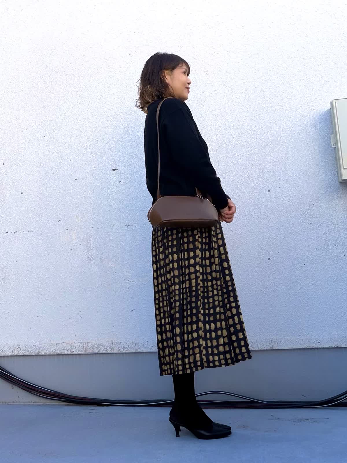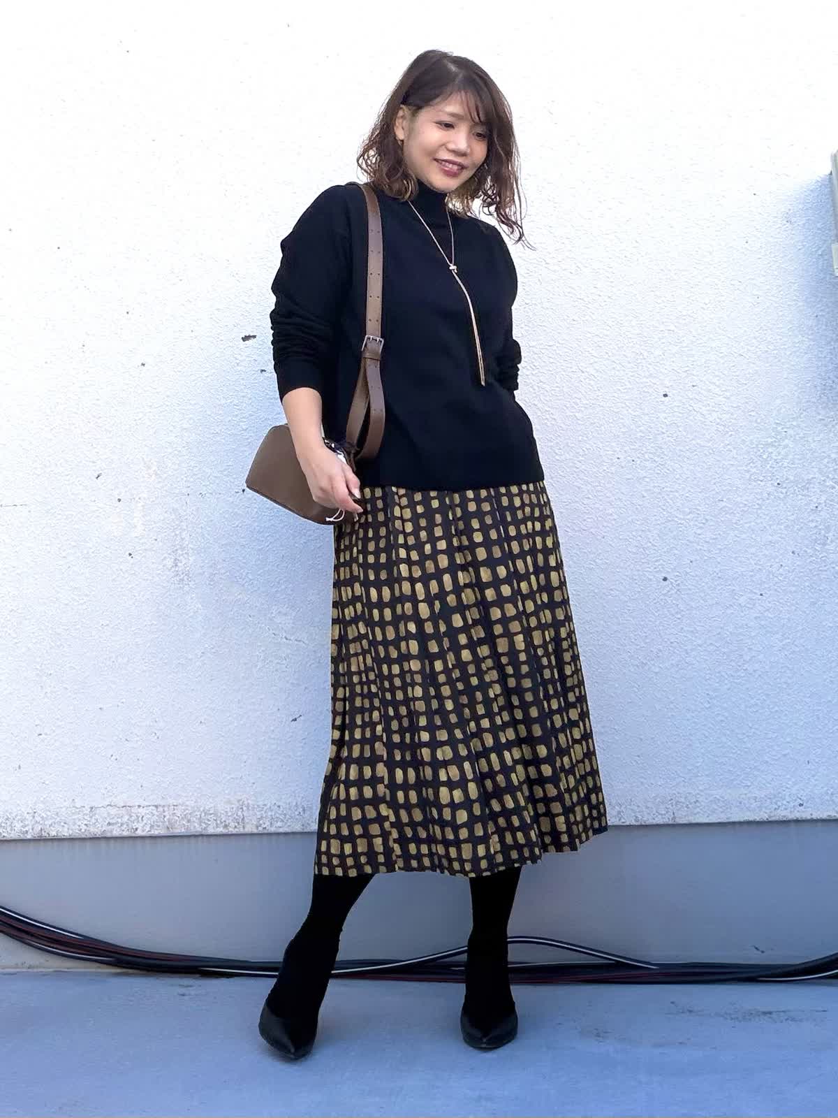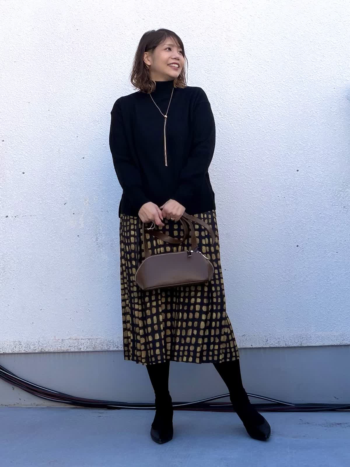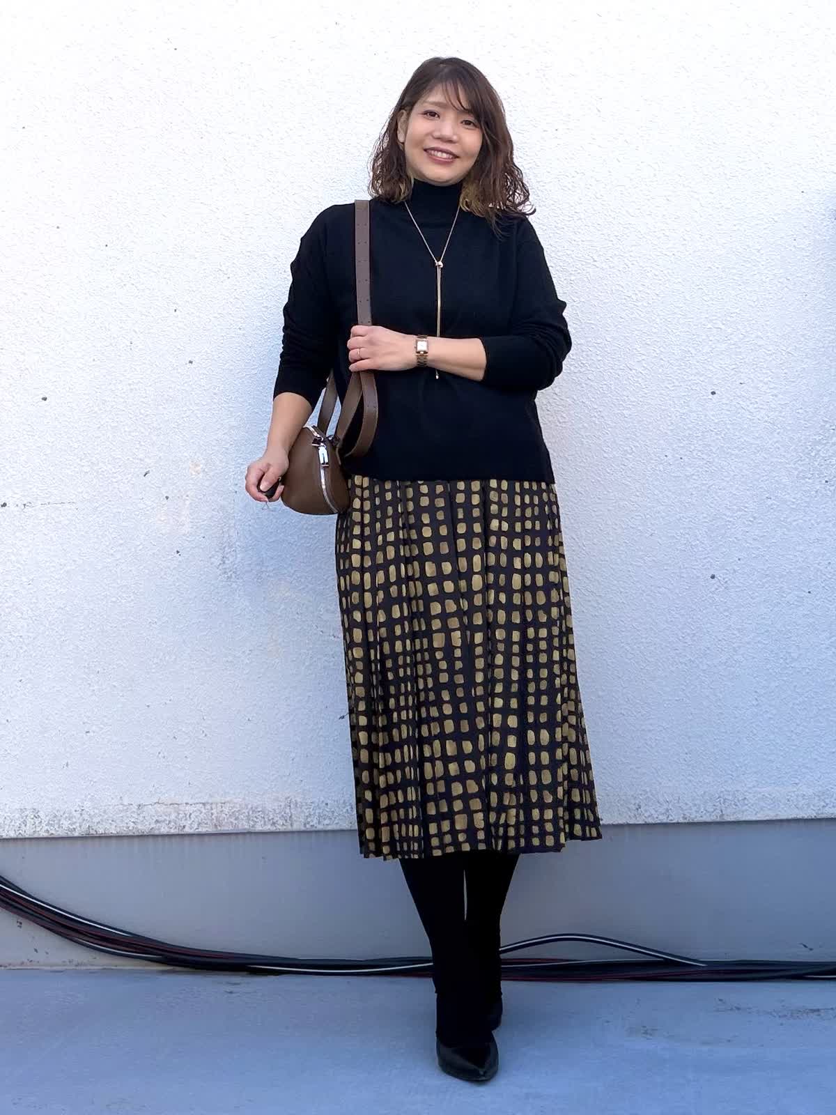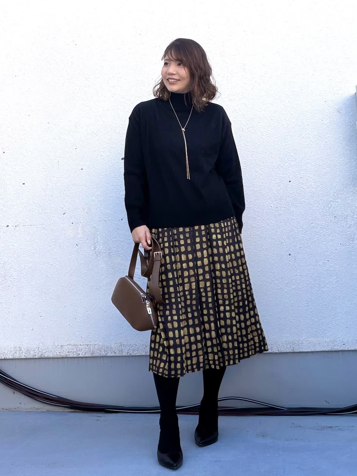【着用アイテム:カラー/サイズ】 ニット:ブラック/9号 スカート:ブラック/9号 トップスはシンプルなブラックのニットで全体を引き締め、程よくゆとりのあるシルエットが体のラインを拾わず、デイリーに着やすい一枚。 スカートは幾何学柄がアクセントになり、落ち着いた配色ながらも存在感のあるデザイン。動くたびに揺れるシルエットで、女性らしさをプラスしてくれます。 ロングネックレスとブラウン小物を合わせることで、縦ラインを強調しつつ、きちんと感のある大人カジュアルに。 お仕事からお出かけまで幅広く活躍するコーディネートです。