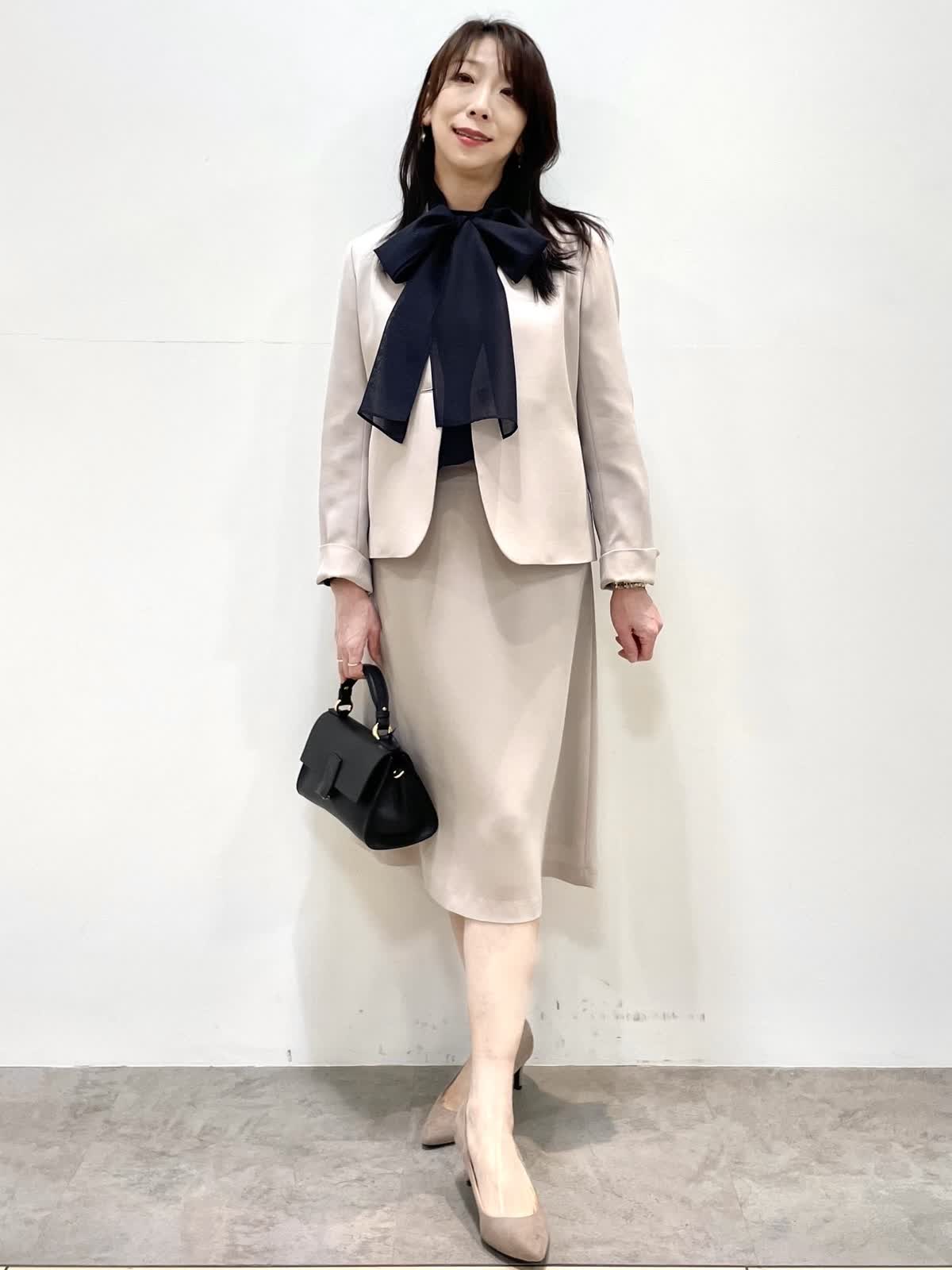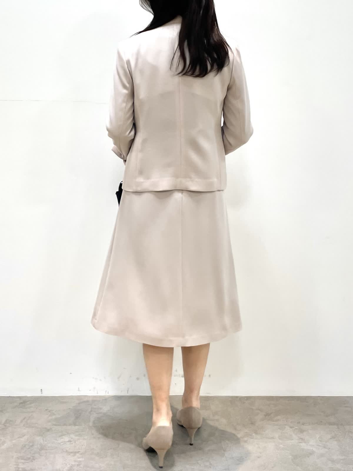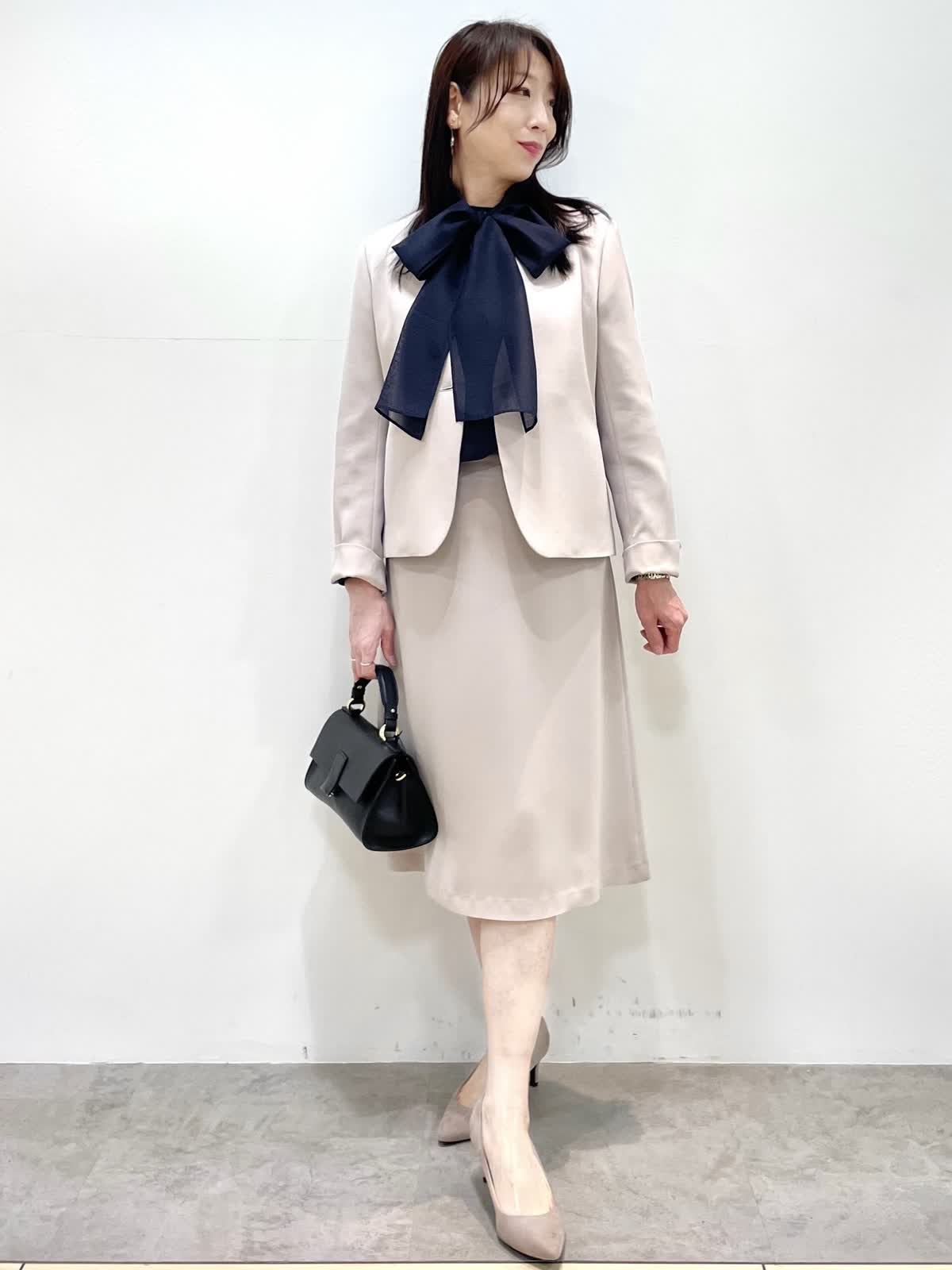 【着用サイズ】全て9号 【着用カラー】ジャケット、スカート:グレーベージュ ブラウス:ネイビー 上品セットアップスタイル。すっきりとしたノーカラージャケットとフレアシルエットのスカートは着回し力抜群。お仕事からセレモニーまで様々なシーンで活躍します。シワになりにくく、お洗濯可能もうれしいポイント。シーズンレスで着用できるので、ワンセットあると安心です。ブラウスはボウタイが取り外し可能。ボウタイの結び方でガラッと印象が変わります。