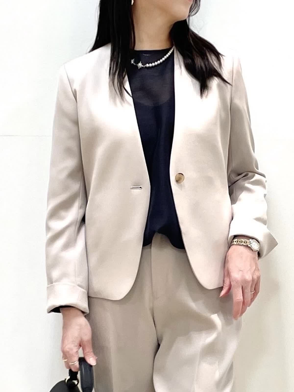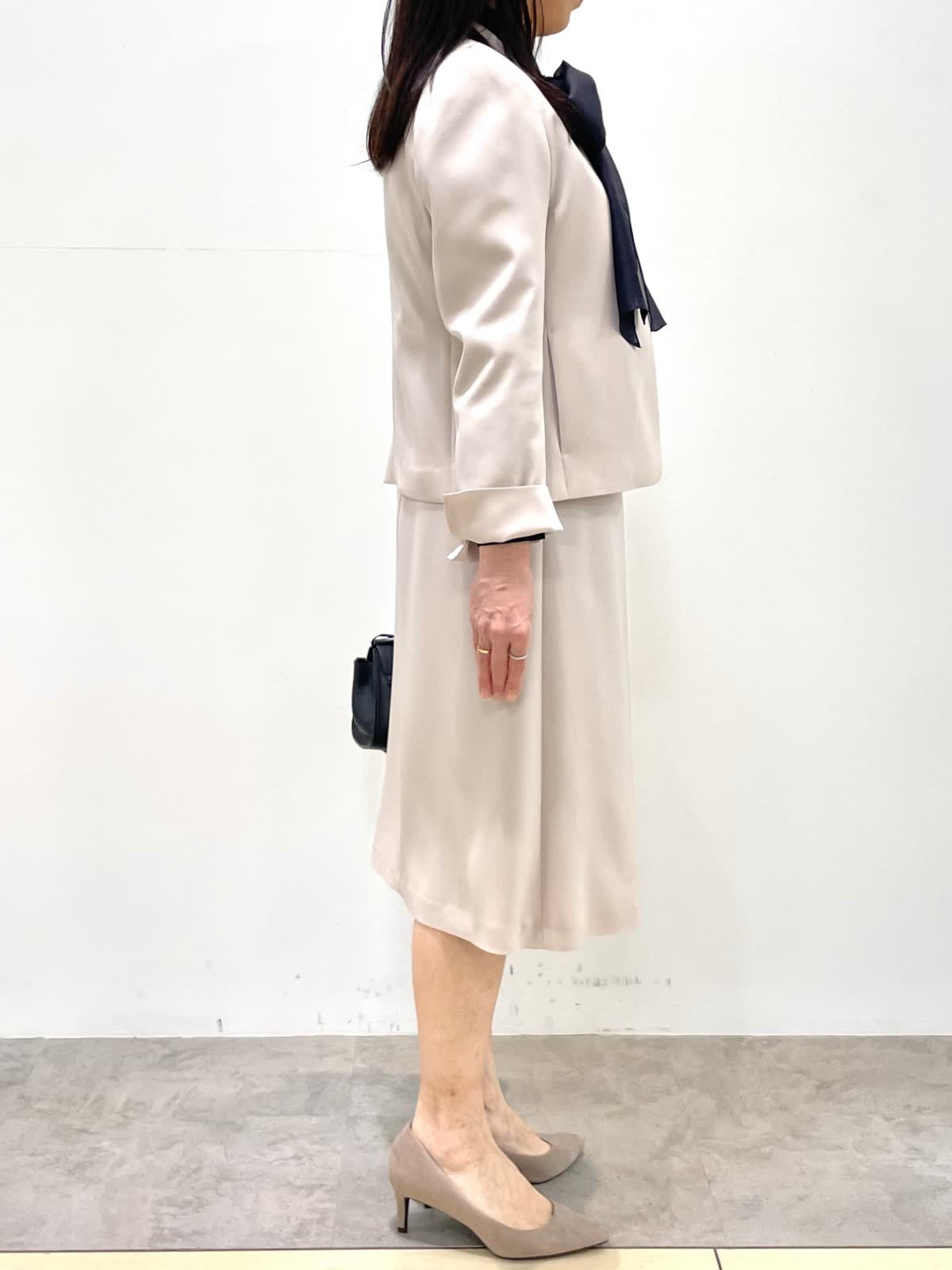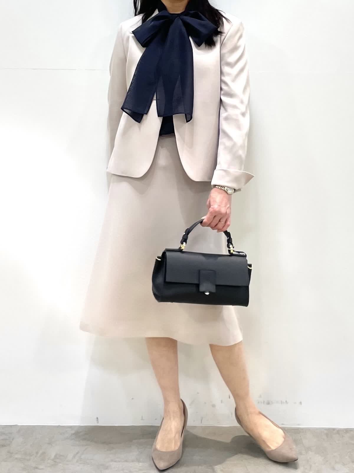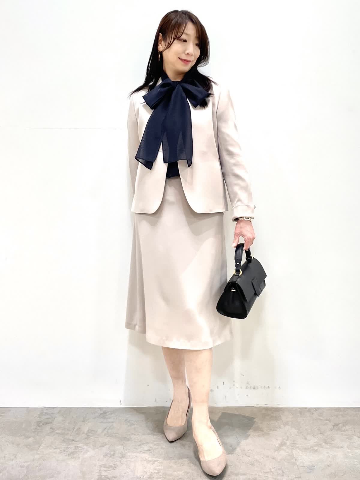 【着用サイズ】全て9号 【着用カラー】ジャケット、スカート:グレーベージュ ブラウス:ネイビー 上品セットアップスタイル。すっきりとしたノーカラージャケットとフレアシルエットのスカートは着回し力抜群。お仕事からセレモニーまで様々なシーンで活躍します。シワになりにくく、お洗濯可能もうれしいポイント。シーズンレスで着用できるので、ワンセットあると安心です。ブラウスはボウタイが取り外し可能。ボウタイの結び方でガラッと印象が変わります。