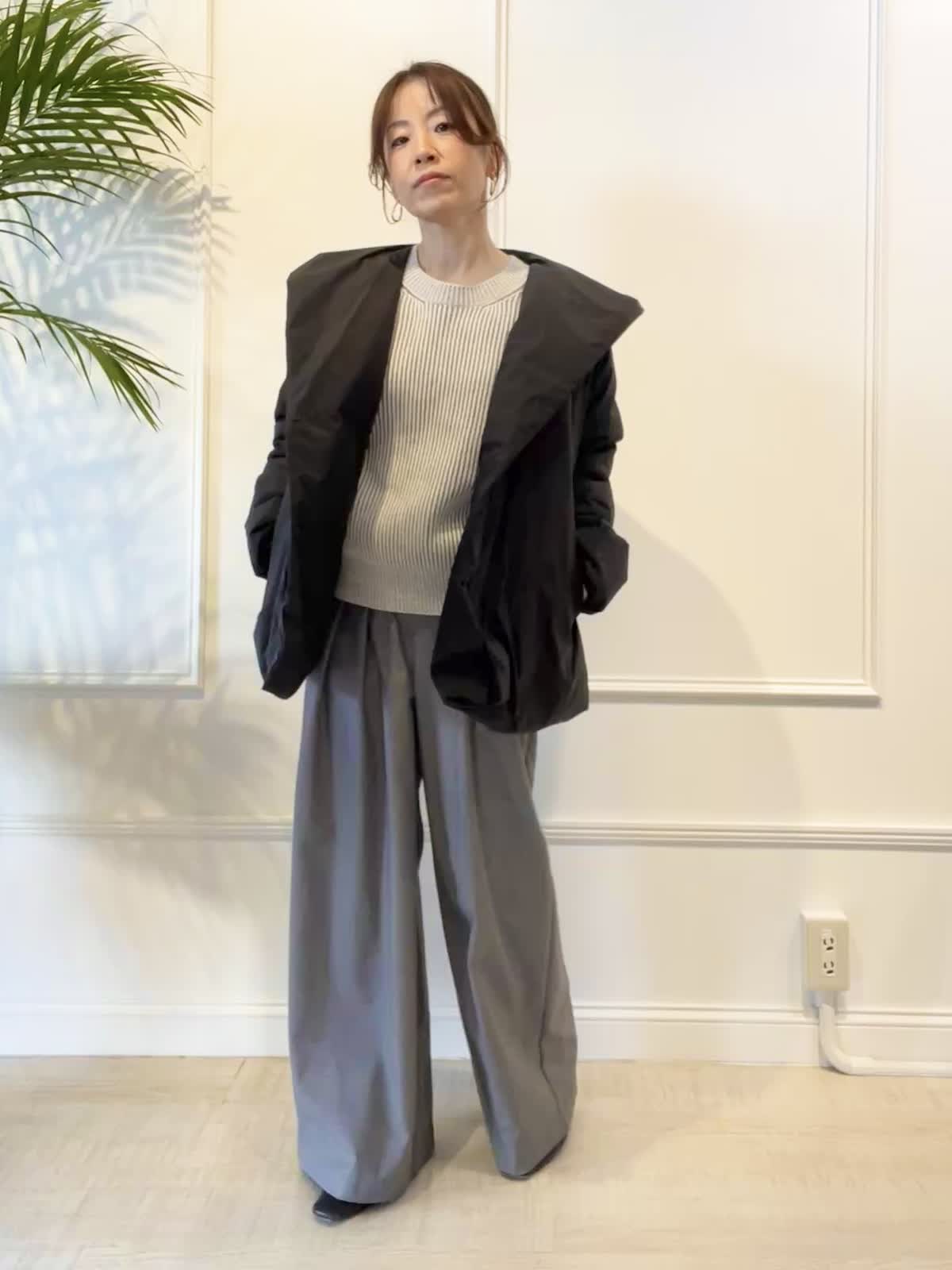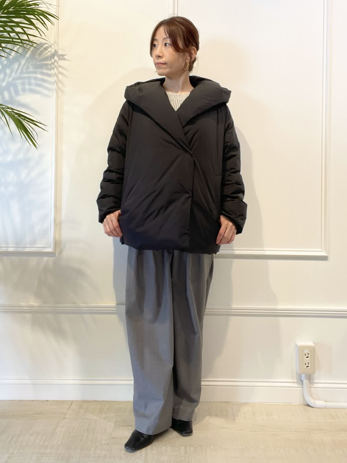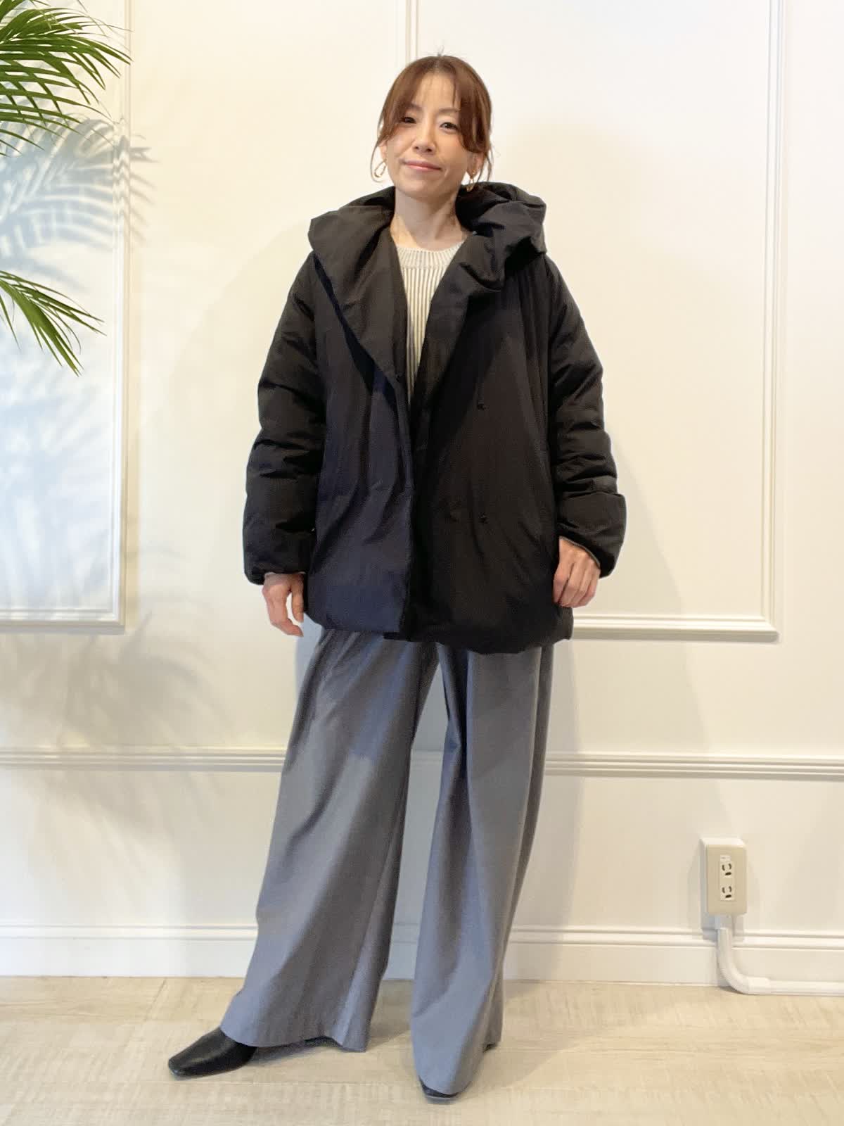 【着用アイテム:カラー/サイズ】 ダウン:ブラック/7号 ニット:グレー/9号 パンツ:グレー/9号 バッグ:オフホワイト ふんわり軽い着心地のダウンはオーバーサイズが可愛い。上品なCASHEARTのストライプニットを合わせました。タックがたっぷり入ったパンツは、後ろウエストゴムで楽ちんかつスマート。春まで着用出来る素材です。