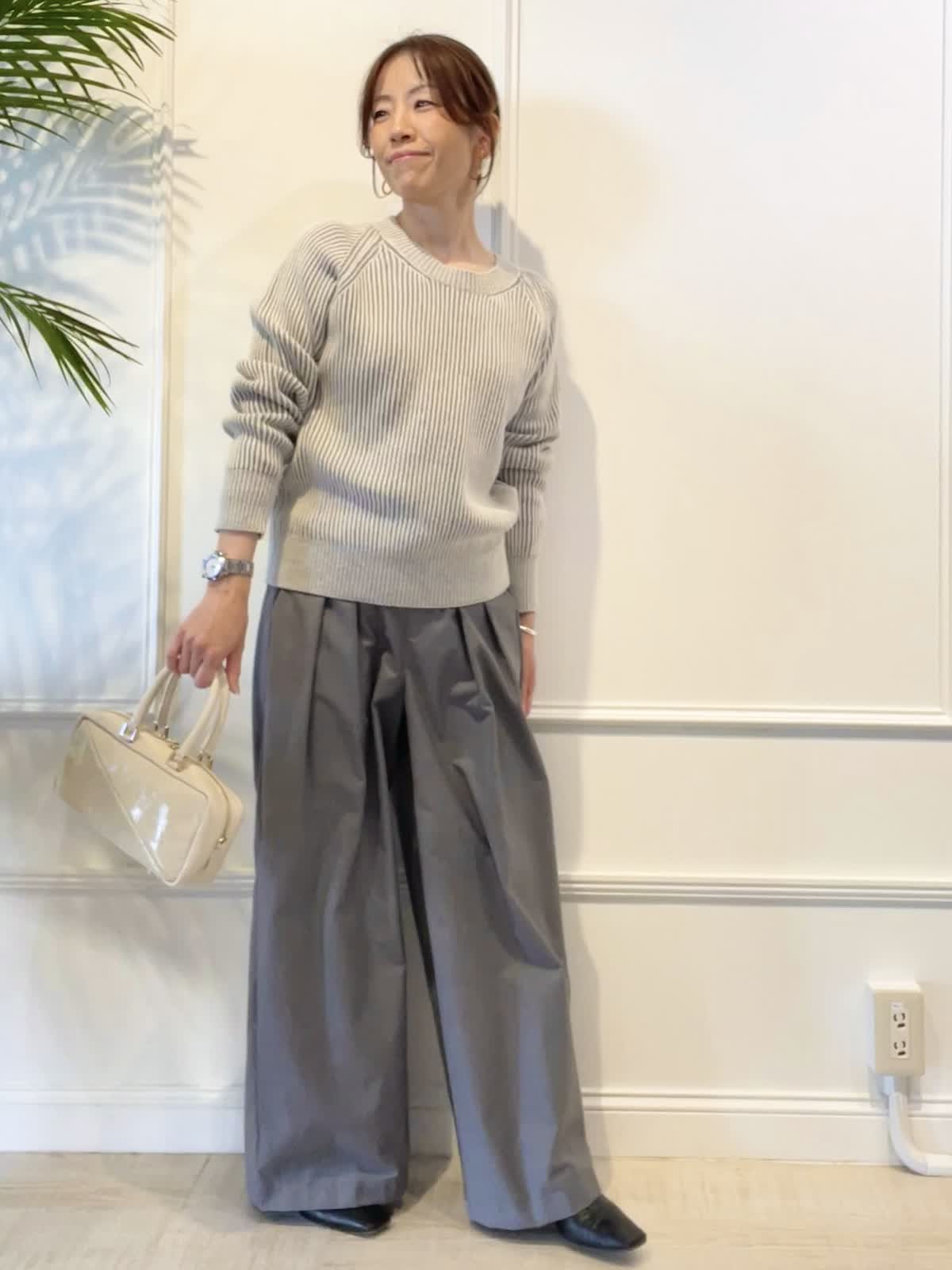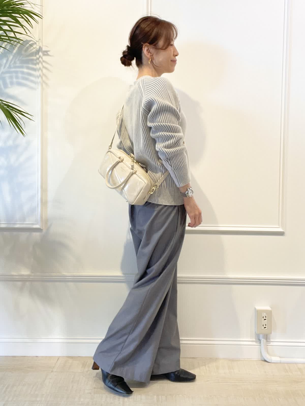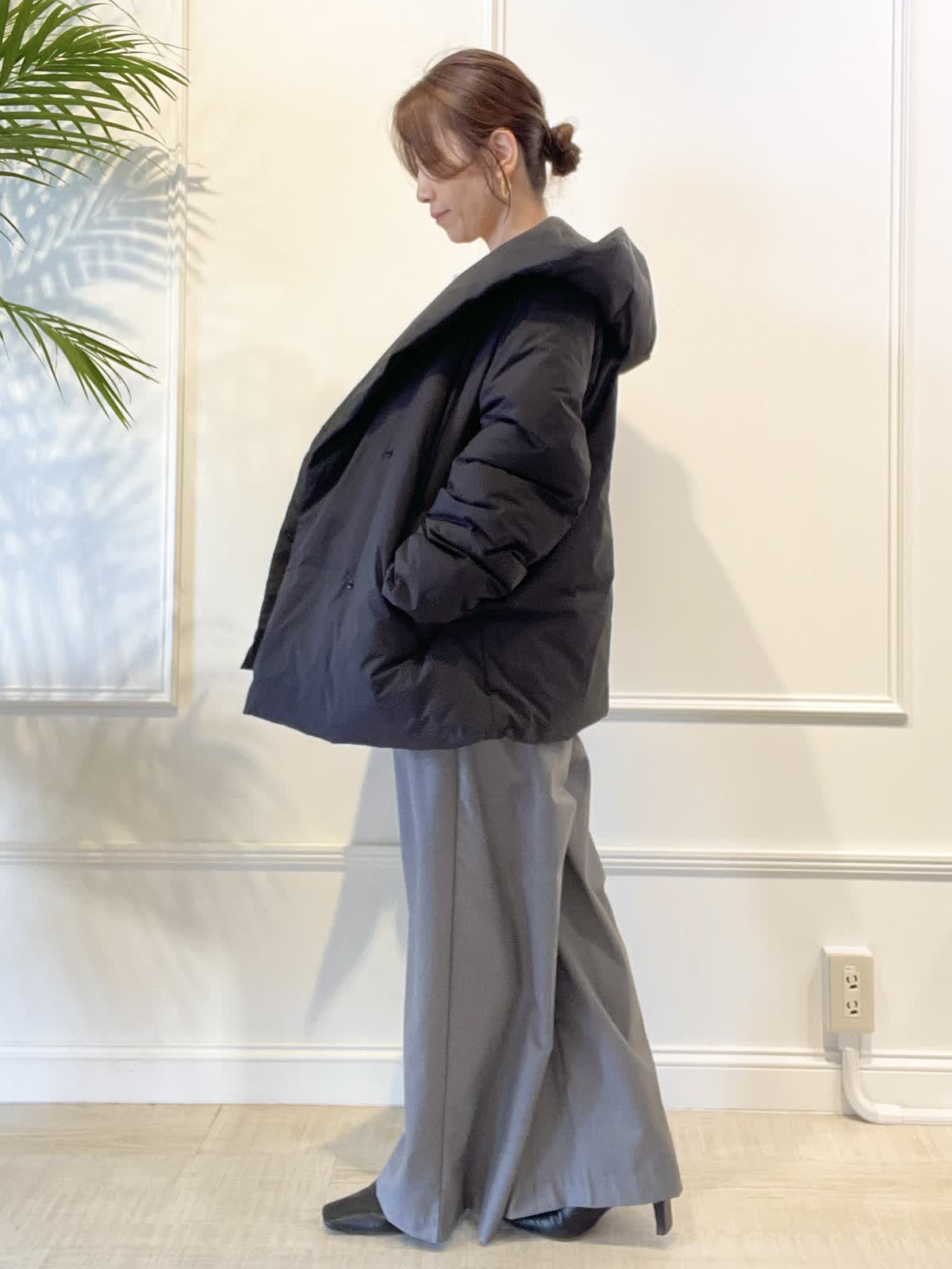 【着用アイテム:カラー/サイズ】 ダウン:ブラック/7号 ニット:グレー/9号 パンツ:グレー/9号 バッグ:オフホワイト ふんわり軽い着心地のダウンはオーバーサイズが可愛い。上品なCASHEARTのストライプニットを合わせました。タックがたっぷり入ったパンツは、後ろウエストゴムで楽ちんかつスマート。春まで着用出来る素材です。