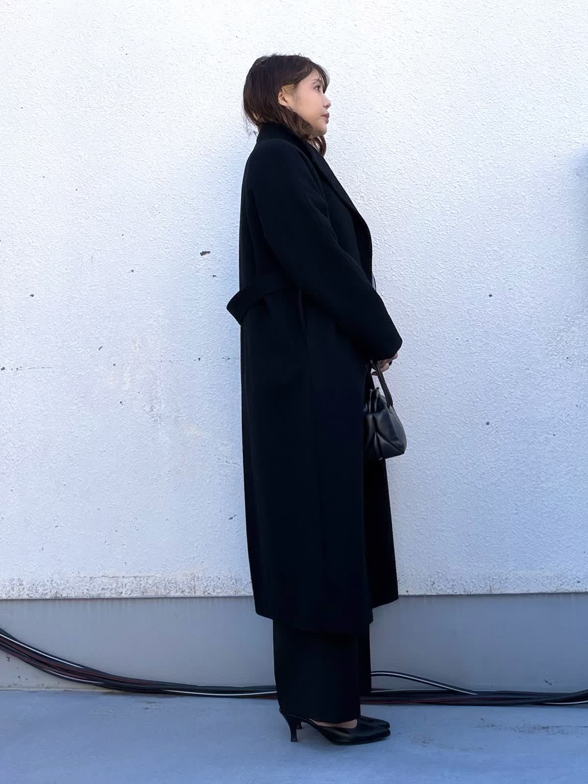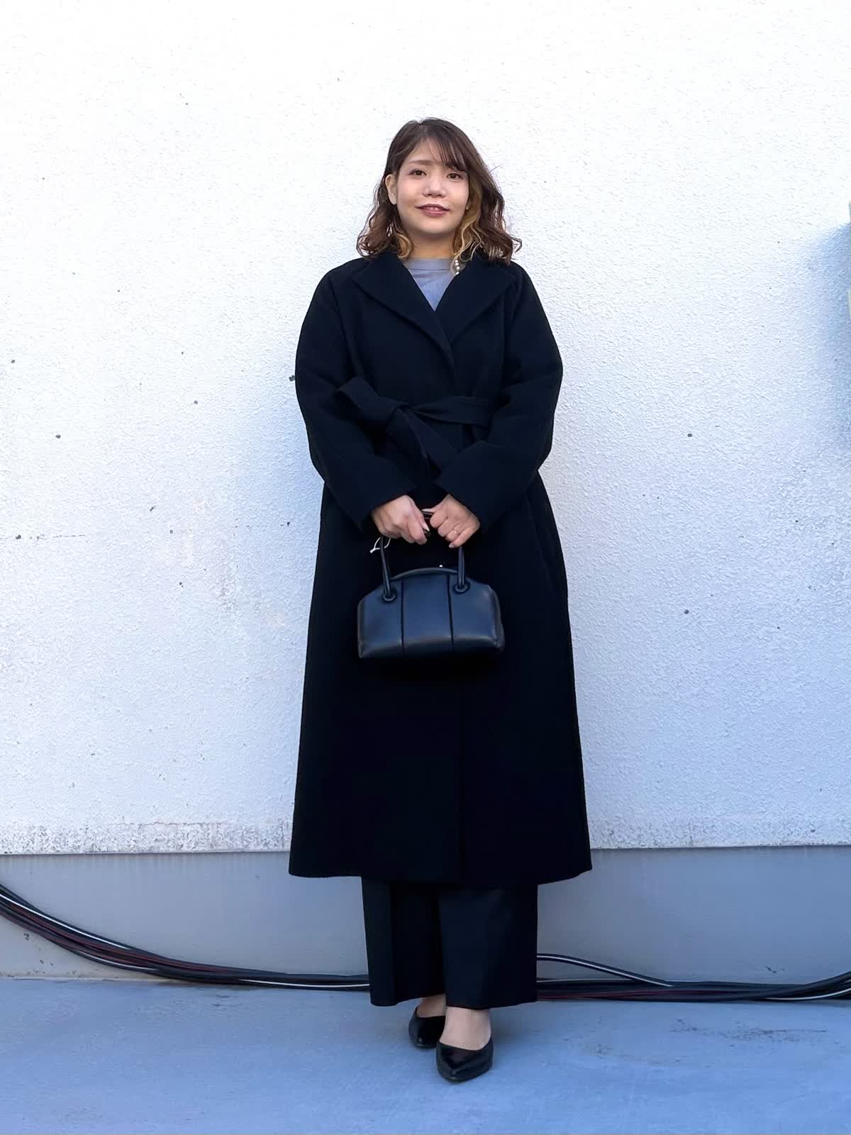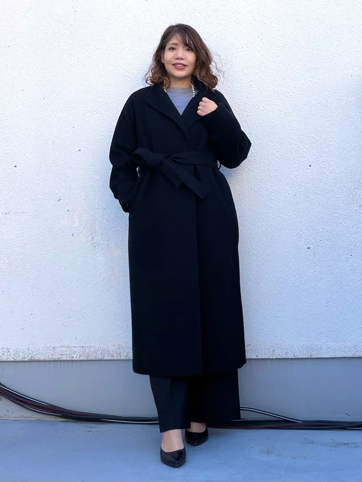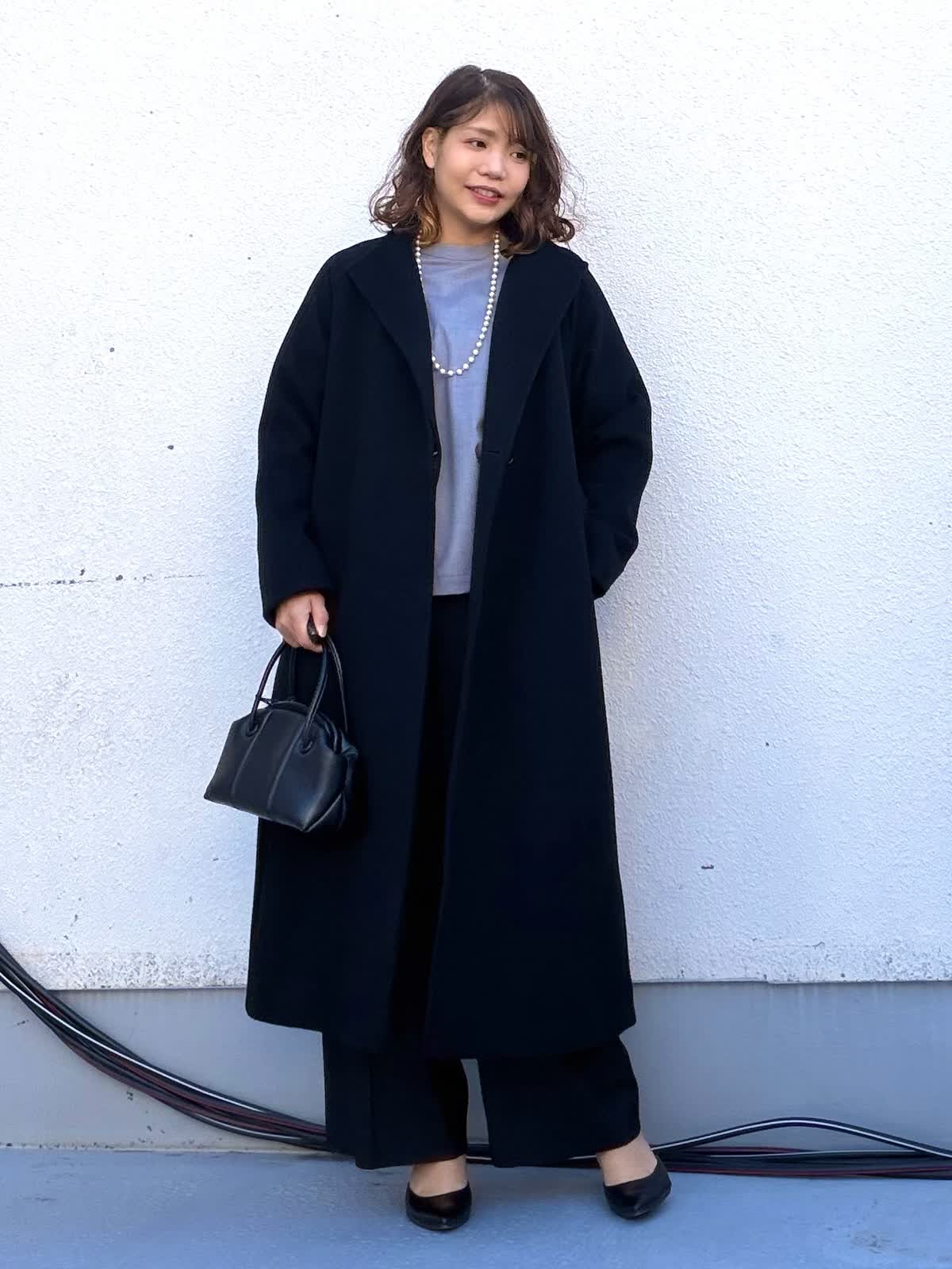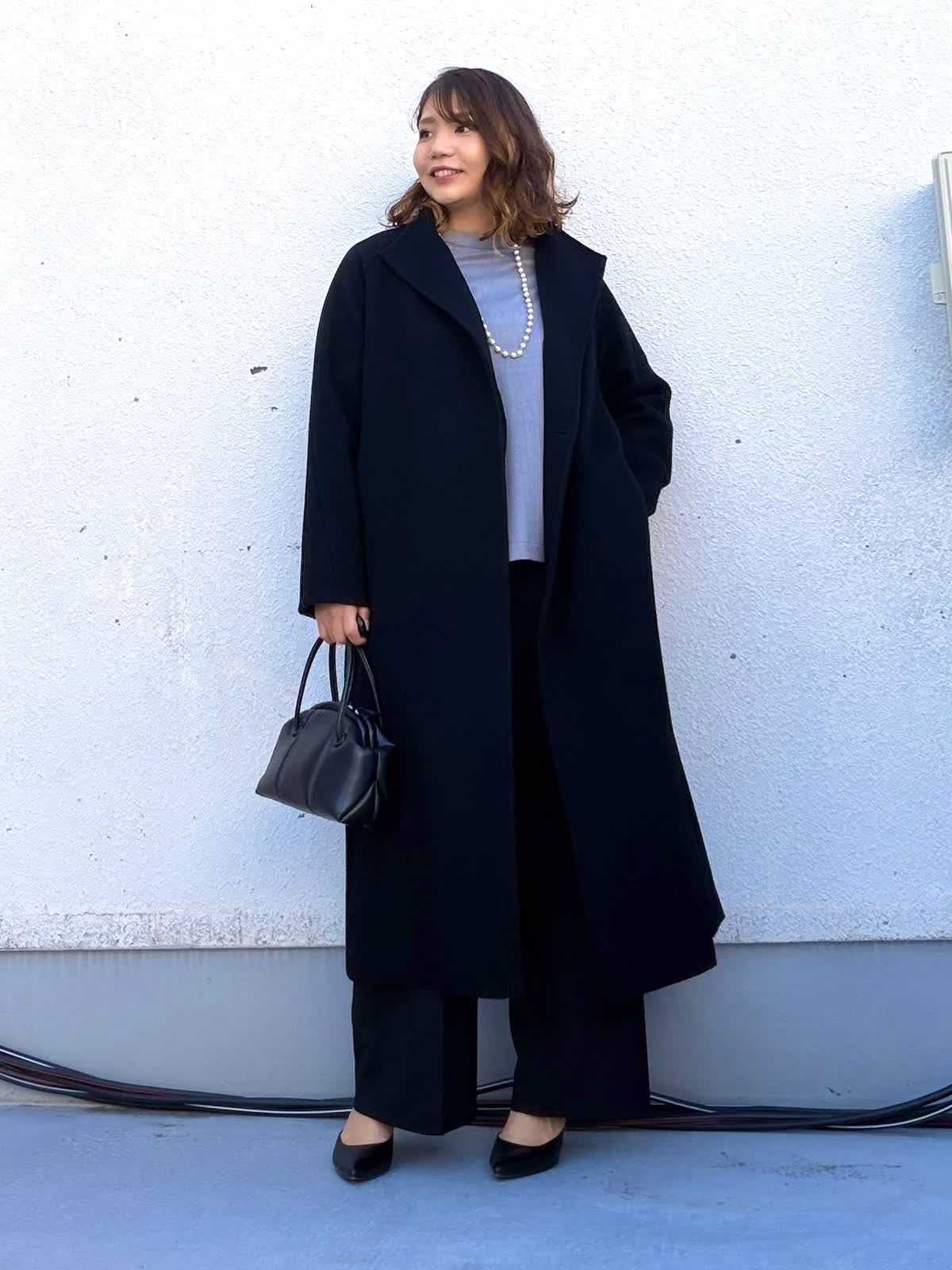 【着用アイテム:カラー/サイズ】 コート:ブラック/9号 ブラウス:グレー/9号 パンツ:ブラック/11号 程よくゆとりのあるロングコートは、落ち感のきれいな素材で羽織るだけで縦ラインを強調。通勤からきちんとしたお出かけまで幅広く活躍します。 インナーのグレーのブラウスは少しスタンドになっていてとてもじょうひんなブラウスです。 ボトムはストレートシルエットのパンツで、全体をすっきりとバランス良いパンツです。