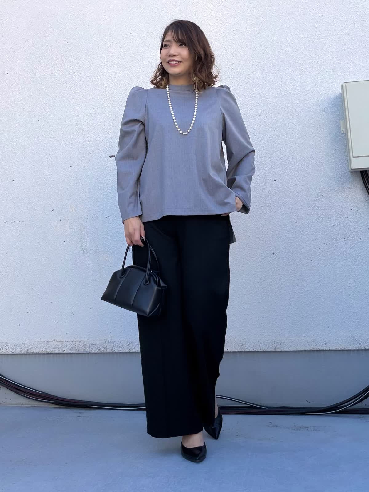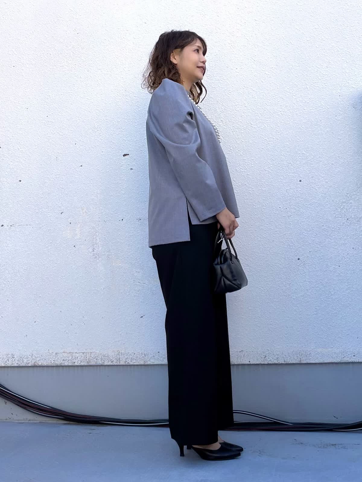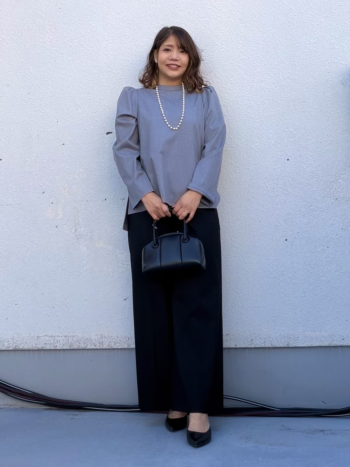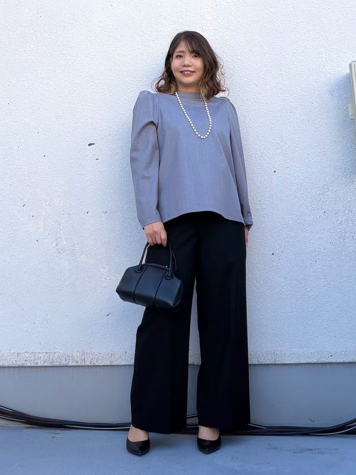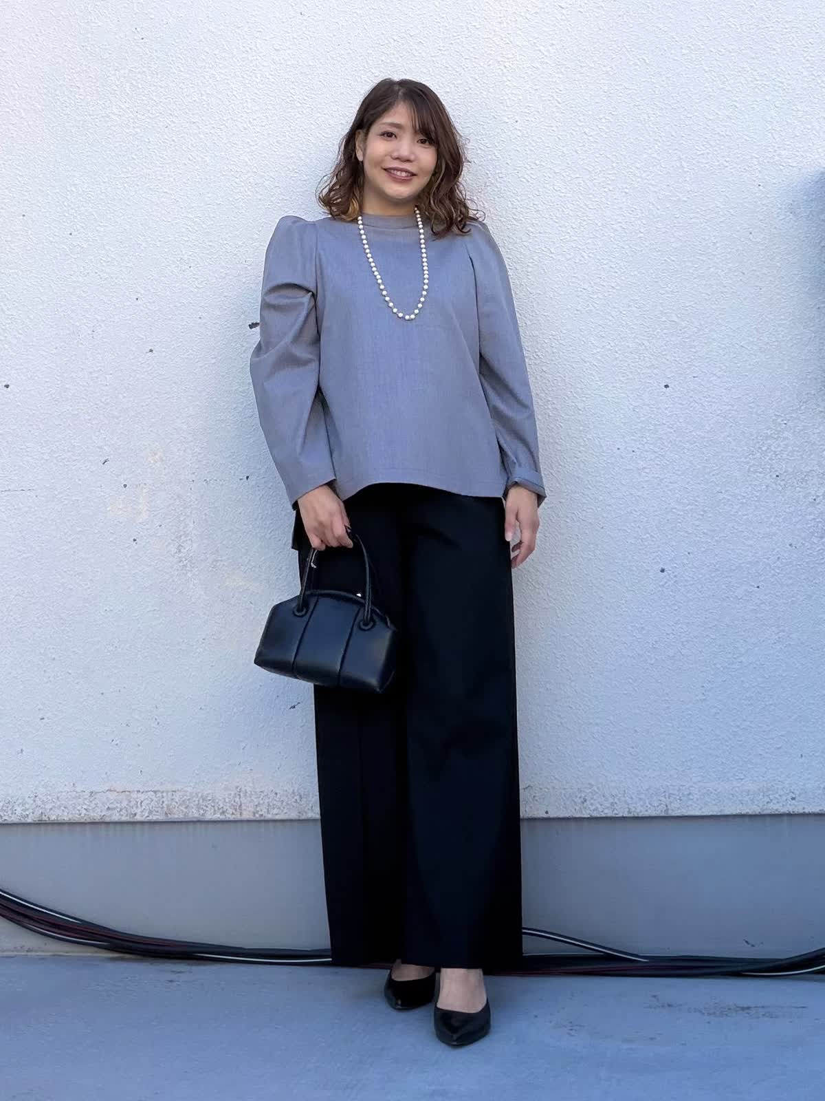 【着用アイテム:カラー/サイズ】 ブラウス:グレー/9号 パンツ:ブラック/11号 セレモニーシーンにおすすめのスタイリング。 トップスは肩にさりげない立体感を持たせたデザインで、ジャケットなしでも上品な印象に。程よくゆとりのあるシルエットが体のラインを拾わず、安心感のある着心地です。 ボトムには落ち感の美しいワイドパンツを合わせ、縦のラインを強調。 パールネックレスを合わせることで、卒園・卒業、入園・入学などのセレモニーシーンにもふさわしい華やかさをプラス。 式典からお食事会、その後のきれいめなお出かけまで対応できる、着回し力の高いセレモニースタイルです。