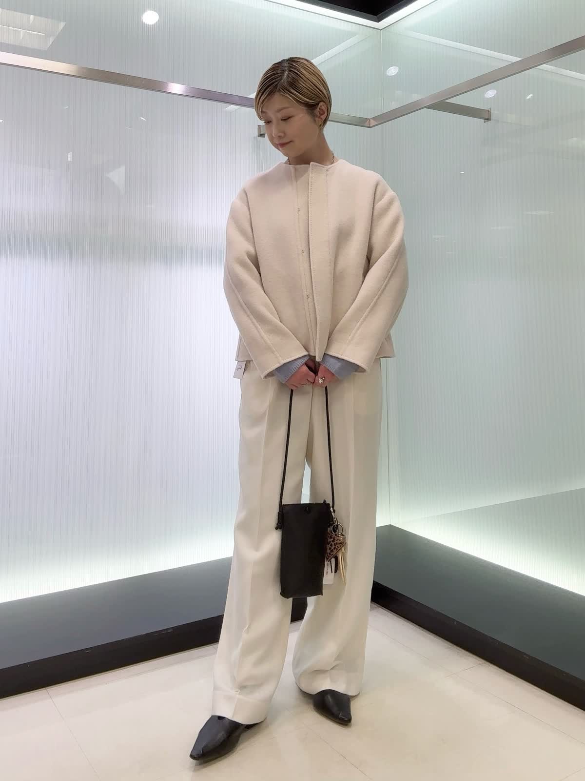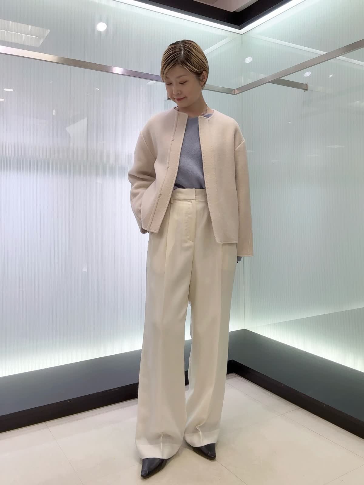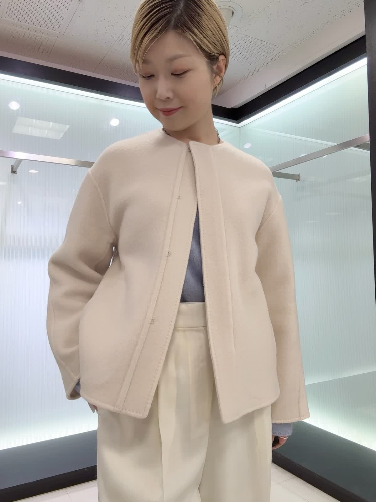 【着用カラー・サイズ】アウター : アイボリー/9号 ニット : サックス/9号 パンツ : オフホワイト/9号 リラックス感のあるショートコートでデイリーからオケージョンシーンまで幅広く着られます♪スカートスタイル、ワンピース、パンツスタイルにも合わせやすい着丈なのでおすすめです♪