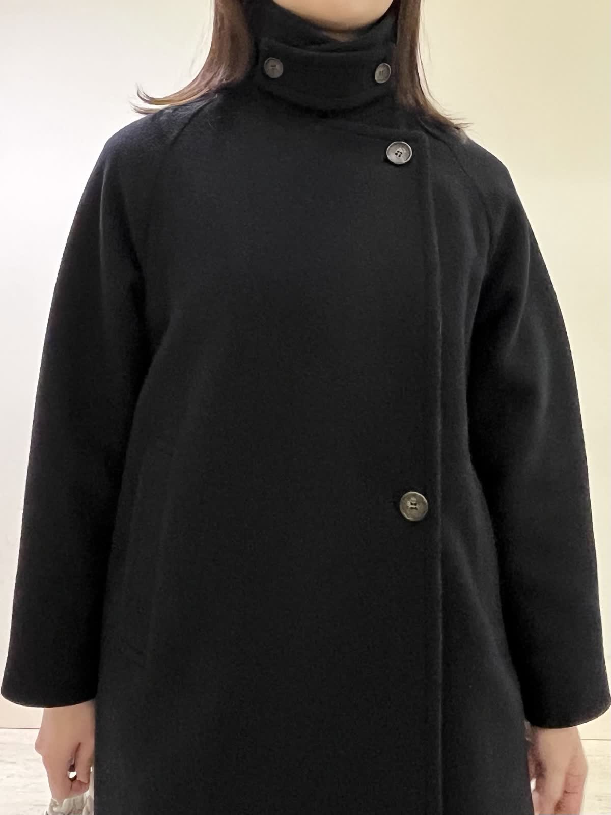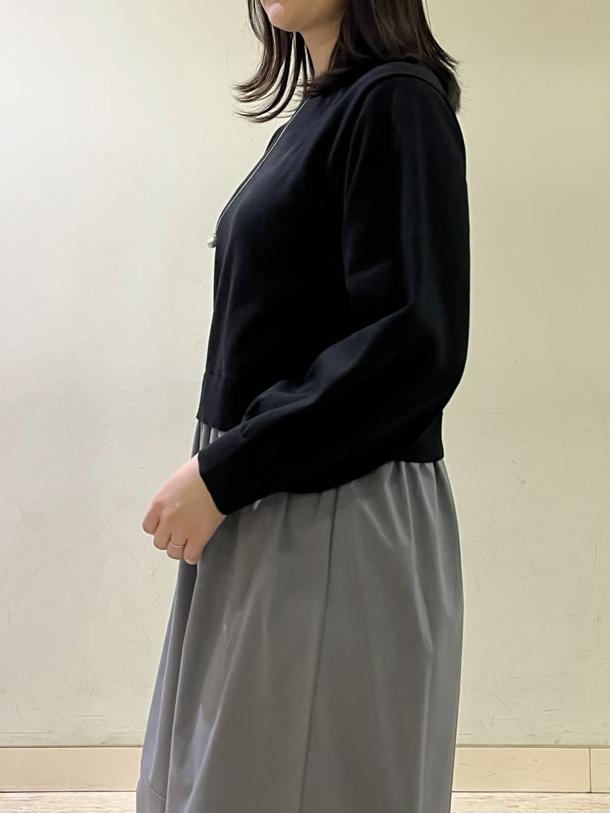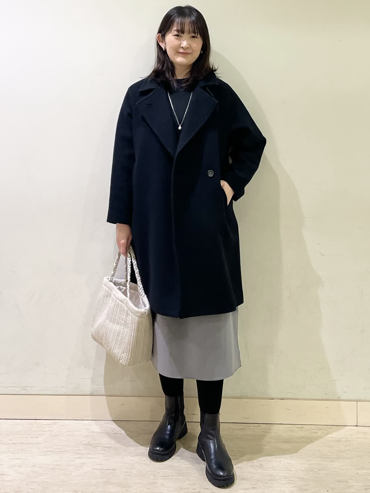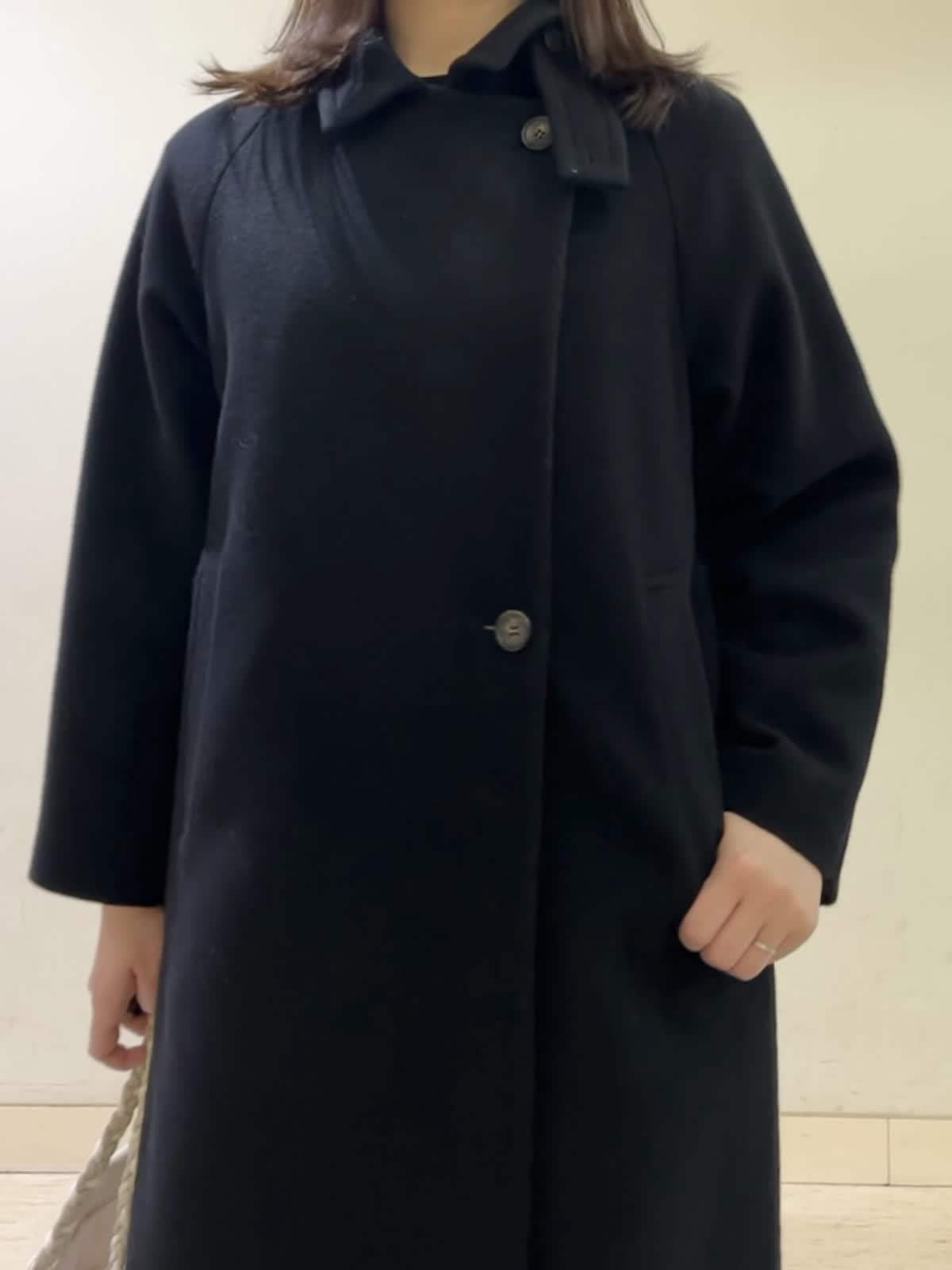 【着用カラー/サイズ】コート:ブラック/フリー ワンピース:グレー/フリー お仕事通勤コーデ。ブラックのロングコートは、定番で長く使えるデザインです。全てのボタンをしめるとトレンドのスタンドカラーデザインになります。開けて着るとPコート風になるので、1着で雰囲気を変えてお召しいただけます。ワンピースは、ウエストの切り替えがありスッキリ見えします。さりげないふんわり袖がポイントです。