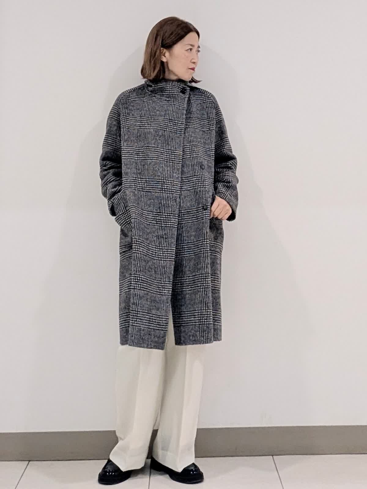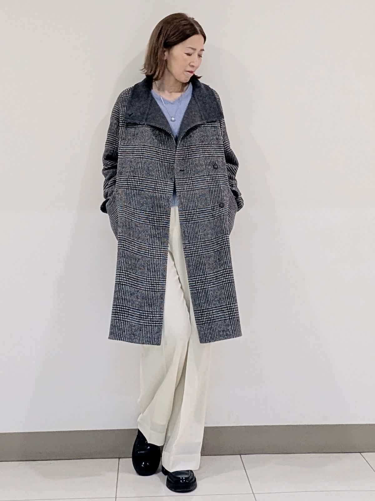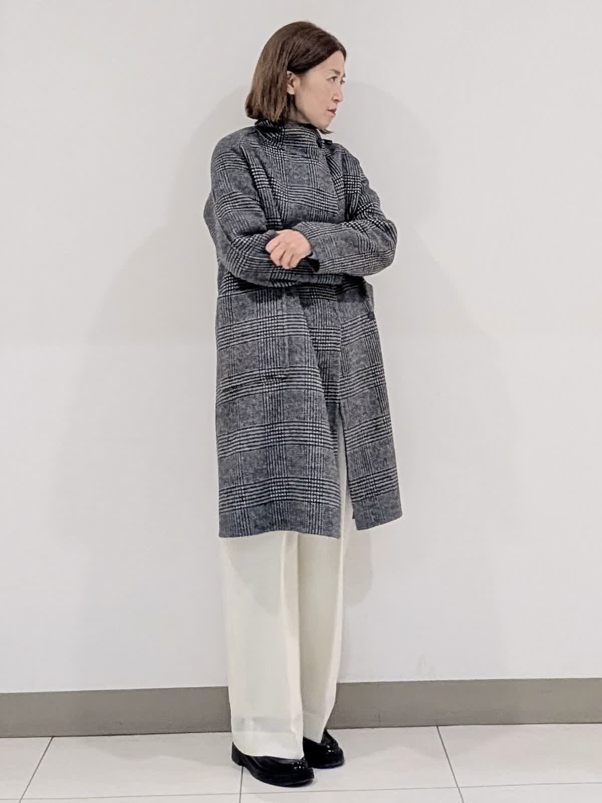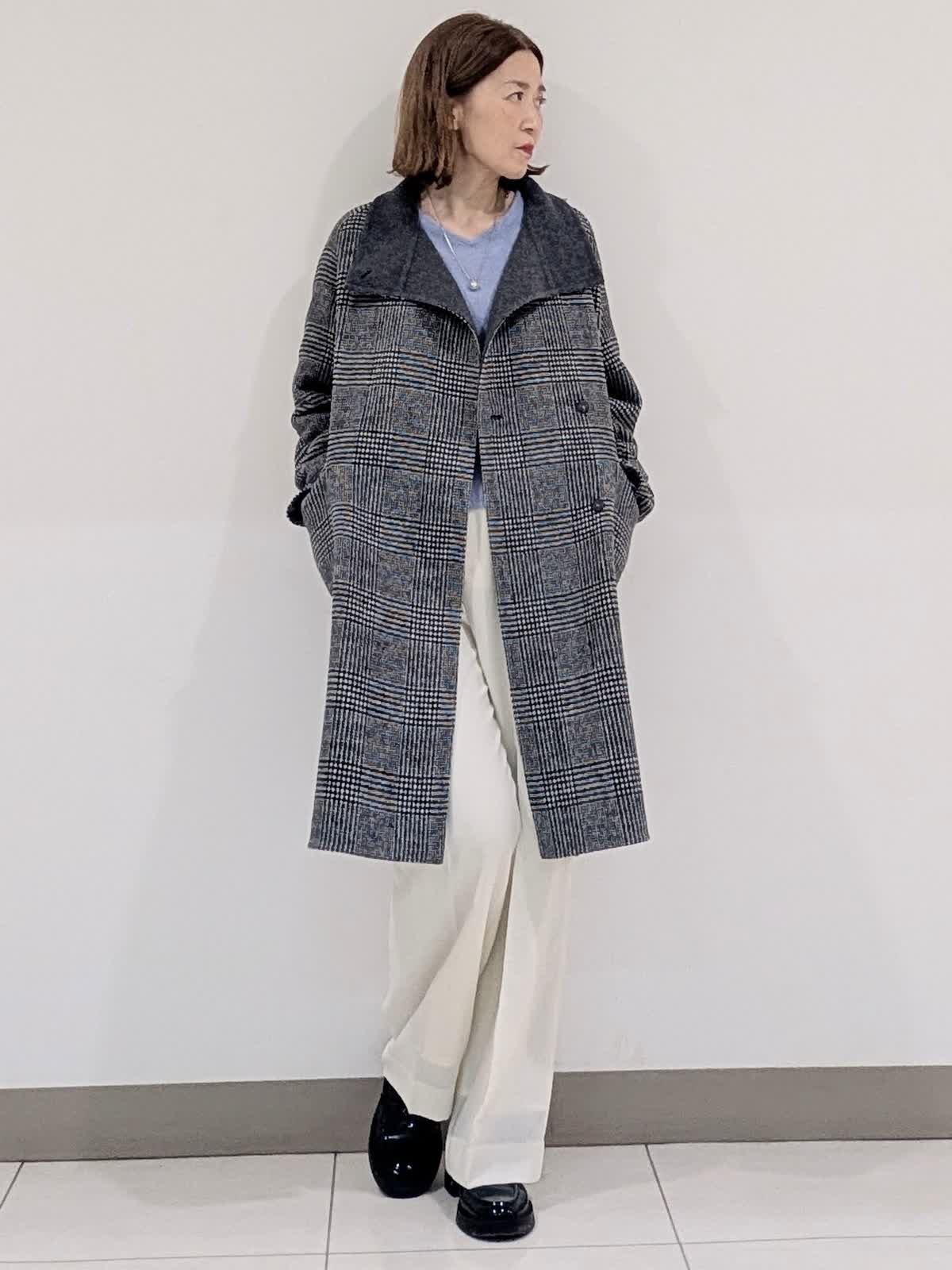 【着用サイズ9号】 おすすめのシャープなスタンドカラーコート。釦を閉じてスタンドカラー、開けても決まる2wayの襟デザイン。トレンドに左右されず、長くご愛用いただけるモデルです。 インナーには、ラクーンを贅沢にブレンドしたファーニットを。柔らかい毛足がポイントで1枚でもコーディネートのアクセントになるVネック。上品な大人ニットに仕上げています。 ボトムスは、ツータックデザインのストレートシルエットパンツを合わせました。オンオフ問わず活躍してくれる万能なアイテム◎ フラットシューズやスニーカーでも美脚になれるパンツです。
