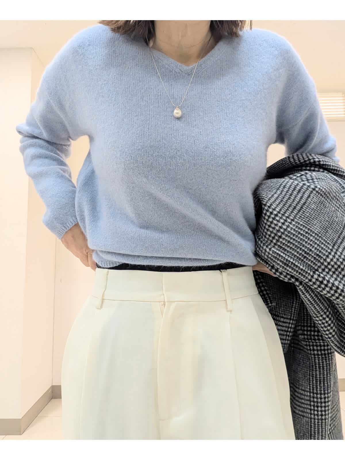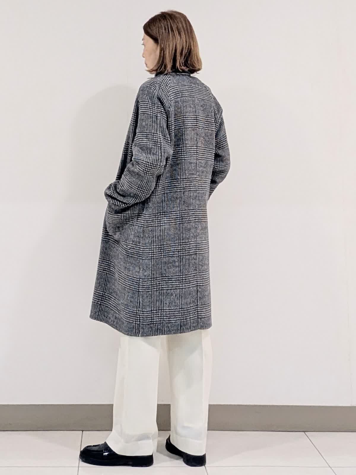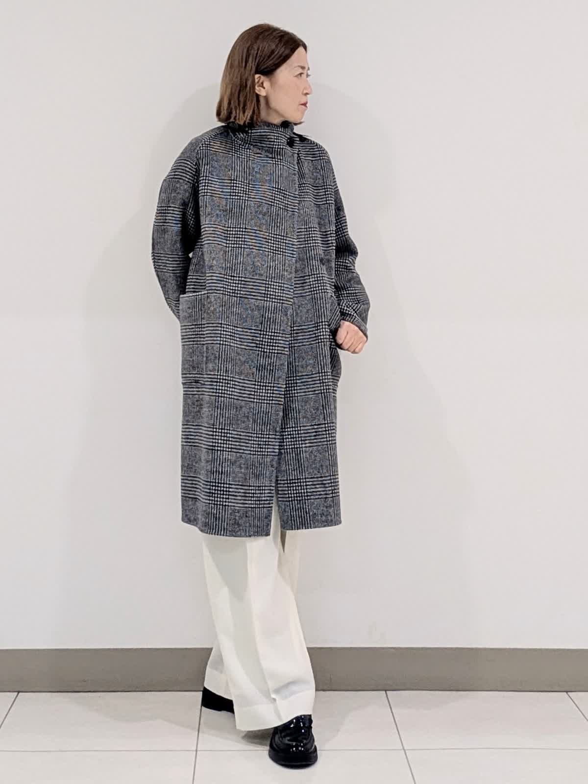 【着用サイズ9号】 おすすめのシャープなスタンドカラーコート。釦を閉じてスタンドカラー、開けても決まる2wayの襟デザイン。トレンドに左右されず、長くご愛用いただけるモデルです。 インナーには、ラクーンを贅沢にブレンドしたファーニットを。柔らかい毛足がポイントで1枚でもコーディネートのアクセントになるVネック。上品な大人ニットに仕上げています。 ボトムスは、ツータックデザインのストレートシルエットパンツを合わせました。オンオフ問わず活躍してくれる万能なアイテム◎ フラットシューズやスニーカーでも美脚になれるパンツです。