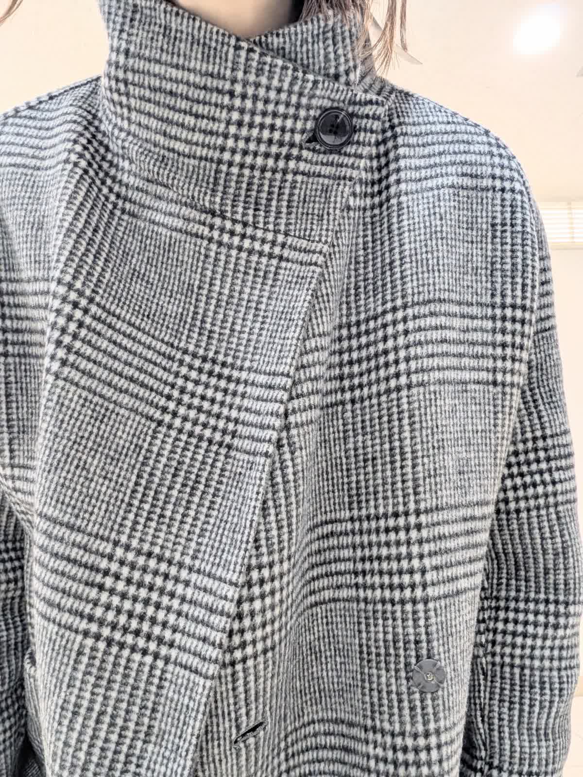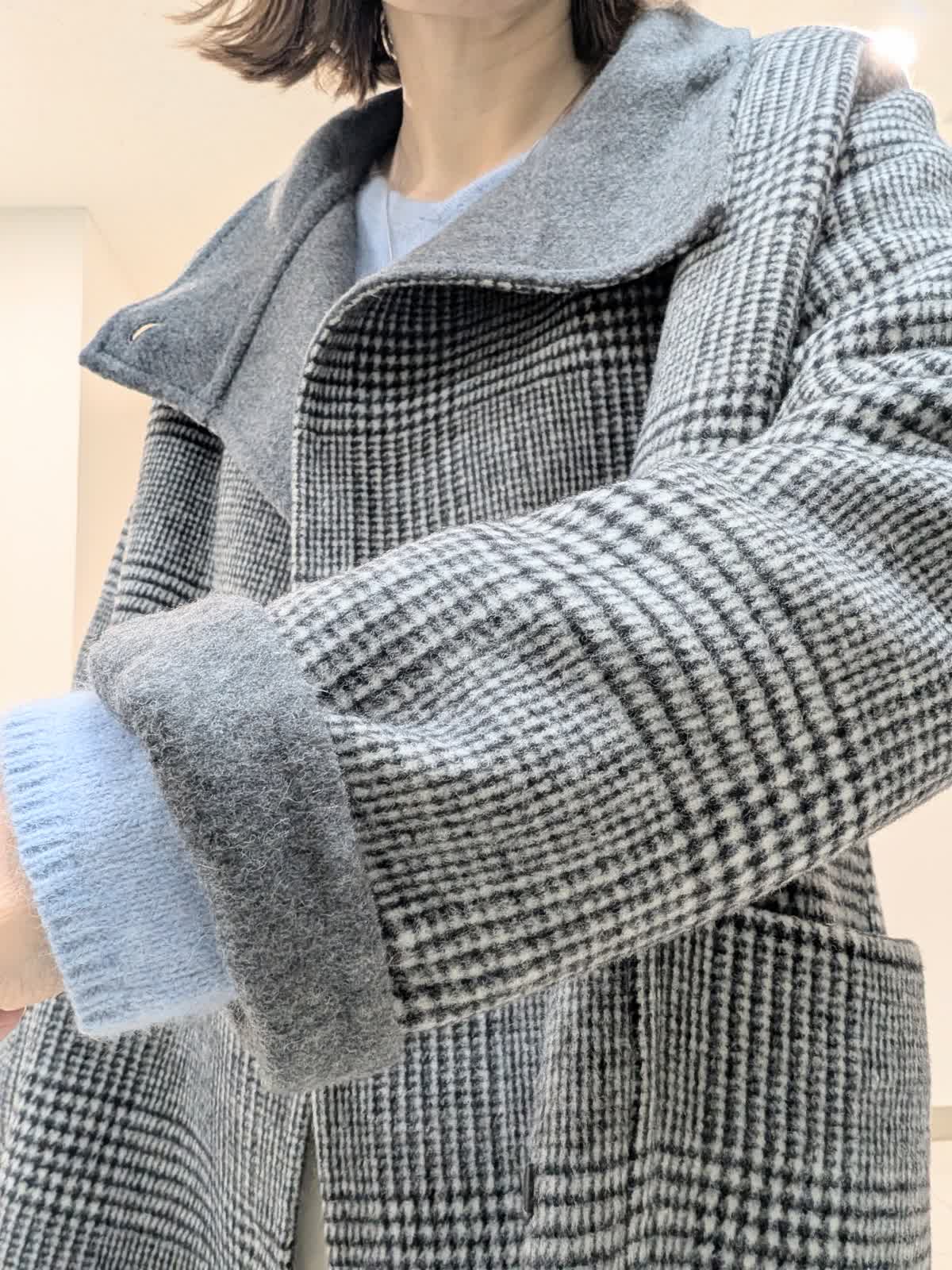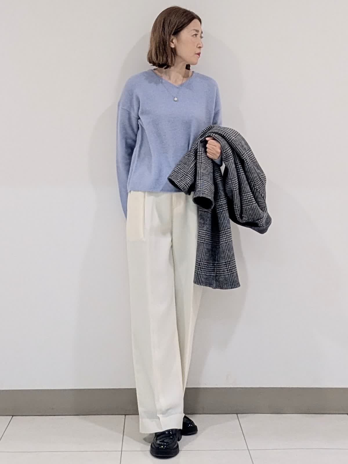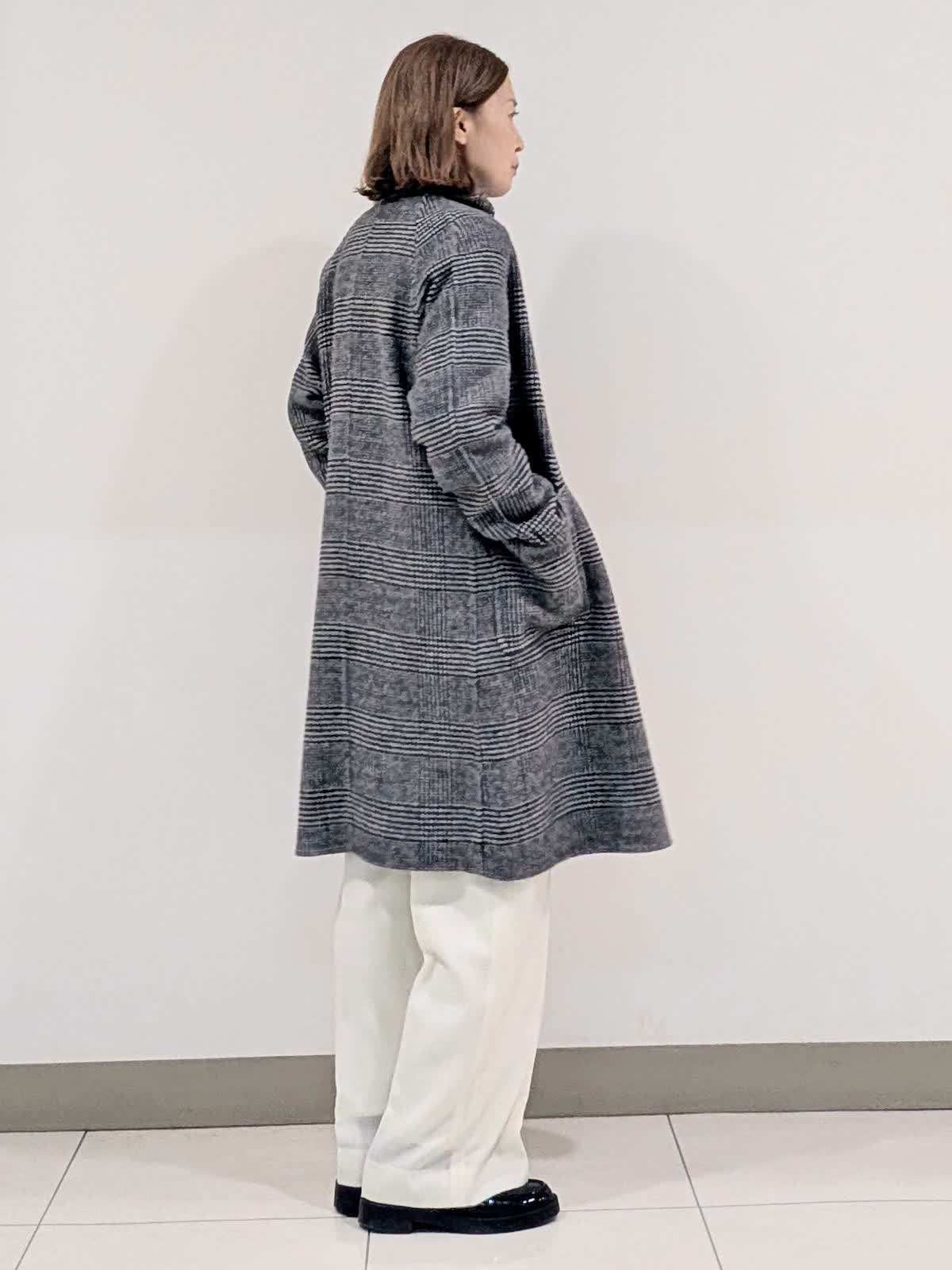 【着用サイズ9号】 おすすめのシャープなスタンドカラーコート。釦を閉じてスタンドカラー、開けても決まる2wayの襟デザイン。トレンドに左右されず、長くご愛用いただけるモデルです。 インナーには、ラクーンを贅沢にブレンドしたファーニットを。柔らかい毛足がポイントで1枚でもコーディネートのアクセントになるVネック。上品な大人ニットに仕上げています。 ボトムスは、ツータックデザインのストレートシルエットパンツを合わせました。オンオフ問わず活躍してくれる万能なアイテム◎ フラットシューズやスニーカーでも美脚になれるパンツです。